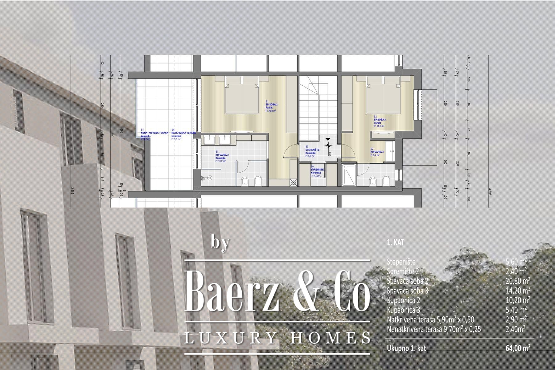 Modern terraced house Umag captures the essence of contemporary Mediterranean living just 300 meters from the Adriatic. This terraced house, with a living area of 181 m² on a 1,683 m² plot, offers open views and refined spatial design across three levels. Four bedrooms and four bathrooms are paired with a thoughtfully planned layout, including a spacious open-plan living room, kitchen, and dining area extending onto a covered terrace and garden space.