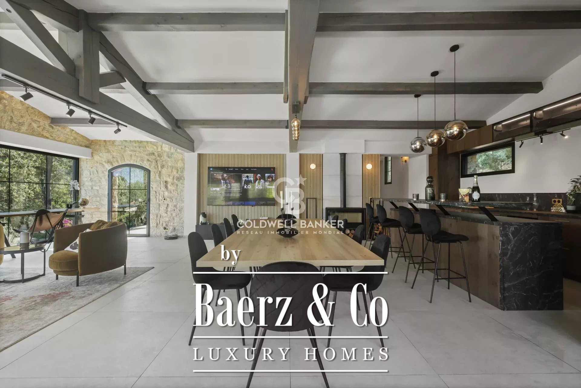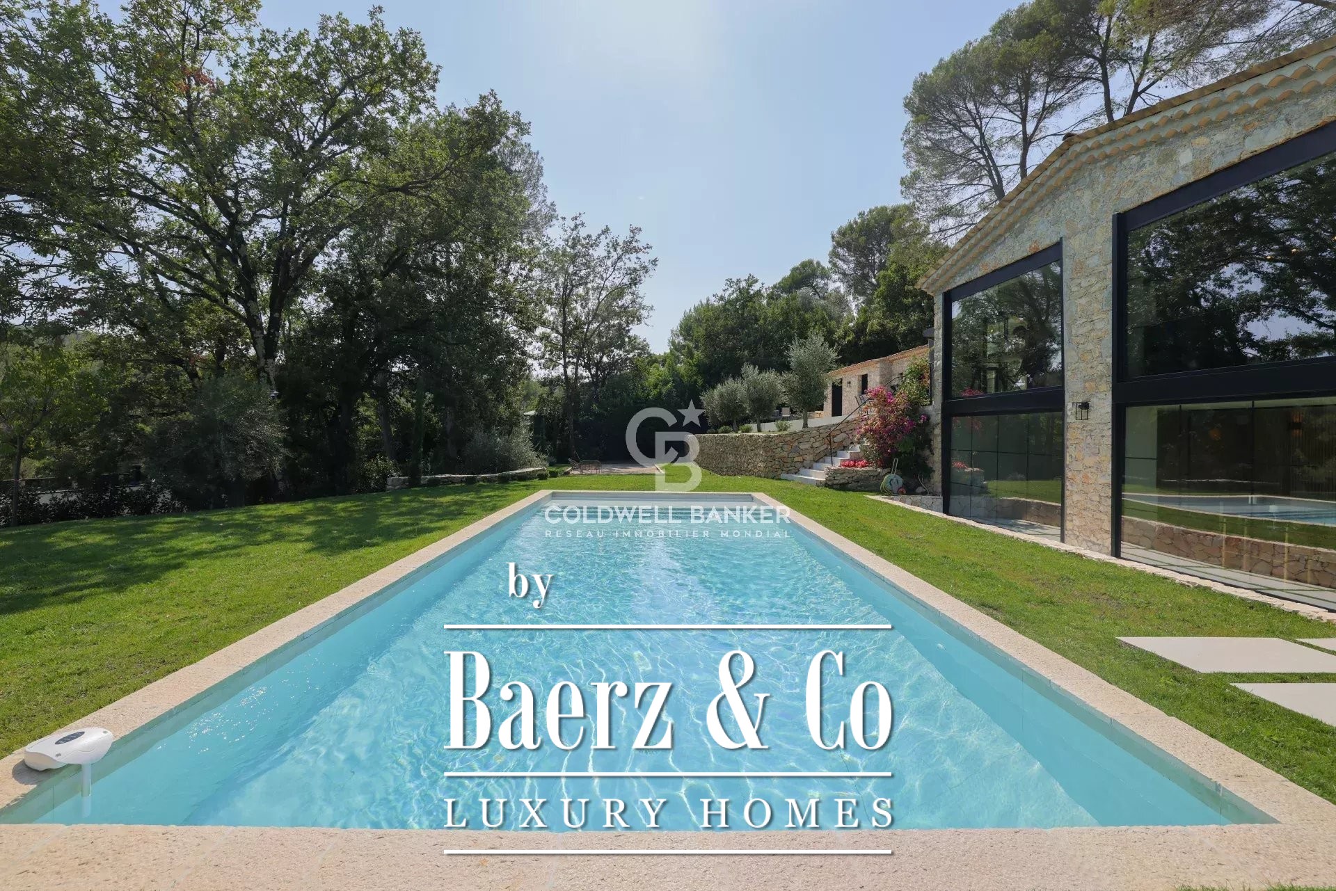 Pretty stone villa completely renovated located in a quiet area near the village of Valbonne. The house has an impressive living room with open kitchen, four bedrooms and three bathrooms/shower on the ground floor. On the garden level, the house also has a nice living room (converted into a screening room and