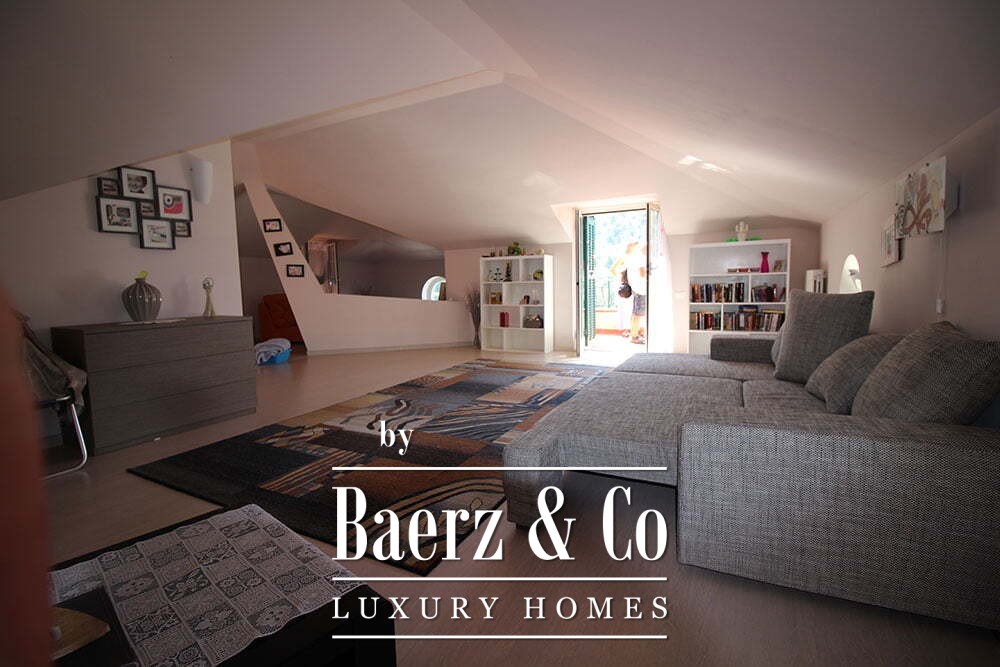 The first floor presents a spacious apartment with two bedrooms, two bathrooms, a well-lit living room and a large covered balcony where sweeping views capture the Mediterranean, the valley, and the Ligurian mountains. Ascend again and you encounter the third residence, complete with a large living room, kitchen, bedroom and bathroom, offering direct access to a substantial roof terrace—an ideal vantage for tranquil sunsets and uninterrupted panoramas.