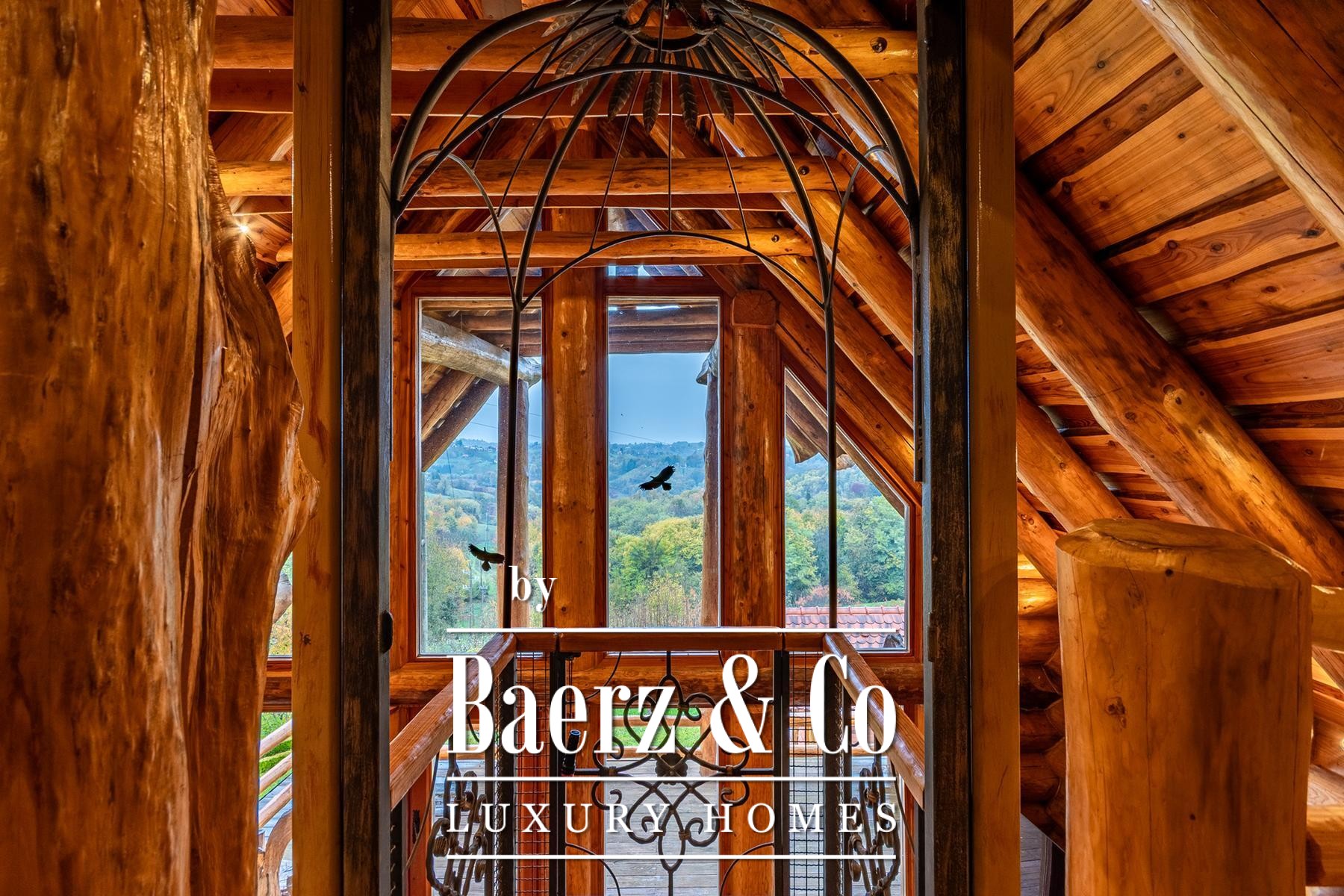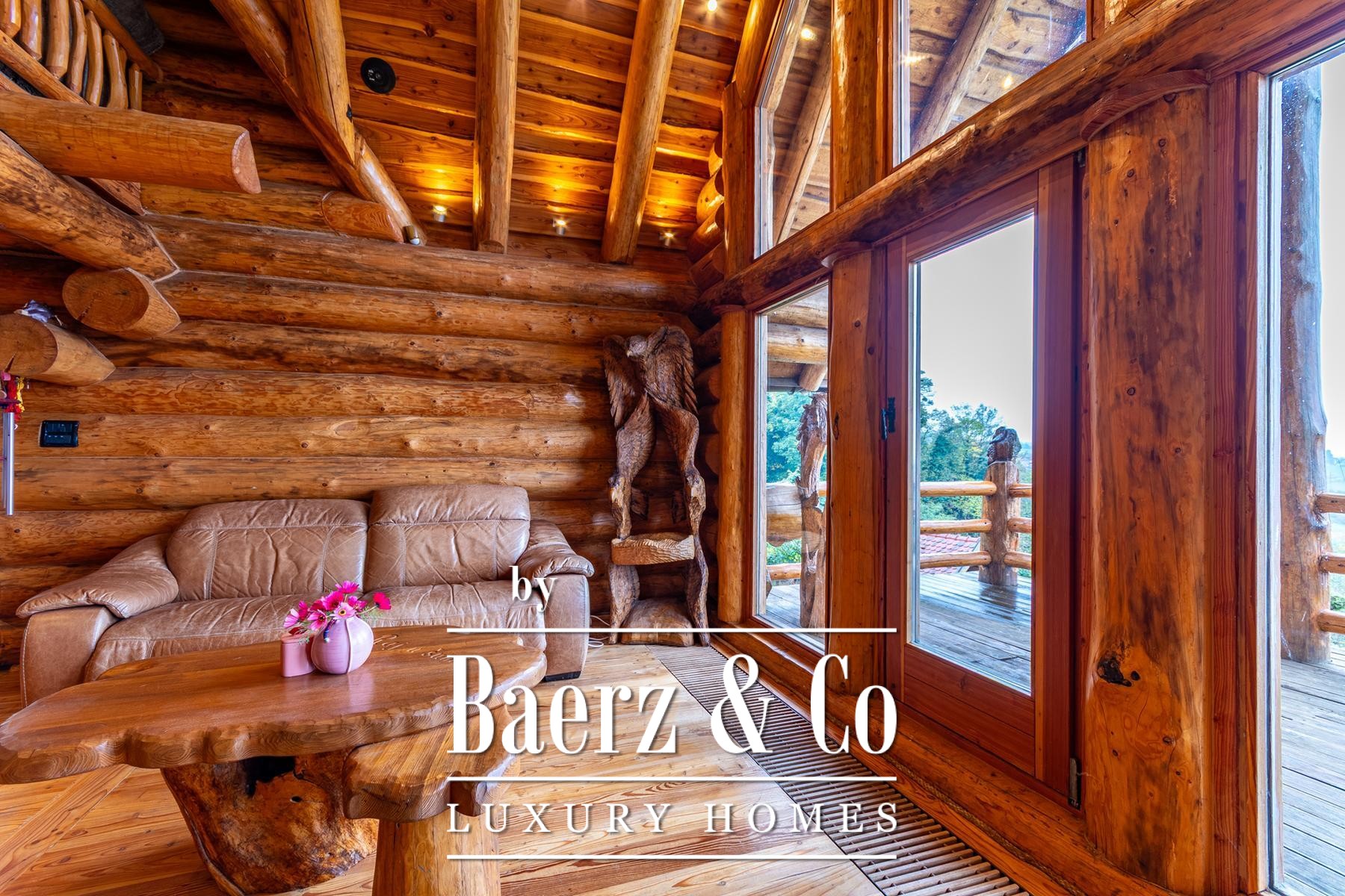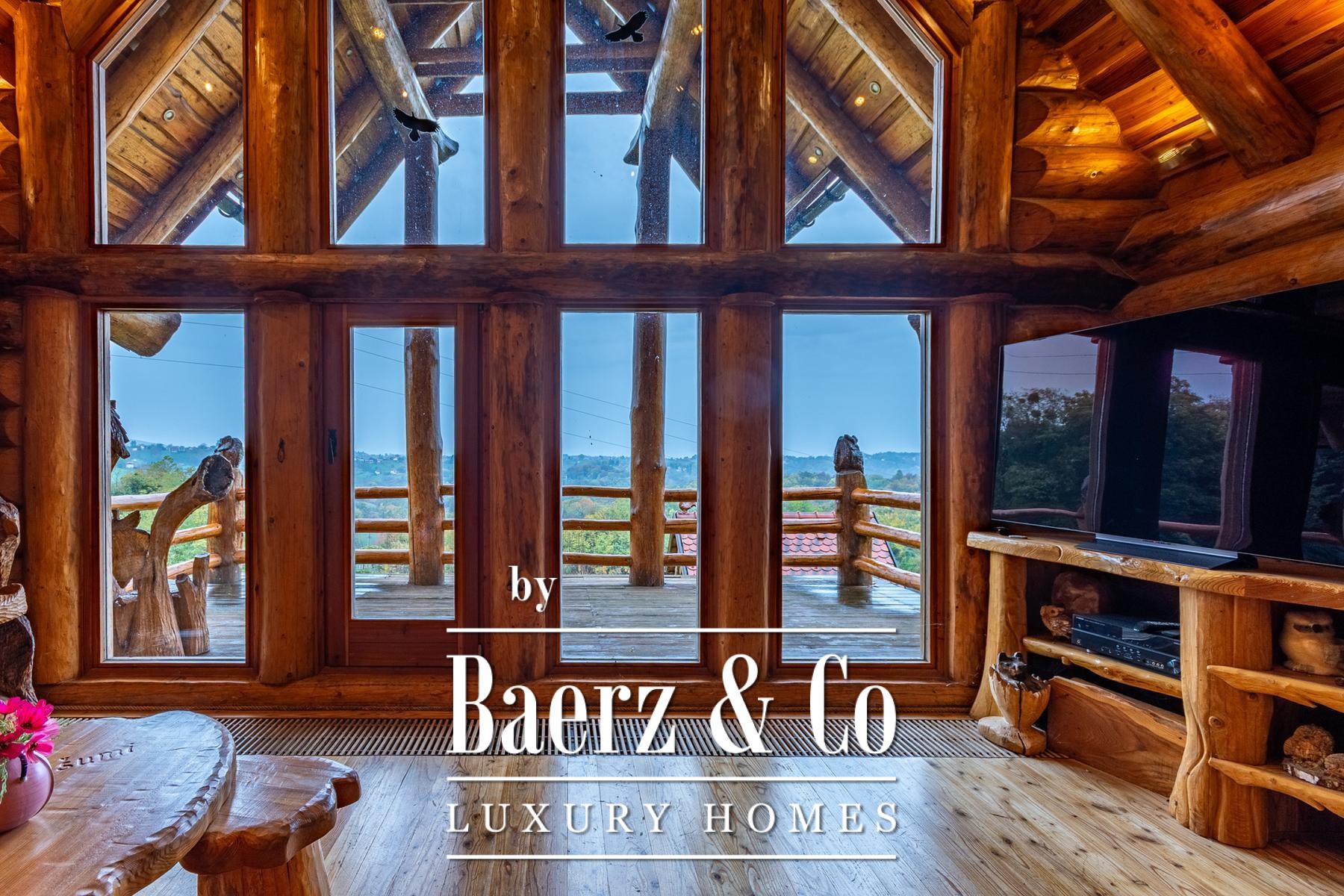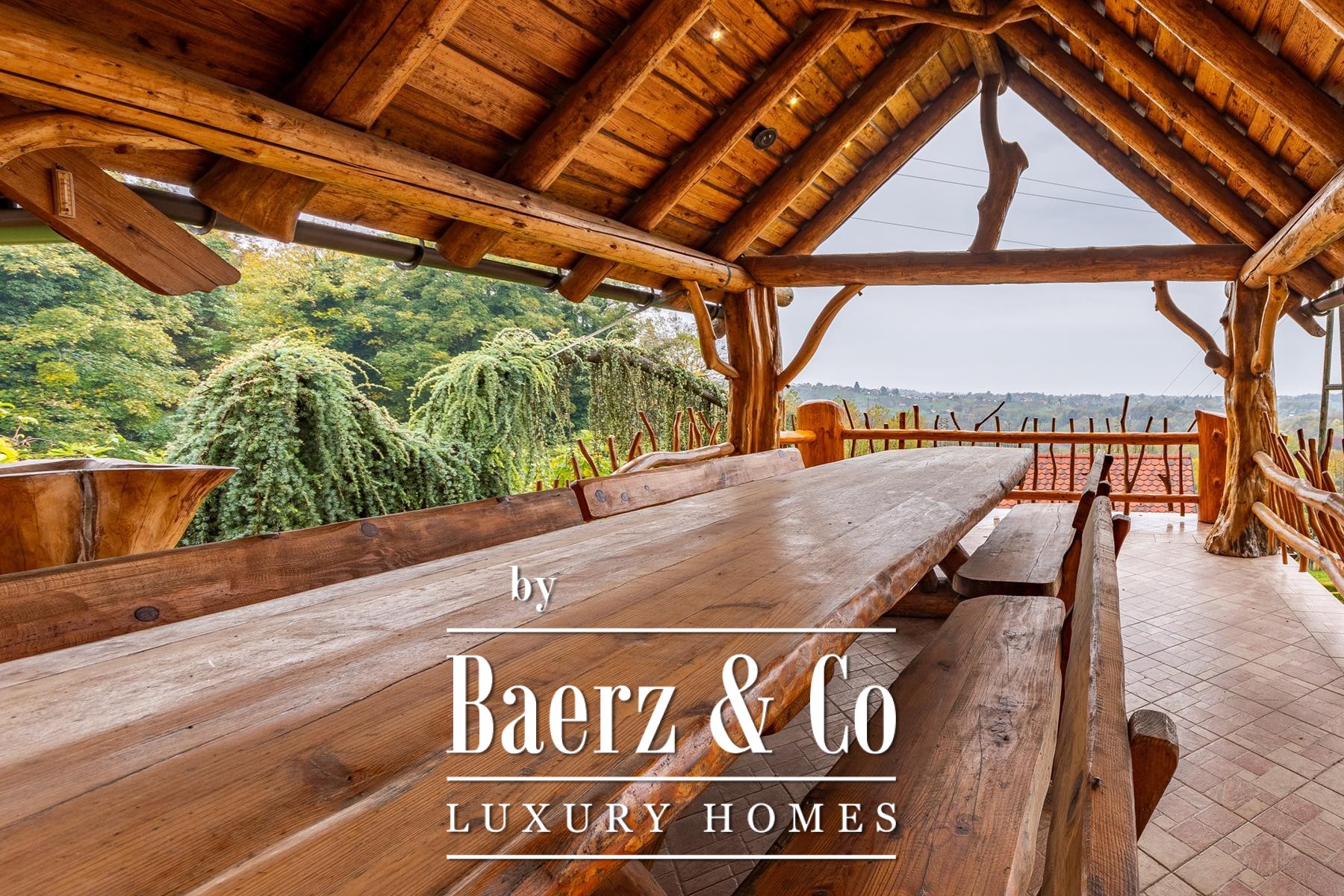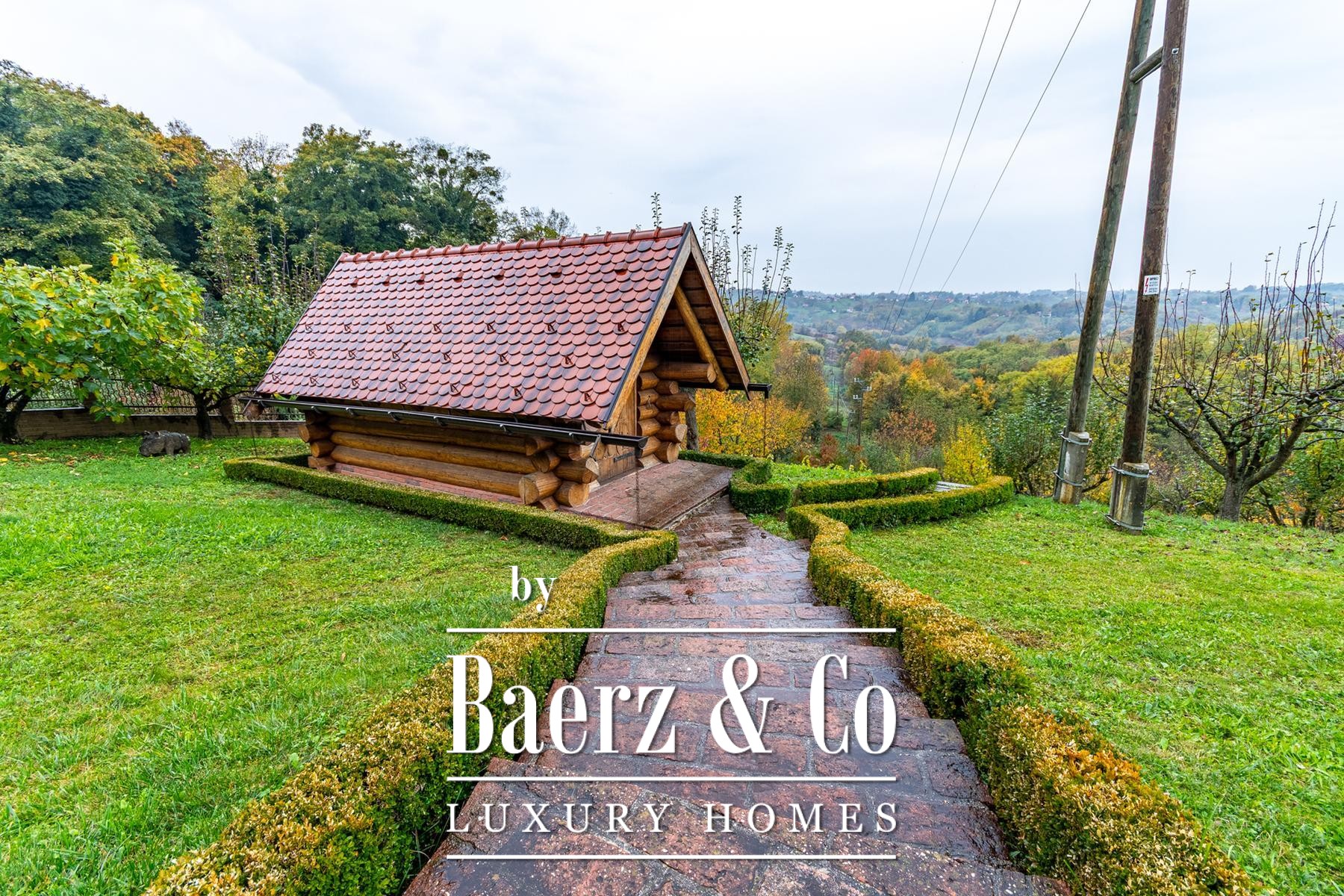 Three auxiliary buildings—a pavilion, workshop, and outdoor toilet—echo the authentic rural character. The grounds, meticulously curated with apple, plum, fig, aronia, and raspberry trees, offer spaces of contemplation and retreat. Panoramic views and deep privacy create a singular atmosphere. This is not simply a log house for sale in Varaždinske Toplice, but a considered retreat grounded in place and material.