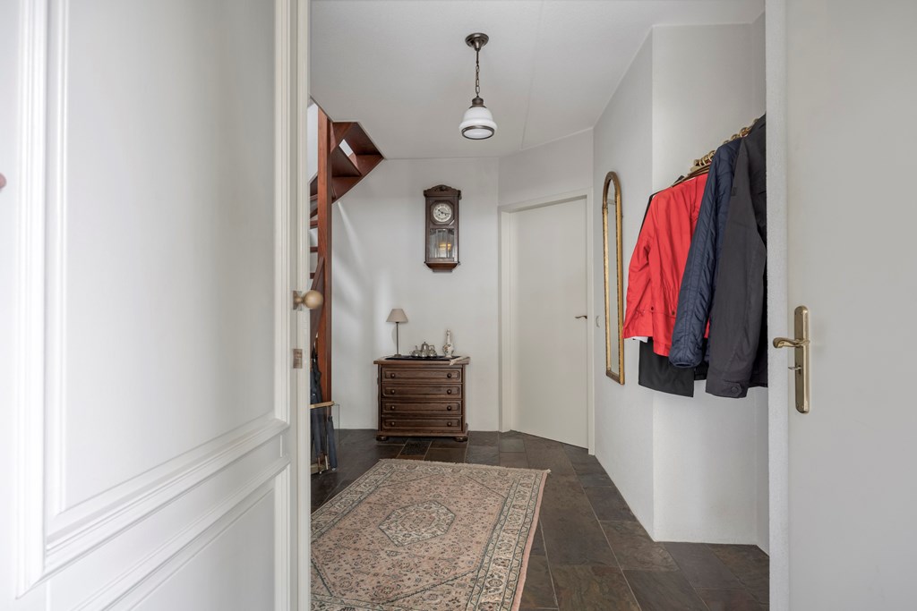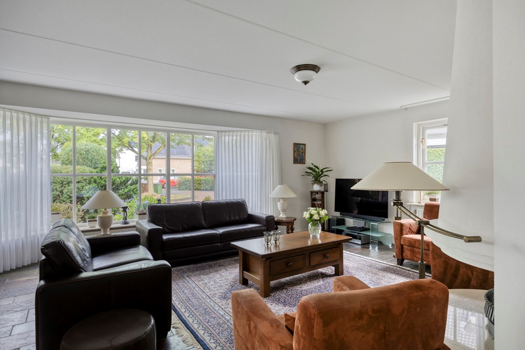 The garden all around is immaculately maintained. At the front, the wide driveway offers parking for multiple cars; under the carport your car is sheltered. From here you also have direct access to the garage, with overhead door and side door—a particularly spacious and multifunctional area of no less than 57 m². Ideal for daily use, safely storing bicycles, carrying out DIY projects, or setting up a large work or hobby room with its own entrance. The rear garden is a delight: a large sun terrace with decorative paving, manicured lawn, a pond, and borders full of color and variety. Thanks to mature hedges, trees, and the woodland to the rear, you’ll enjoy peace and privacy. Whether you want to have breakfast outdoors, read under the tree, or host guests on a summer evening—you can do it all here. With direct access from the living room, utility room, and garage, the garden is also extremely practical in layout.