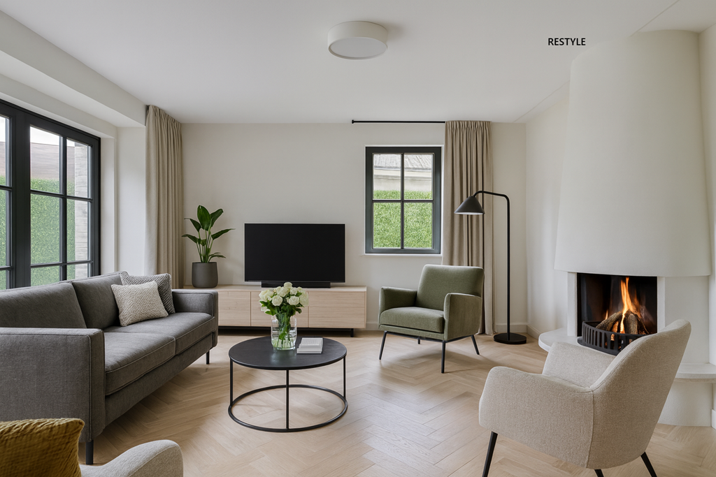 The inviting living room is notably bright thanks to the large bay window at the front and the wide side window. The seating area around the open fireplace offers a cozy spot for long evenings with family or friends. Toward the rear there is space for a large dining area next to the open kitchen. The kitchen features a U-shaped layout with a peninsula, cream-colored fronts, dark worktop, and full suite of built-in appliances: induction hob, slide-out extractor, combi-microwave, oven, fridge-freezer, and dishwasher. Adjoining is the practical utility room with laundry connections, storage, and a back door to the terrace. Finally, there is an additional room on the ground floor—ideal as a home office, hobby room, or playroom. From this room you have internal access to the bathroom—with shower, toilet, and washbasin—convenient for those wishing to live on one level or to host guests.