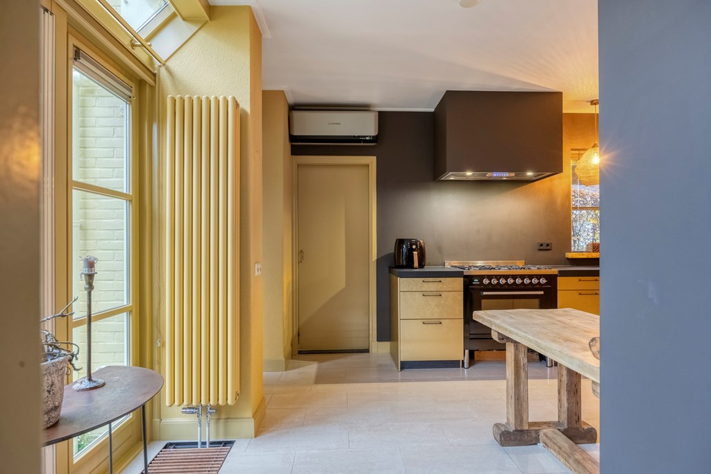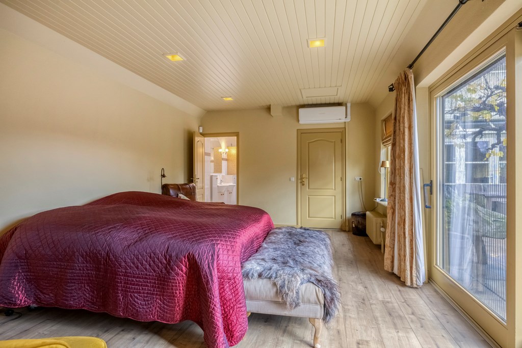 The live-in kitchen is modern and fitted with luxury appliances such as a large gas stove, a canopy extractor, dishwasher, fridge and freezer, air conditioning and a Quooker tap. Here you cook with a view of the garden, while natural light beautifully glides across the kitchen’s golden fronts. The conservatory and back garden can also be accessed via the kitchen. Adjacent, you reach on one side the practical utility room with laundry connections, and on the other a very spacious bedroom with an equally spacious walk-in closet and an en-suite bathroom. Sliding doors connect the bedroom to the garden, and the garden can also be easily reached via the walk-in closet. The generous bathroom features light tiling and a skylight, a whirlpool bath, double vanity, walk-in shower, wall-hung toilet and plenty of storage space.