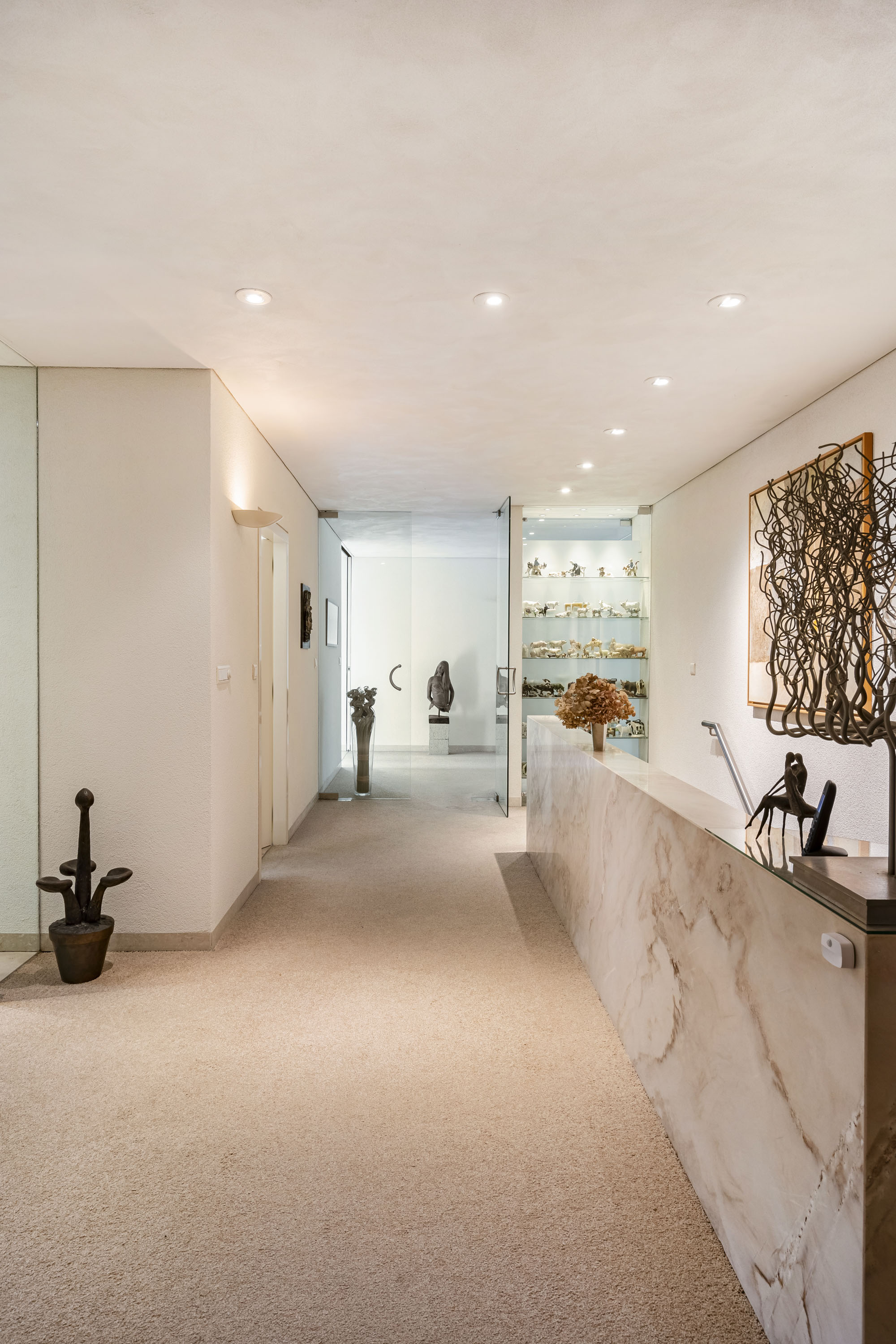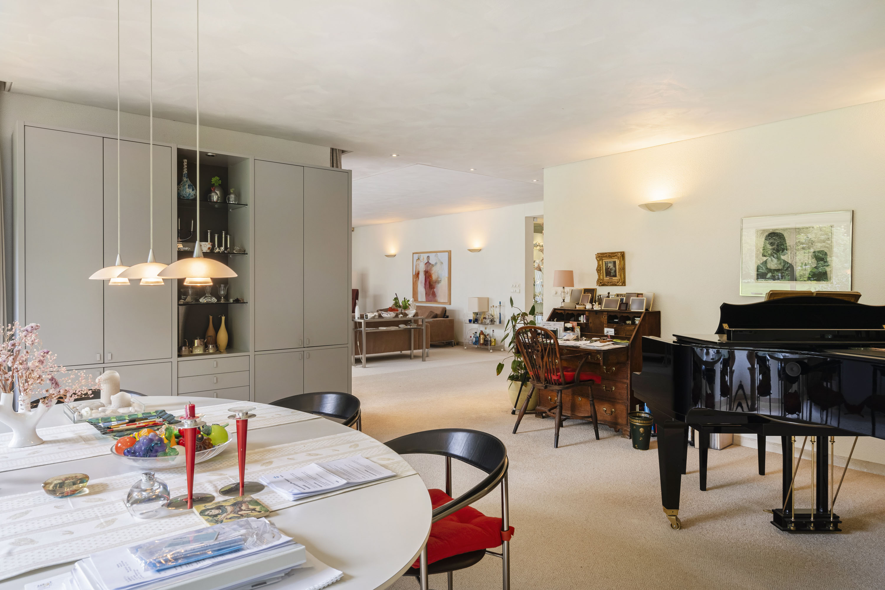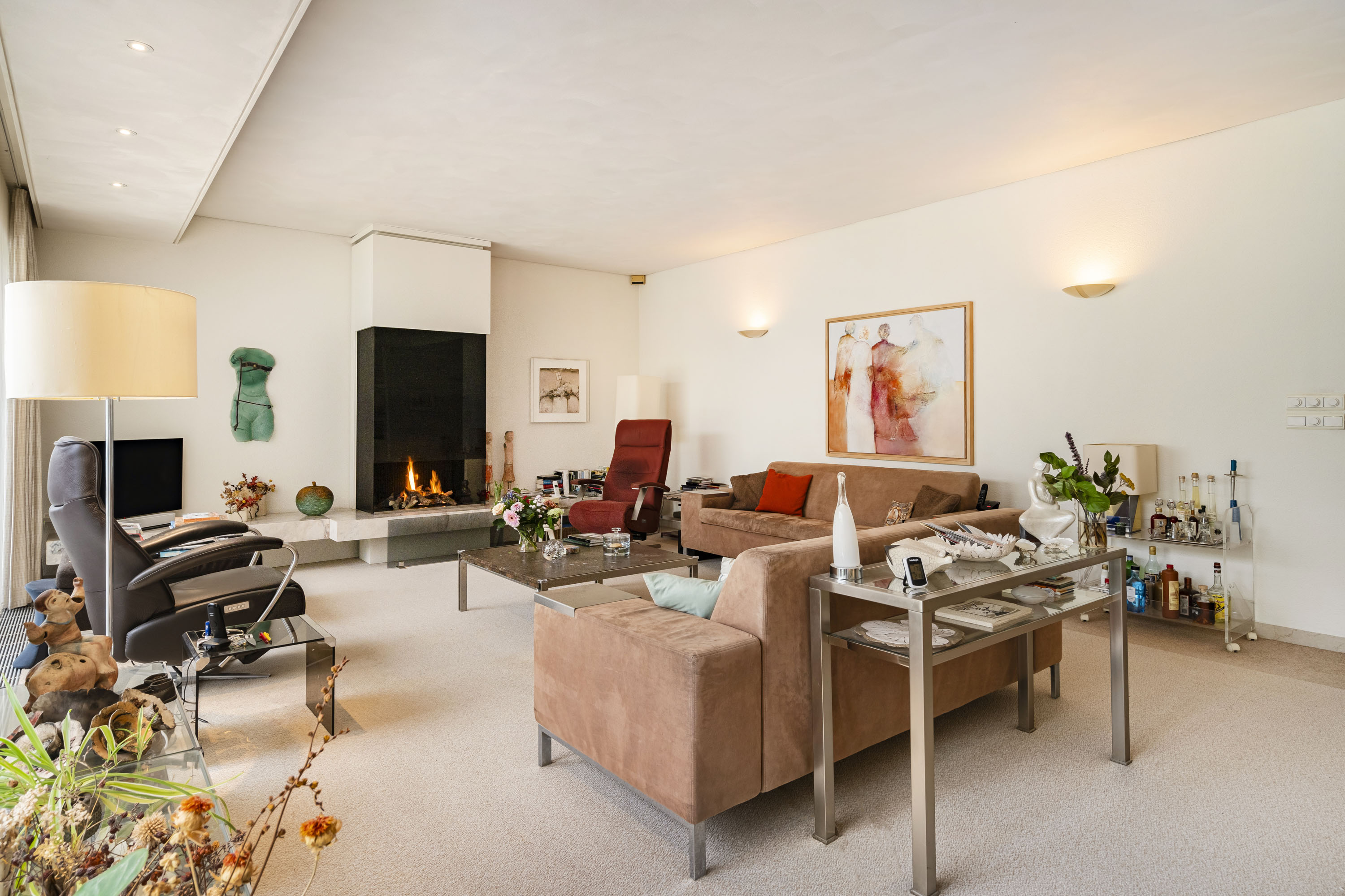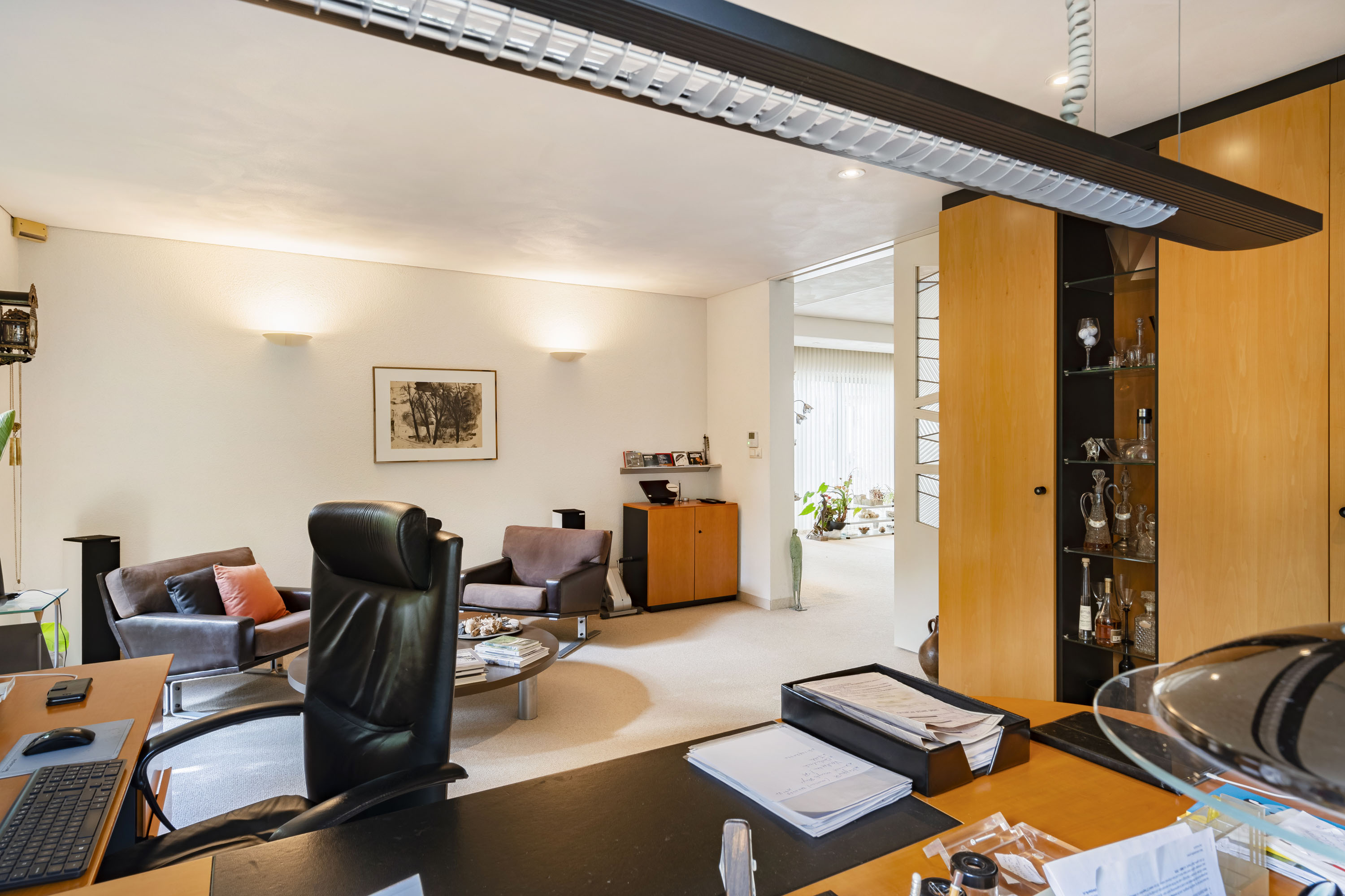Moving further into the home, you enter the exceptionally large living area. The lounge features a full-width glass façade, offering breathtaking views of the garden. The open-plan kitchen is connected to a utility room, which includes a dumbwaiter from the basement. The dining room is located on the garden side, and in between lies a spacious study. All of these areas flow openly into each other, while the study and kitchen can be closed off with elegant sliding doors. The large covered terrace, accessible from the living room through sliding doors, features an electric retractable roof and sunshade.