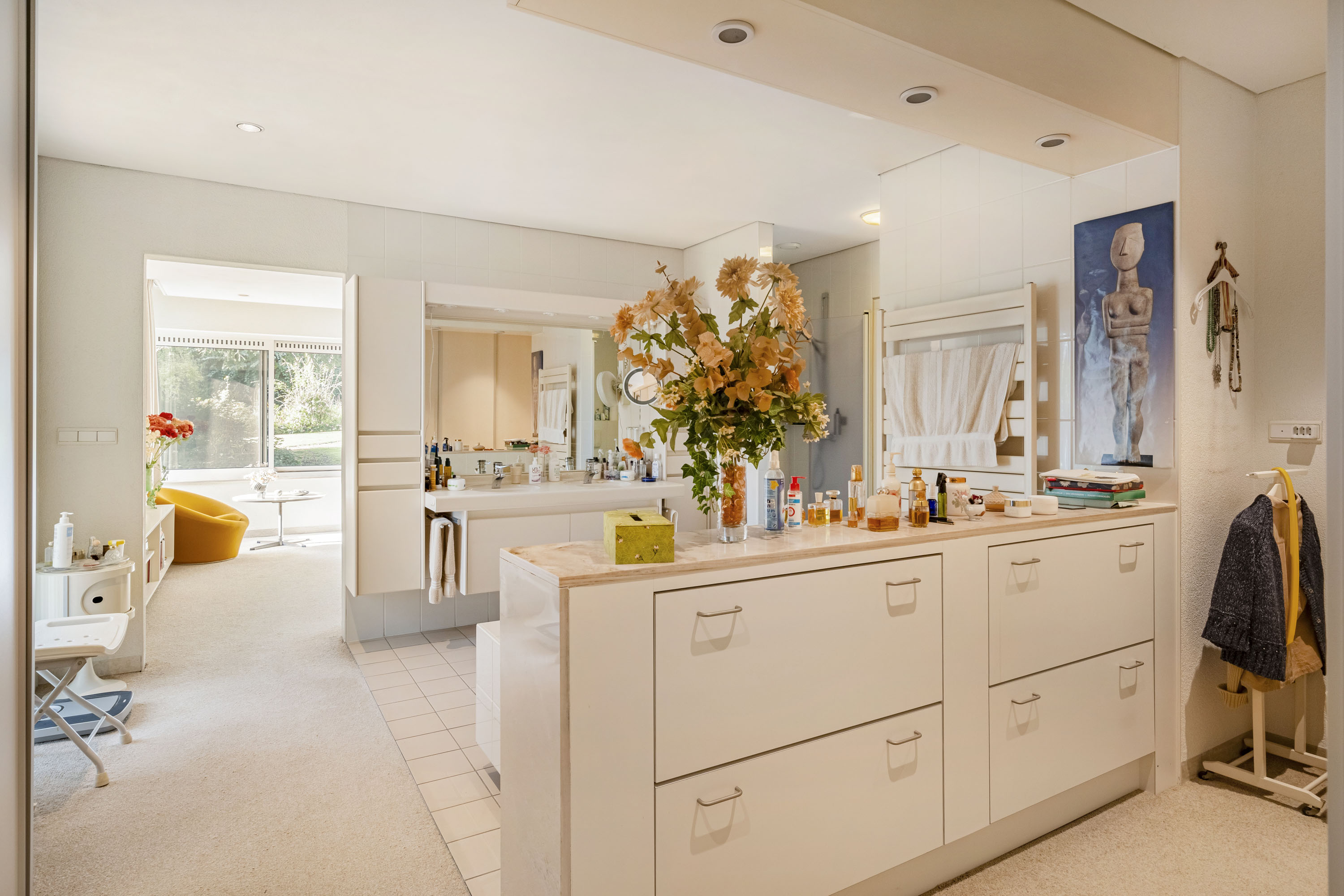 The bathrooms are equipped with a washbasin and shower, while the main bathroom includes a bathtub and a second toilet. The master bedroom, located on the garden side of the house, includes ample closet space and air conditioning.