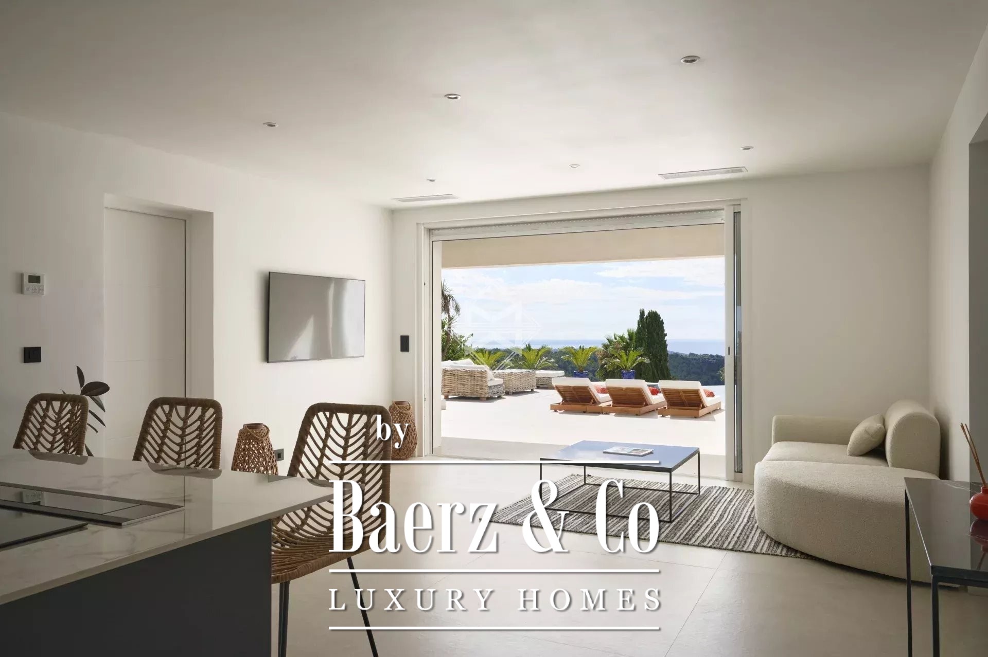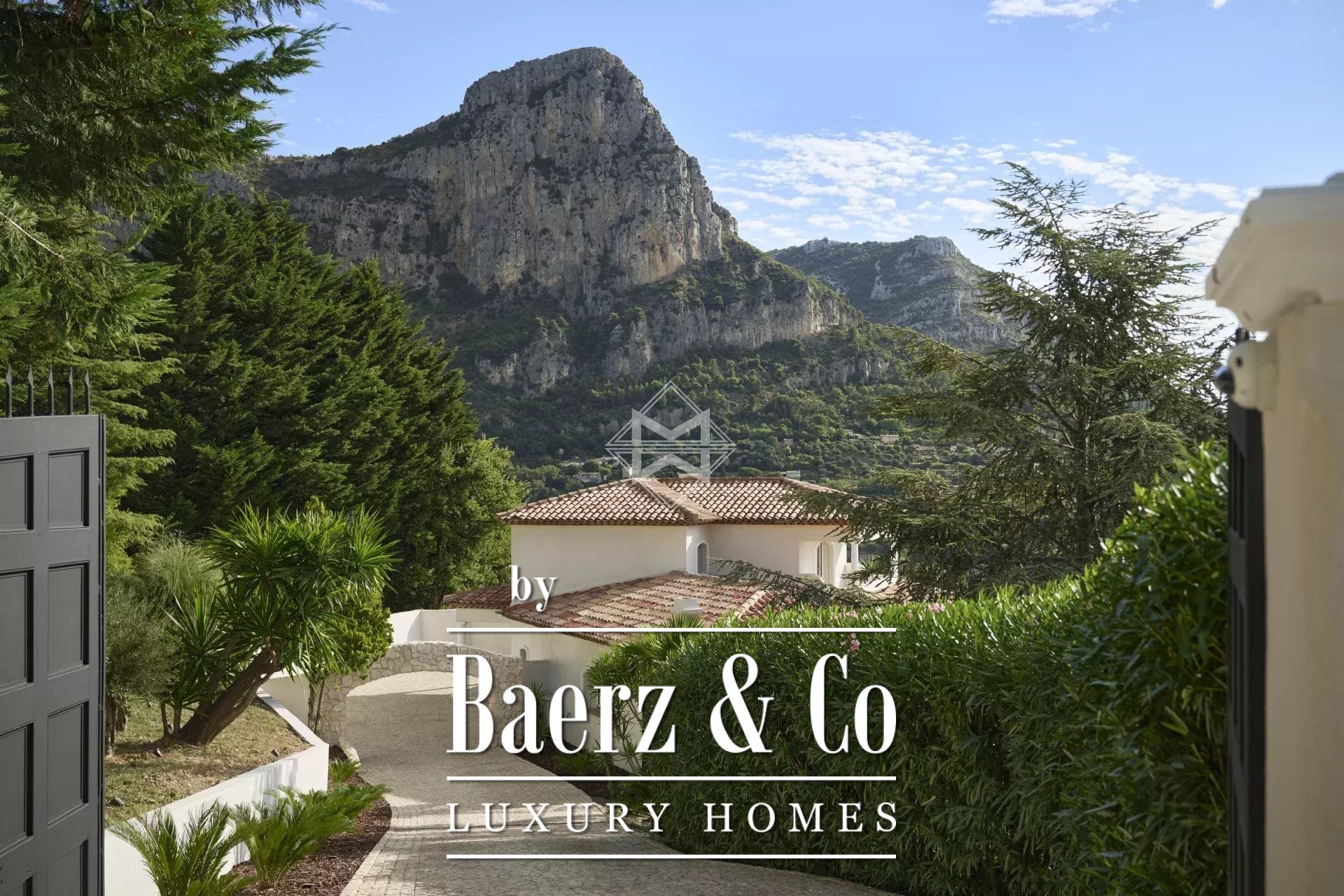 Located in one of the most sought-after areas of Vence, in a commanding position, L'Hacienda stands on a preserved hillside and offers an exceptional panorama: the Mediterranean stretching as far as the eye can see, from Cap Ferrat to Cap d'Antibes, with the majestic Baou de Saint-Jeannet as a backdrop. Completely renovated in 2025 with elegance and refinement, the 260 m² villa, bathed in light, is spread over three levels. On the ground floor, a beautiful entrance hall leads to a large living room opening onto a terrace facing the sea, extended by a dining room and a spacious kitchen. Two bedrooms, a bathroom, a cloakroom, a laundry room, and a guest