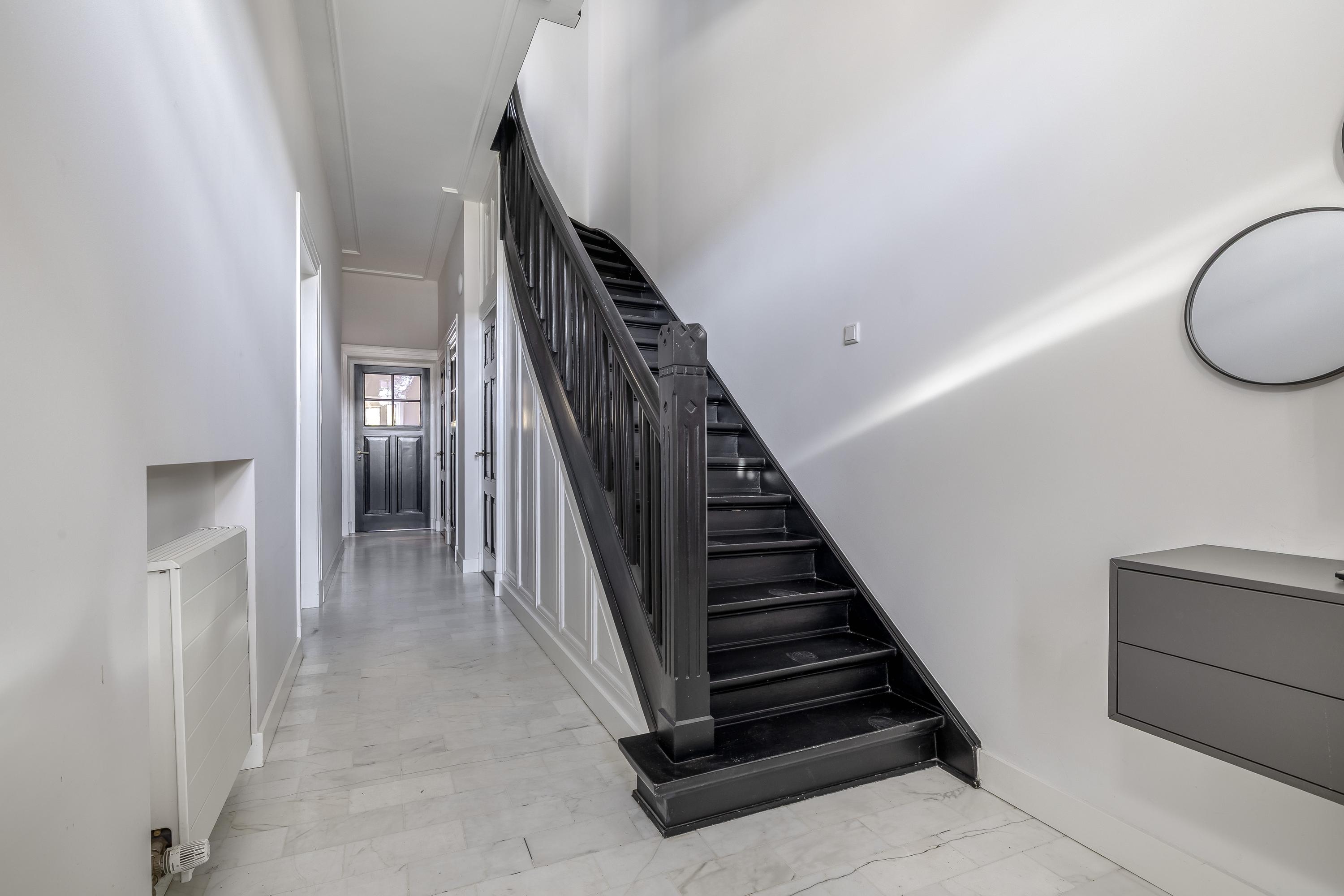 The deep and wide living room is fitted with extra-wide French oak herringbone parquet flooring. The impressive high ceiling features original ornaments and cornices with integrated dimmable lighting. At the front, you enjoy unobstructed views of the Rosarium. A gas fireplace adds extra ambience, while the air conditioning provides both cooling and heating. Due to the raised position of the windows relative to the pavement, there is no visibility from outside. At the rear, French doors open directly onto the garden.