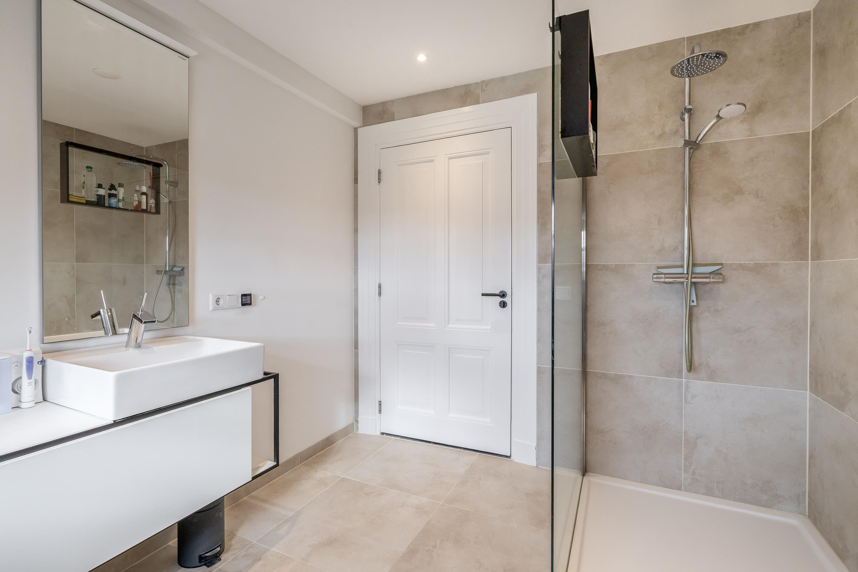 The large, high-quality bathroom (renovated in 2025) features a spacious walk-in shower with sunshower, toilet, double washbasin unit, designer radiator and mechanical ventilation. The tiled floor includes electric underfloor heating.