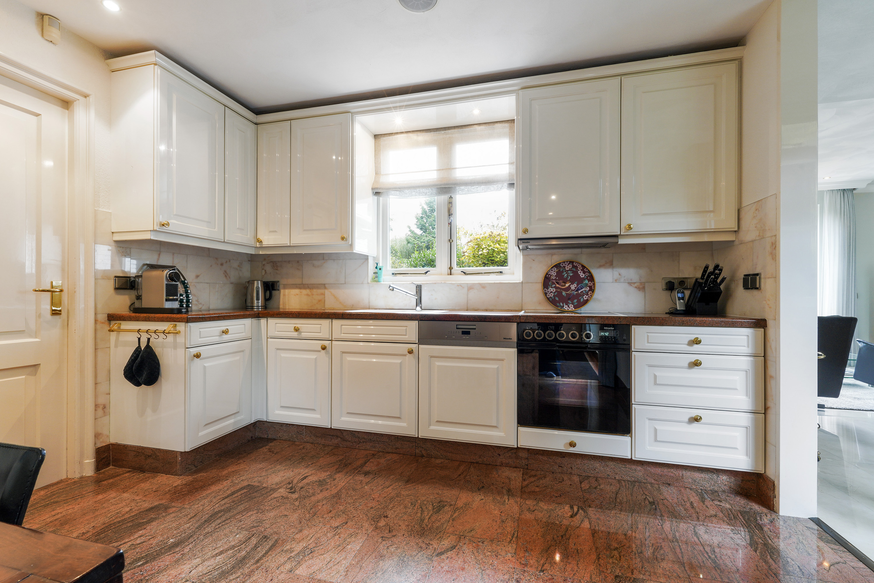 Upon entering, the spatial arrangement immediately conveys a sense of light and openness. An expansive ground floor, around 70 m², flows effortlessly from sitting area to dining space and open-plan kitchen, all bathed in natural light from large windows. Materials such as travertine flooring and light-toned walls set a restrained, sophisticated tone. The kitchen is expertly appointed, complemented by a natural stone worktop and integrated appliances, while a practical utility room and a 17 m² storage area address daily needs with quiet efficiency. Additional storage and a dedicated cellar space offer further versatility, whether for provisions or a wine collection.