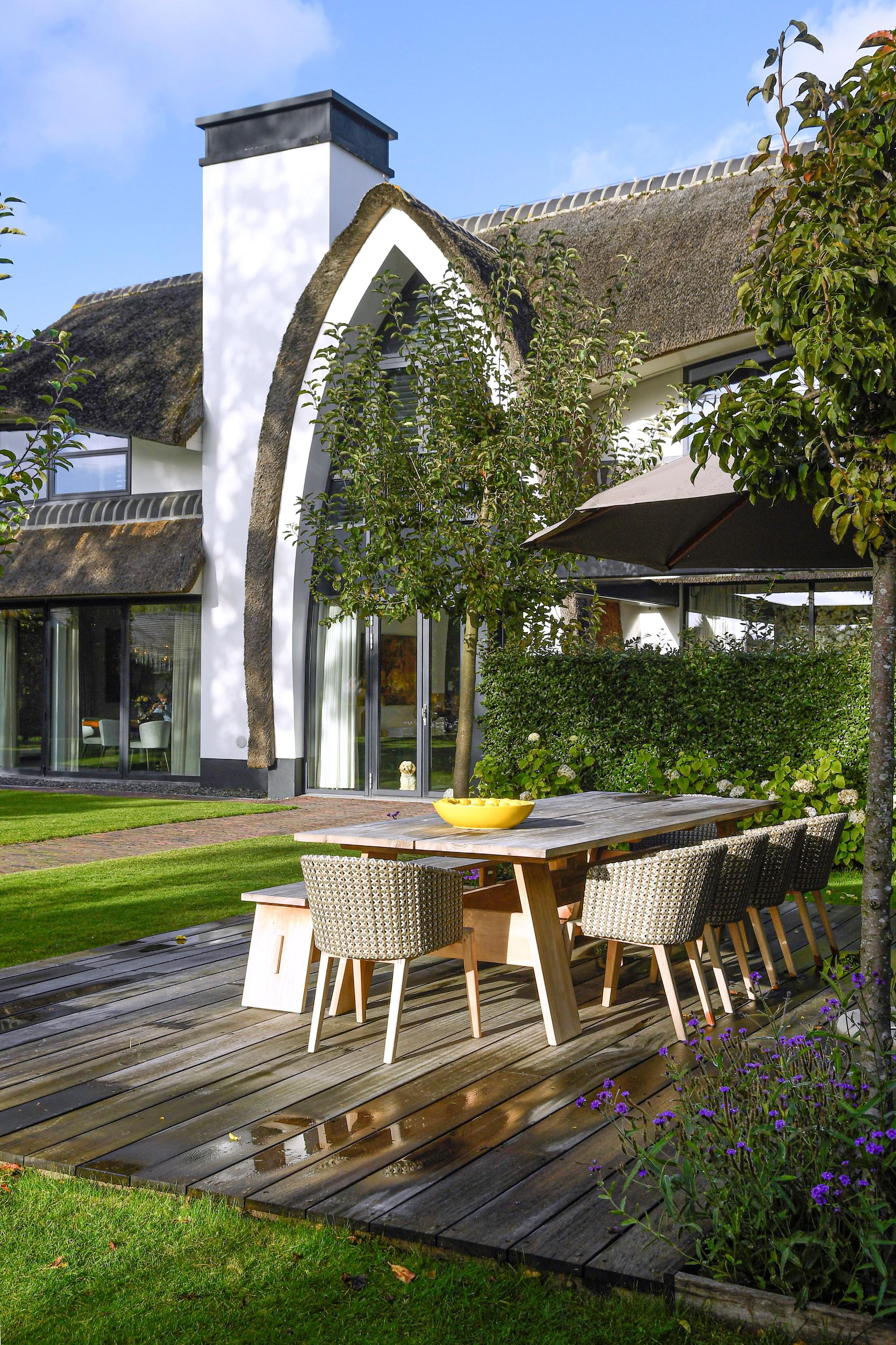 Gardens designed by a landscape architect frame terraces and a 53 m² boathouse with remote-controlled lift, enabling private access to Dutch waterways. An adjacent covered veranda with wood-burning fireplace allows year-round enjoyment outdoors.