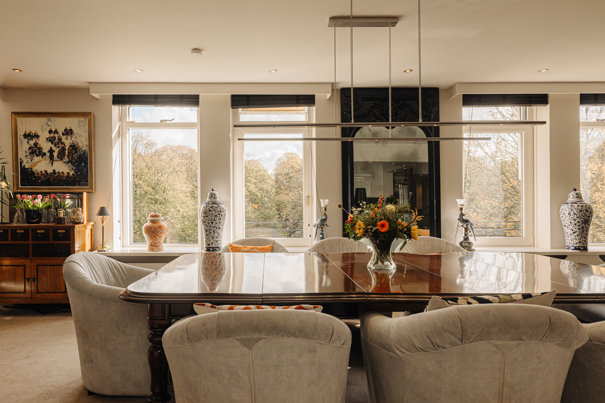 Ruime woonkamer (drie samengetrokken kamers) met gashaard, grote raampartijen en daardoor prachtig uitzicht. Twee balkons omringd door groen.