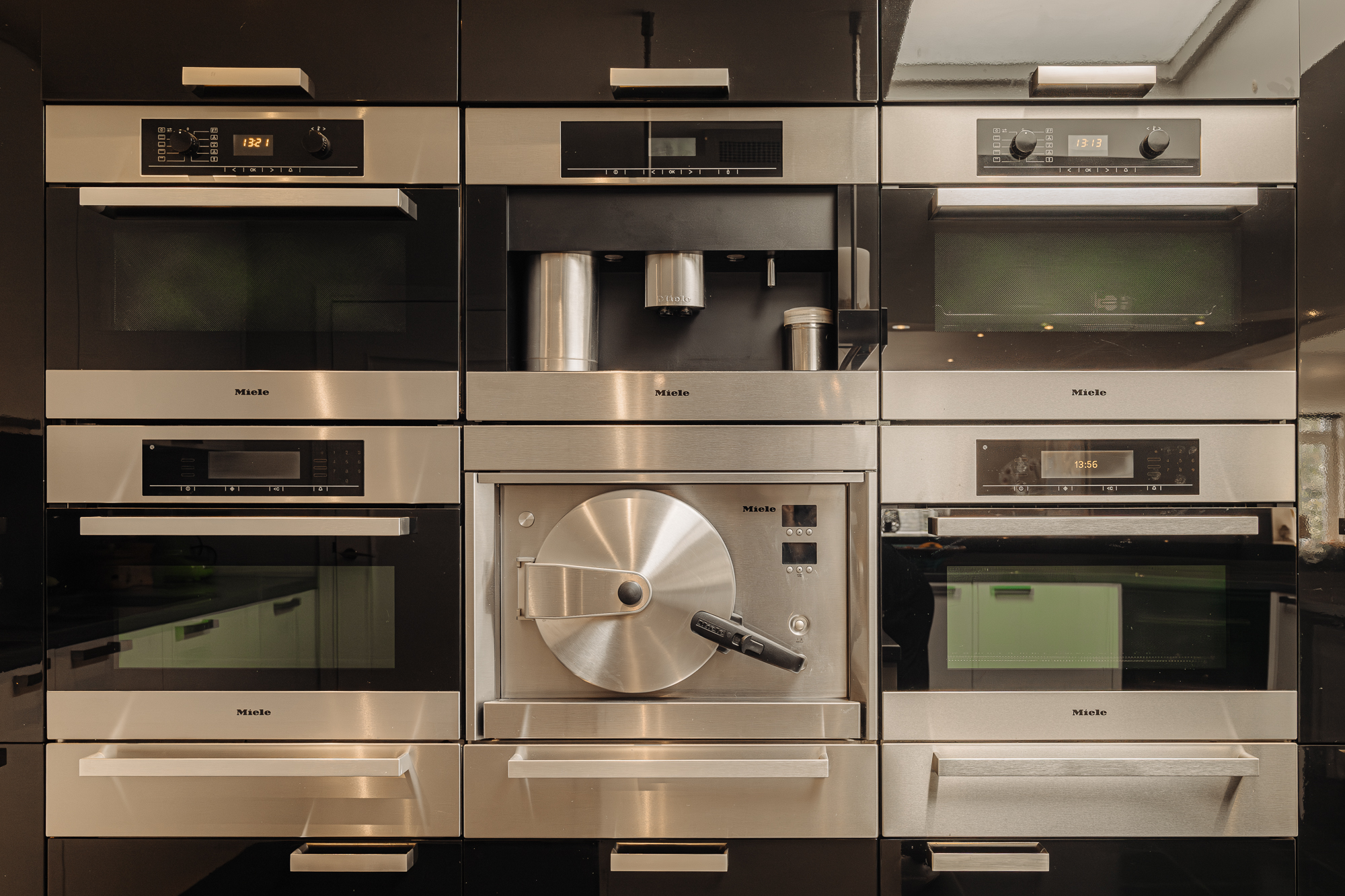 Halfopen designkeuken voorzien van hoogwaardige Miele-apparatuur, waaronder twee ovens en wijnklimaatkasten en een grote bar.