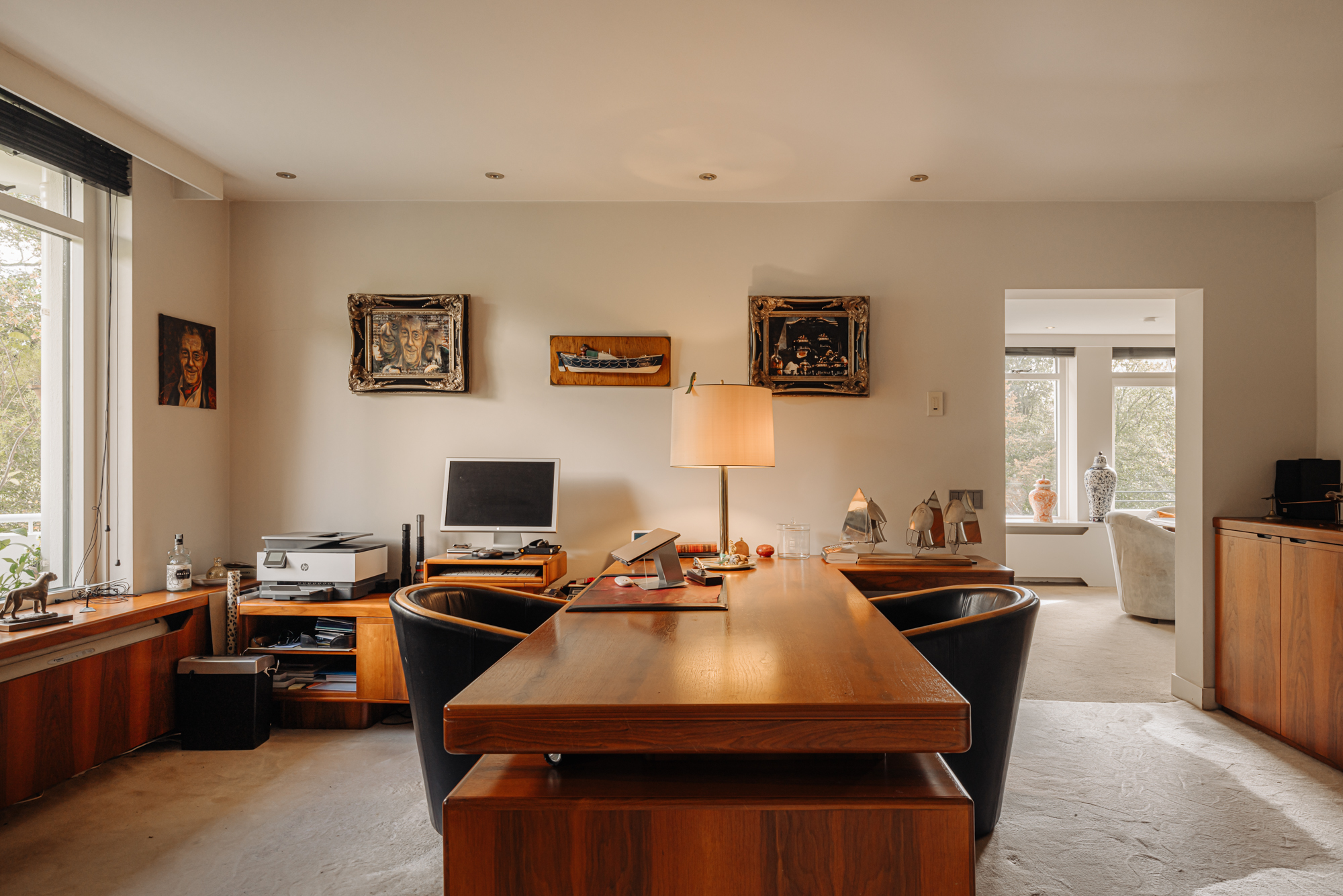 Aparte wasruimte en een aparte berging op de gang. Stijlvolle werkkamer met notenhouten kasten en bureau.