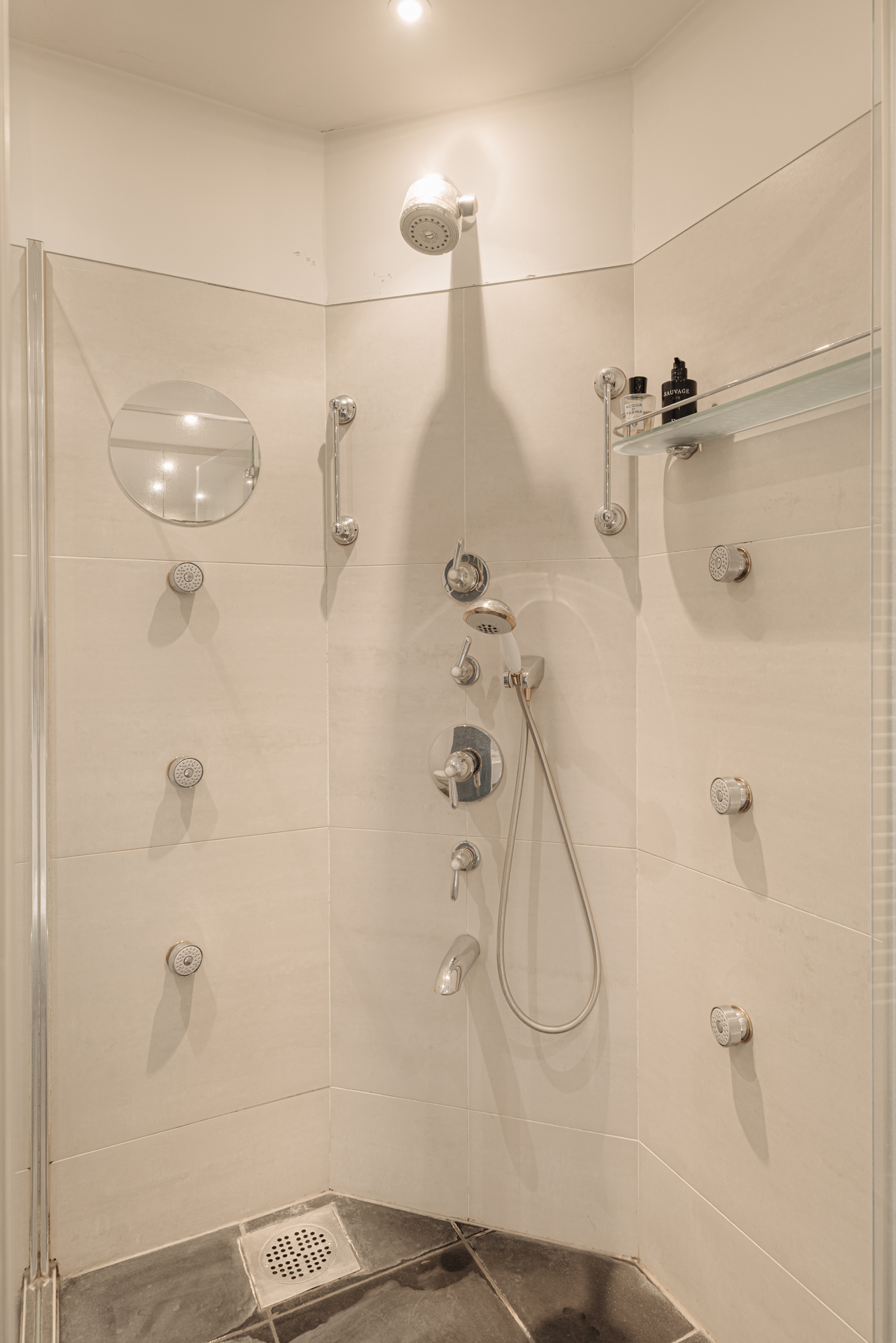 Hoofdslaapkamer aan de achterzijde ensuite badkamer met een stoomdouche, royaal ligbad en een dubbele wastafel. De tweede slaapkamer aan de voorzijde heeft ook een eigen badkamer.
