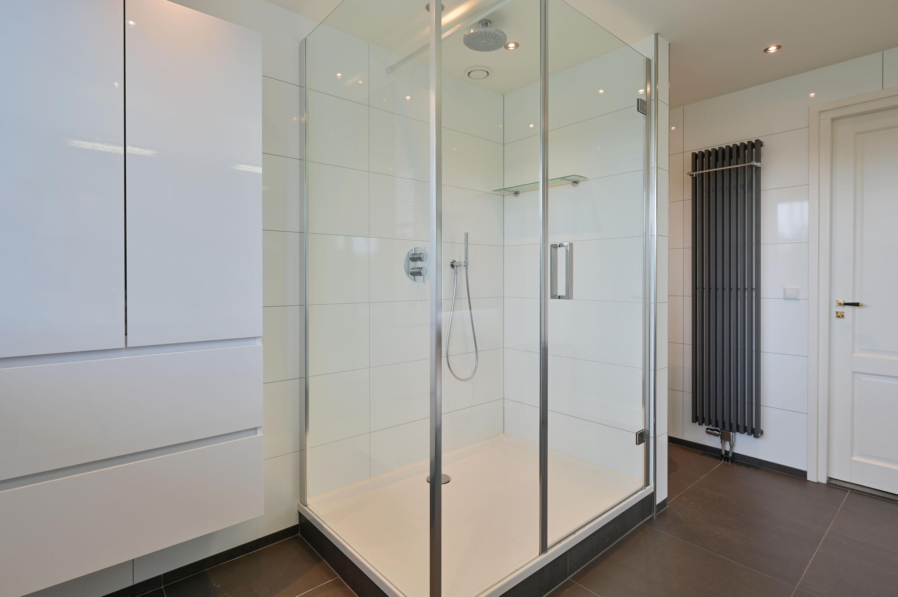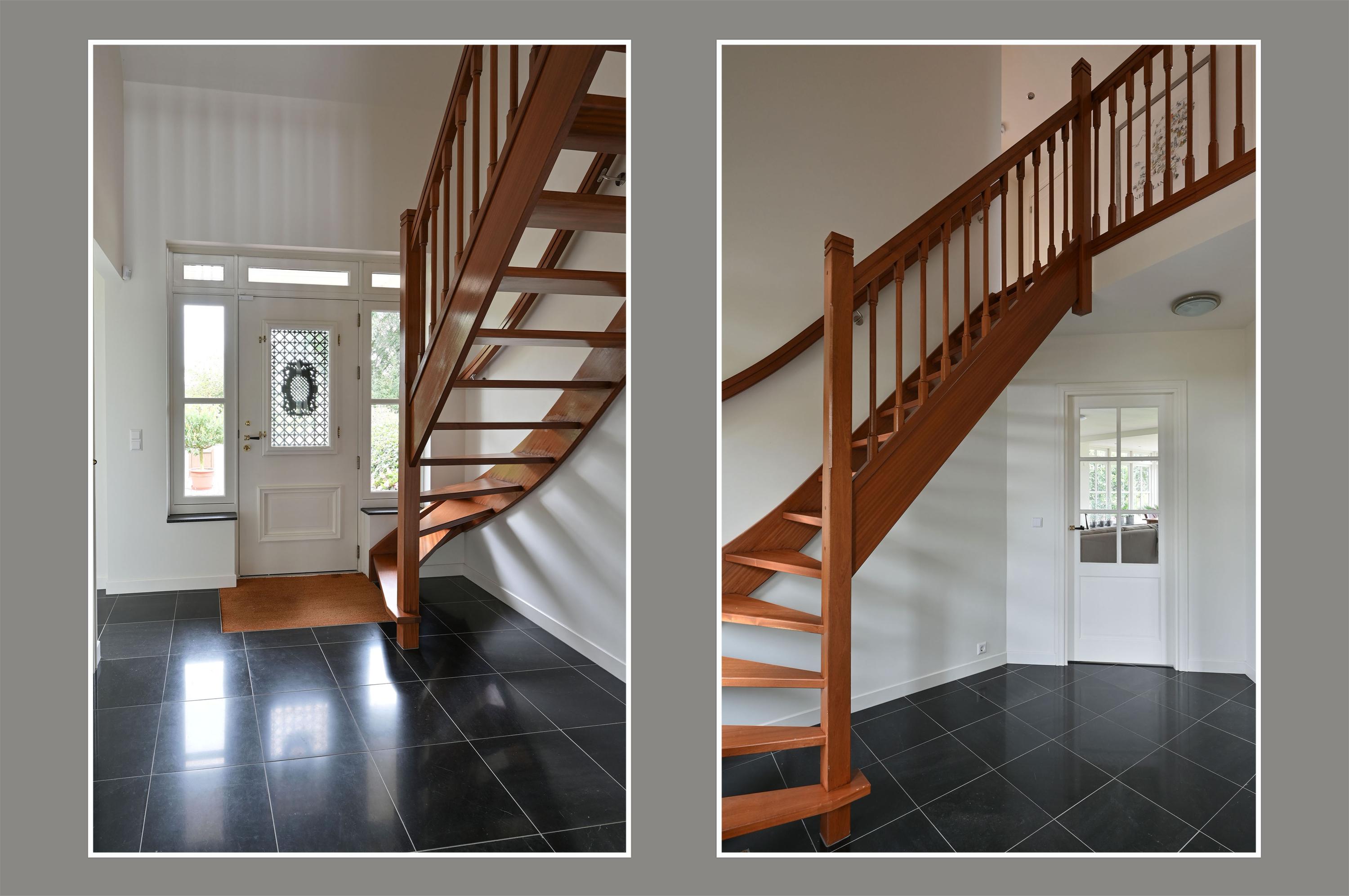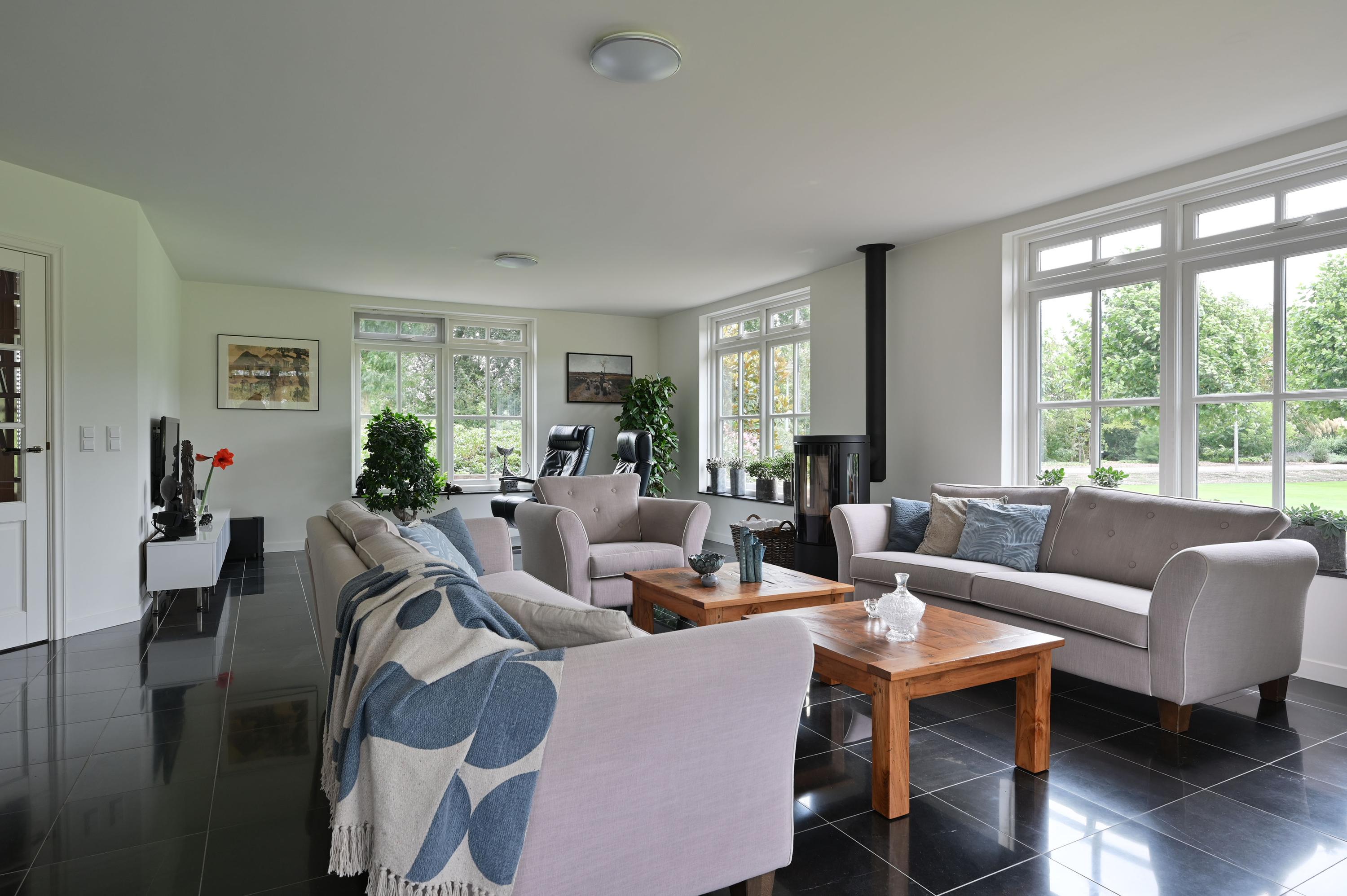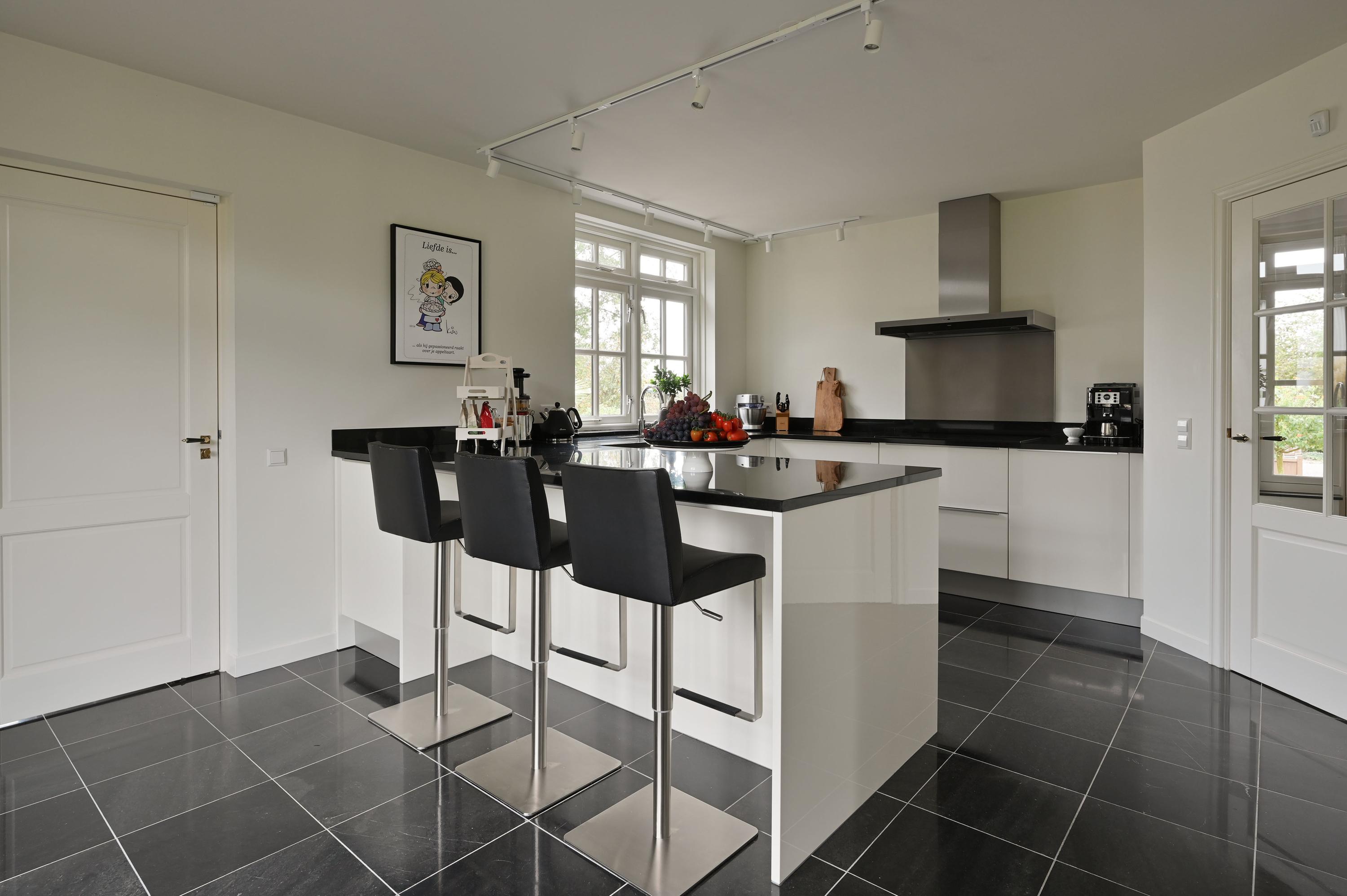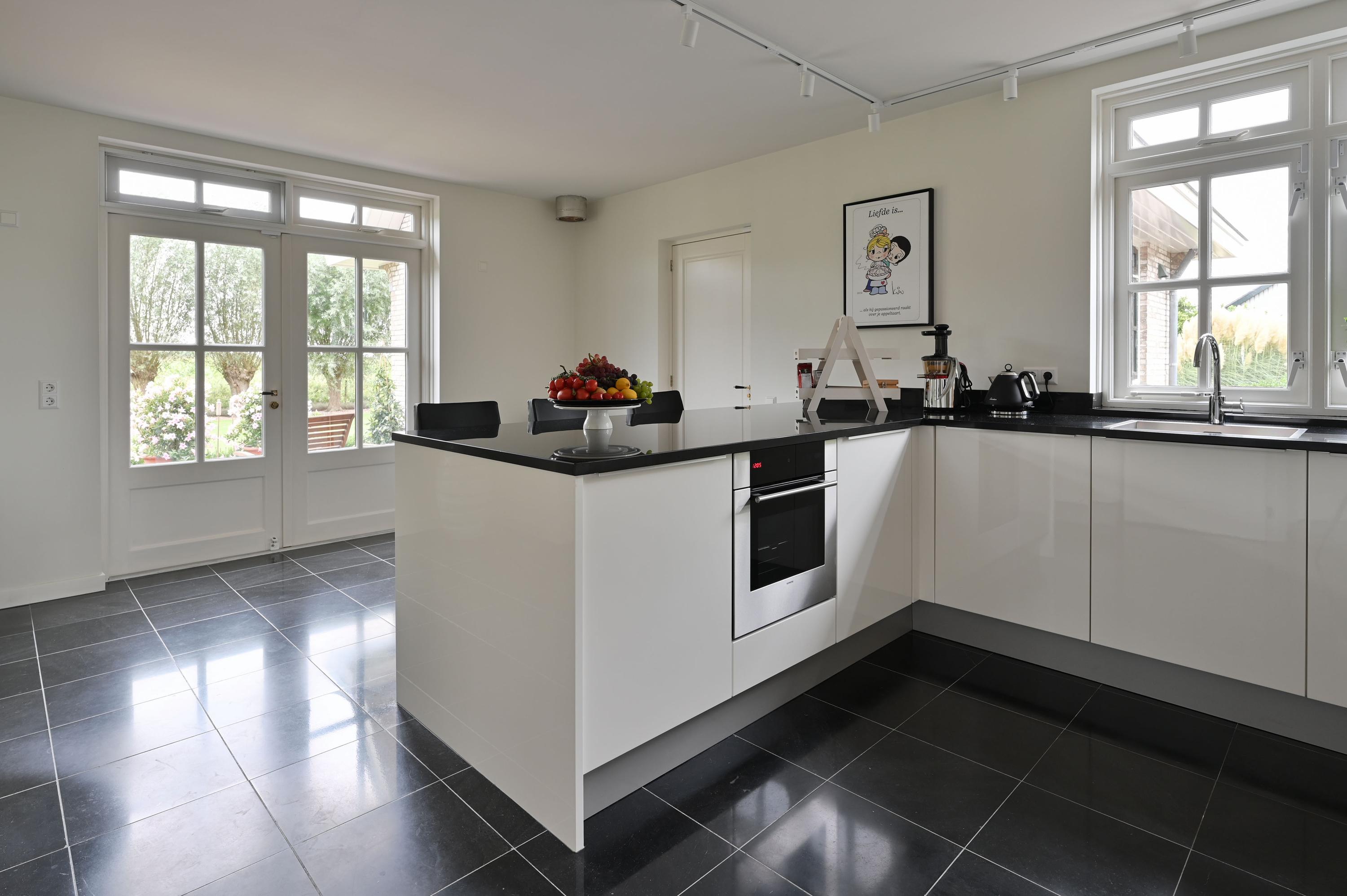 GROUND FLOOR You enter the home through the beautiful green and inviting entrance. The first thing you notice is the impressive hall with a stylish wooden staircase leading to the light-filled gallery. From this central hall, you have access to the guest toilet, the cloakroom, the upper floor, the living room, and the kitchen. The home exudes atmosphere and luxury. In the spacious, bright living room, the wood stove and the conservatory with French doors to the garden create a warm and cozy ambiance. The modern, luxurious kitchen is a place where cooking and gathering seamlessly go hand in hand. With a granite countertop, a stylish bar, induction cooktop, dishwasher, oven, refrigerator, and freezer, this kitchen is fully equipped. The ground floor features a hardstone floor with underfloor heating.