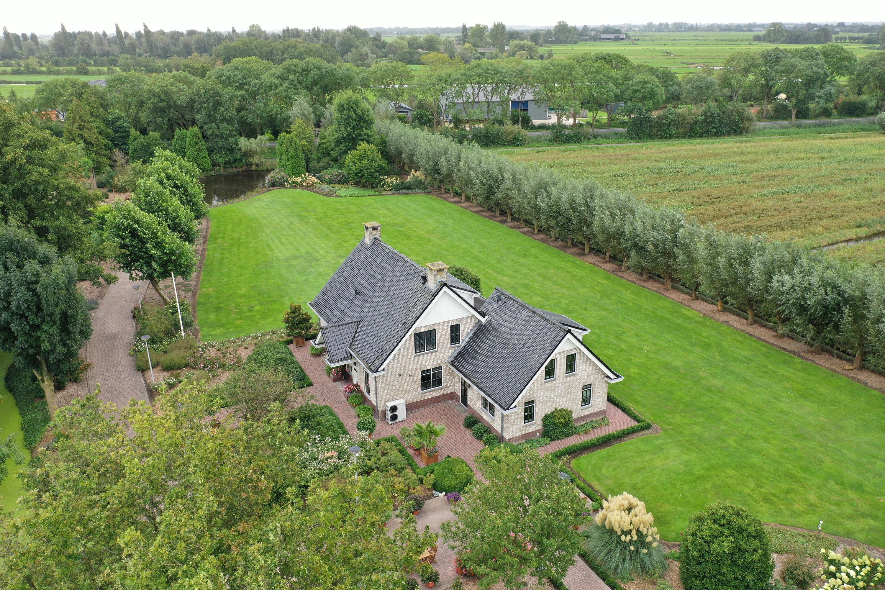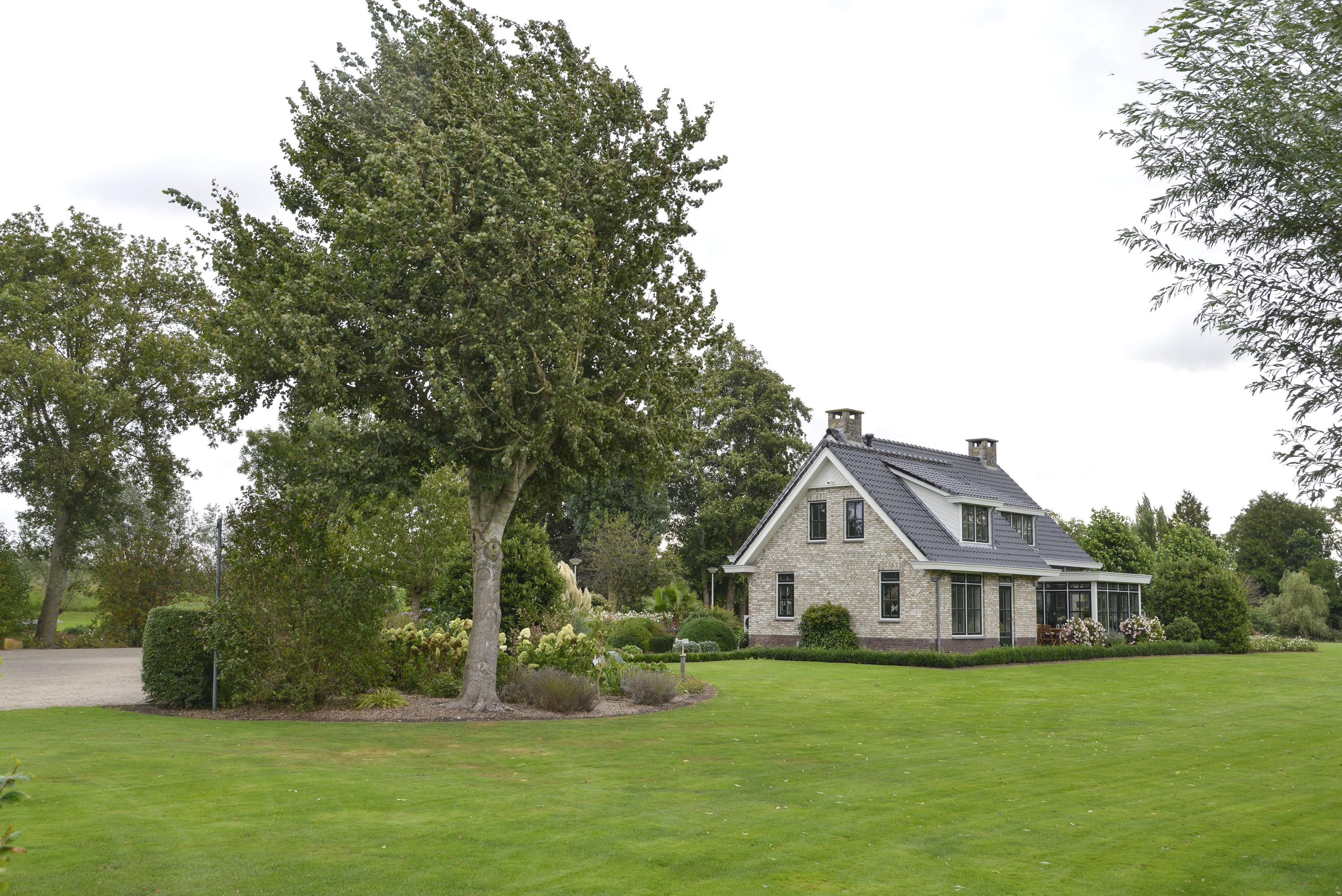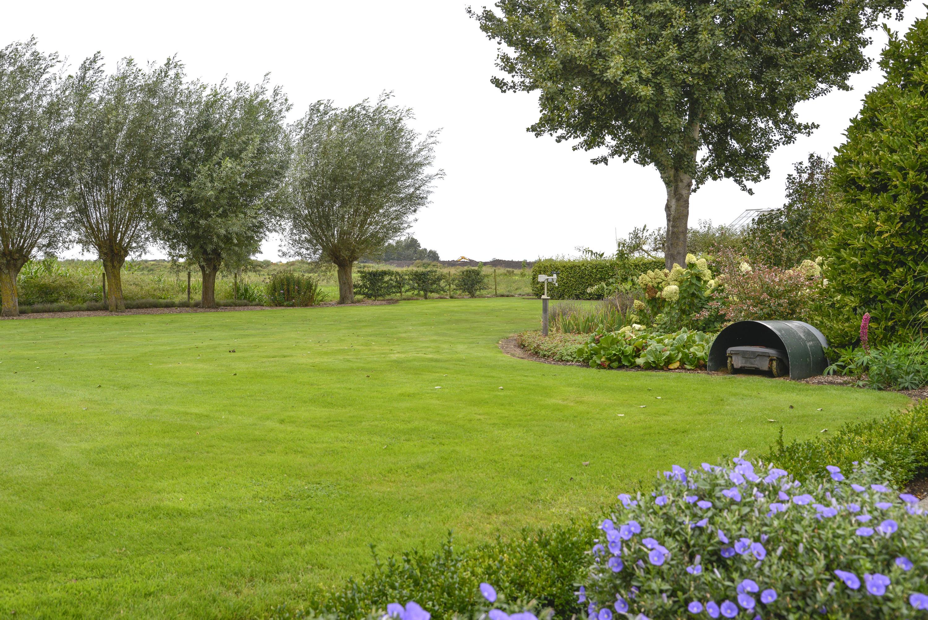 Behind the shed extends an expansive grassy field of over 30,000 m², ideal for nature and space lovers. Keeping animals such as horses, sheep, goats, or chickens is no problem here. The garden around the house is a true masterpiece of greenery and tranquility. With beautifully maintained (fruit) trees, shrubs, blooming plants, and an abundance of greenery, this garden offers an idyllic retreat for relaxation and experiencing nature. Additionally, next to the dike is a captivating natural garden where you can enjoy wildflowers and the beauty of nature in its purest form.
