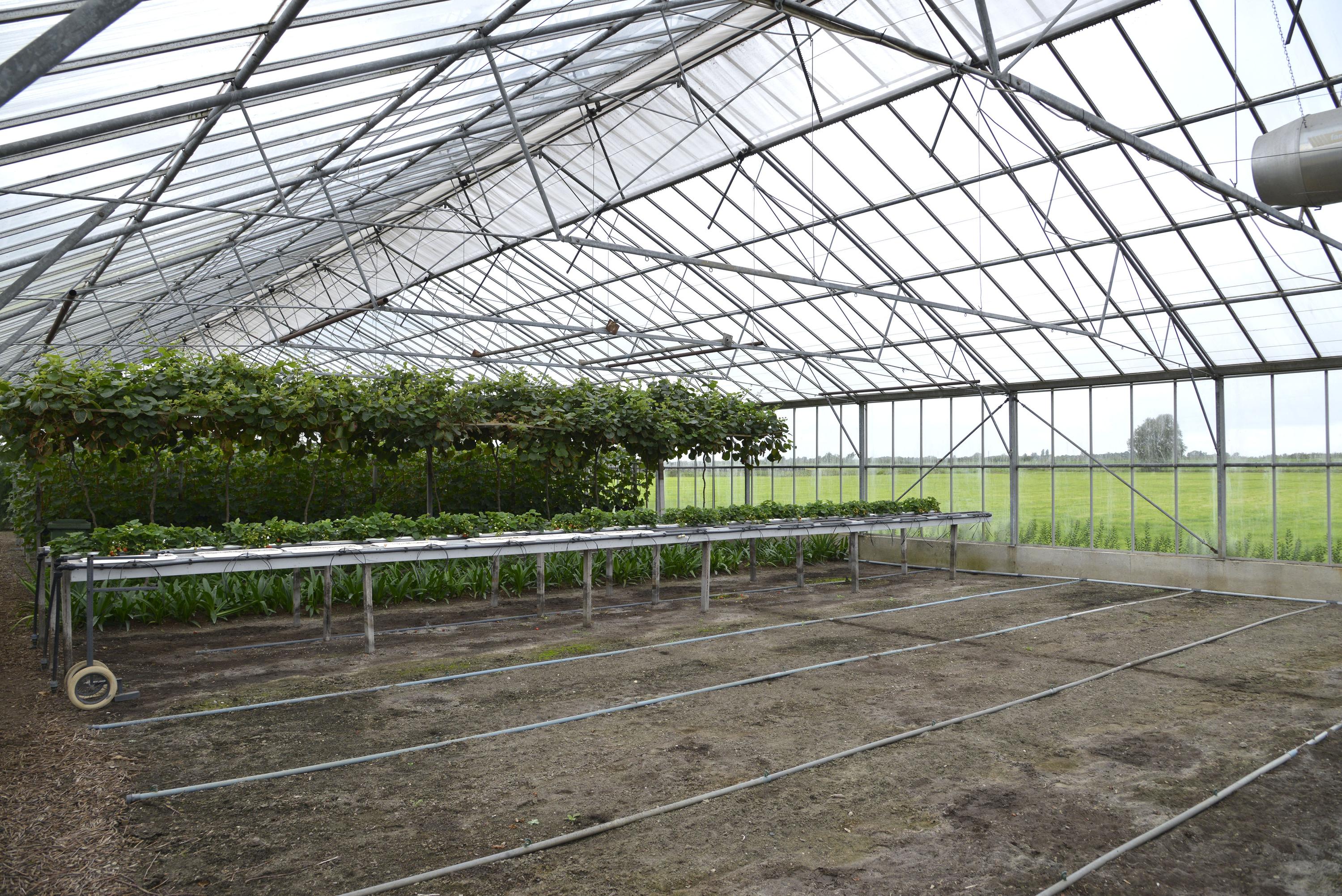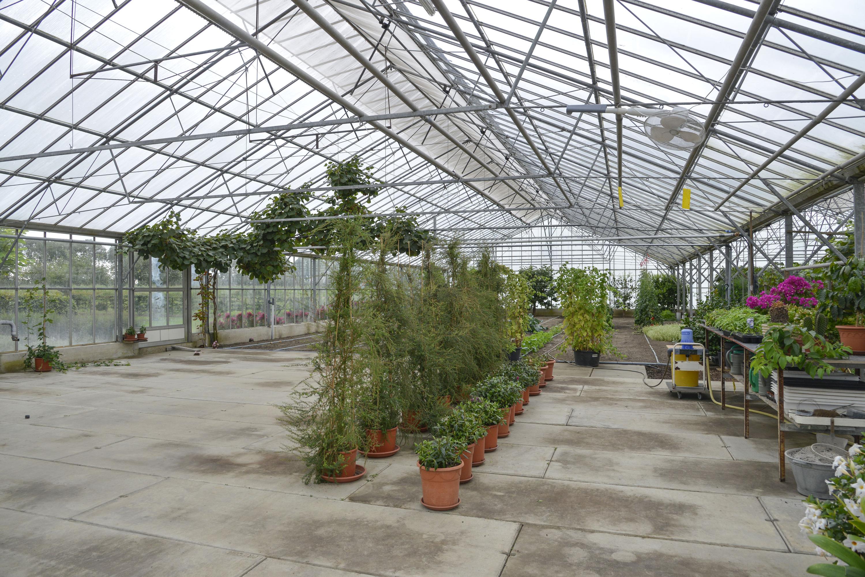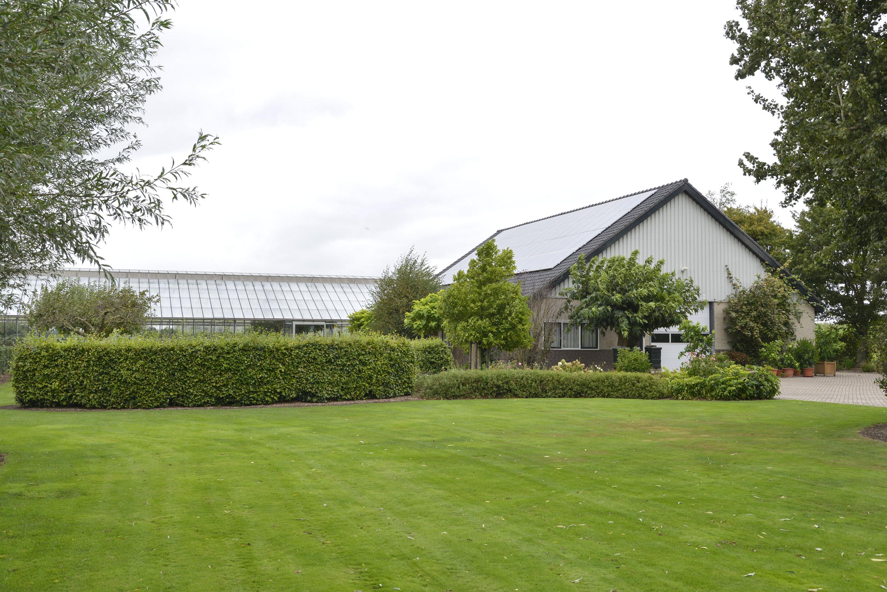 GARDEN Behind the house is a vast area where several cars can be parked effortlessly. Here you will also find an impressive shed of no less than 294 m² and a beautiful greenhouse of 1,093 m², perfect for gardening enthusiasts and for recreational space. The shed is equipped with a large overhead door on both the front and rear sides and also has a convenient walk-in door. Inside, you will find a practical office space and a toilet. The shed is not only spacious and functional but also sustainably equipped. Thanks to an efficient pellet stove, the space stays comfortably warm, while a rainwater storage system provides an eco-friendly water source. The roof is equipped with no less than 68 solar panels, making the shed nearly energy self-sufficient. These smart additions make the shed ideal not only for storage or workspace but also future-proof and environmentally friendly. From the shed, you can walk directly into the greenhouse, a paradise for anyone with green fingers. Here you can grow your own vegetables and fruits, such as juicy tomatoes or delicious grapes. A unique opportunity to realize your dream of your own nursery, with all the space and possibilities you could wish for.