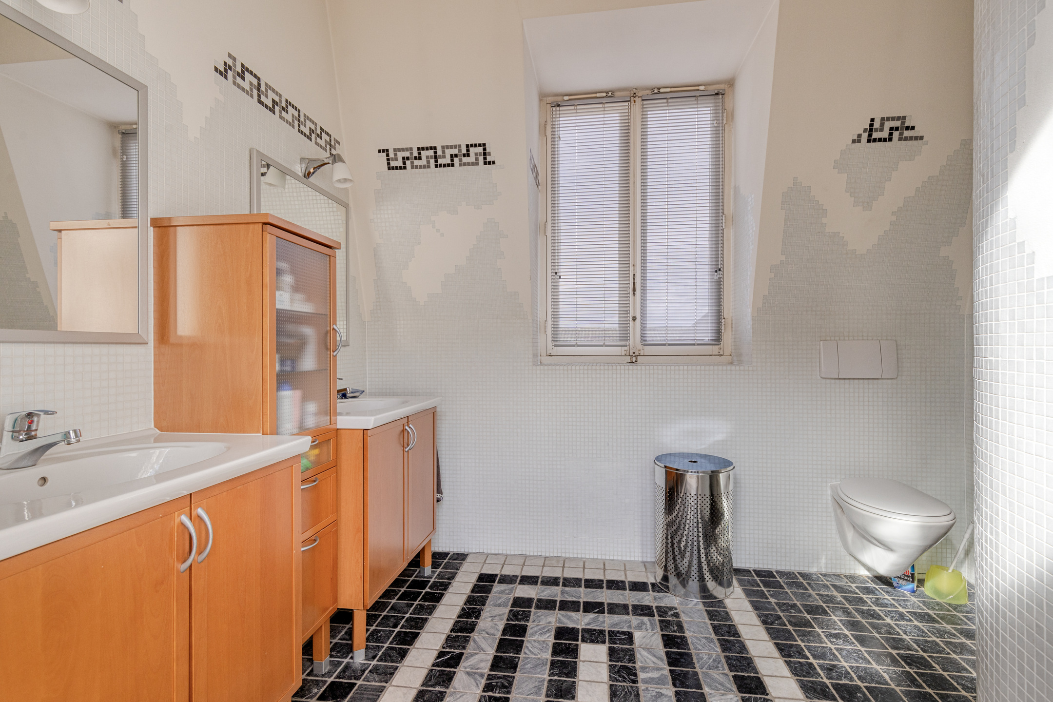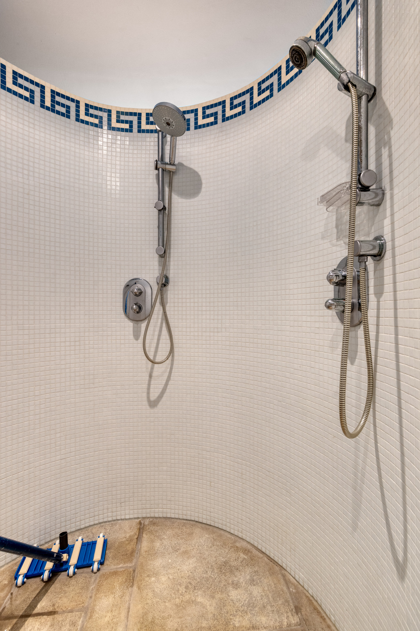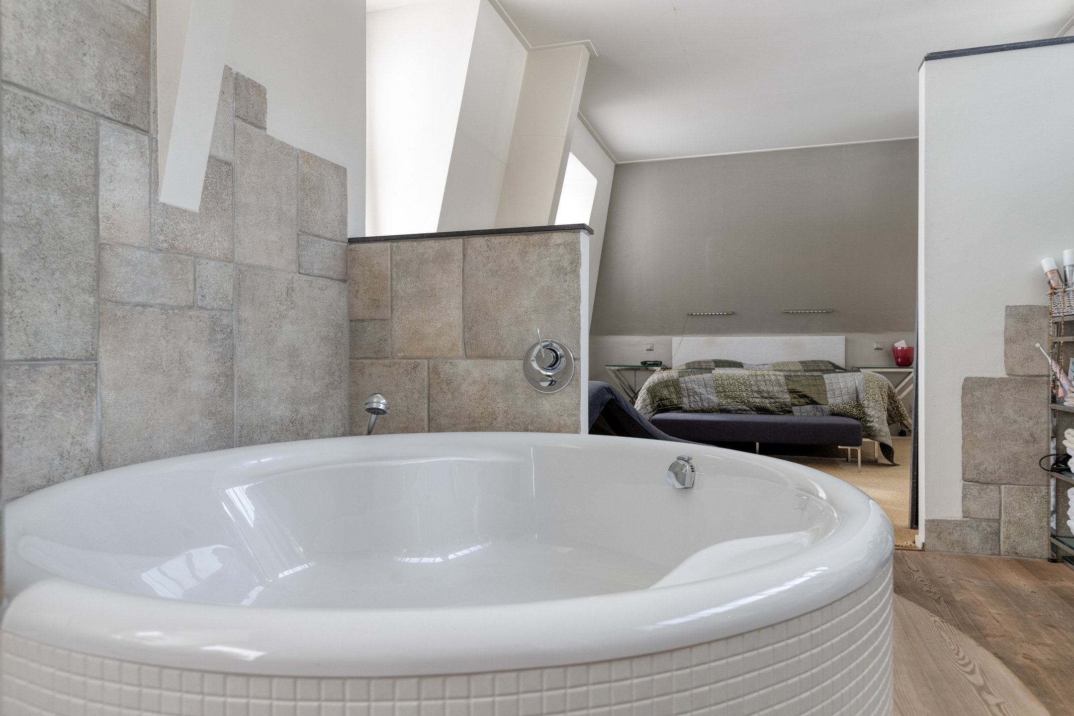 moderne en luxe betegelde badkamer en-suite, voorzien van een rond ligbad, wandcloset, dubbele glazen design wastafels, stoom/douchecabine en een inloopkast;