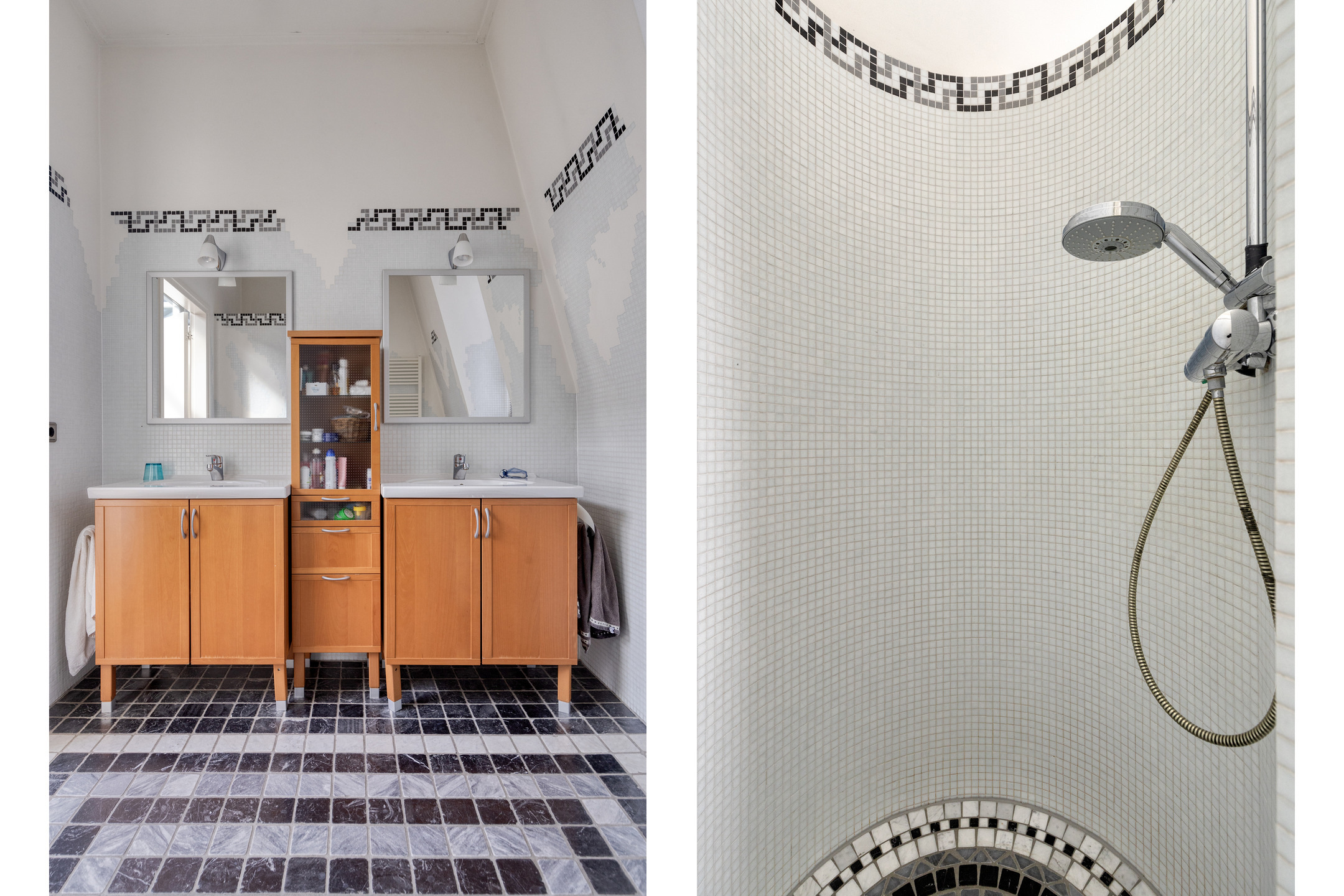 betegelde badkamer, voorzien van een badkamermeubel met dubbele wastafel, wandcloset, inloopdouche en designradiator.