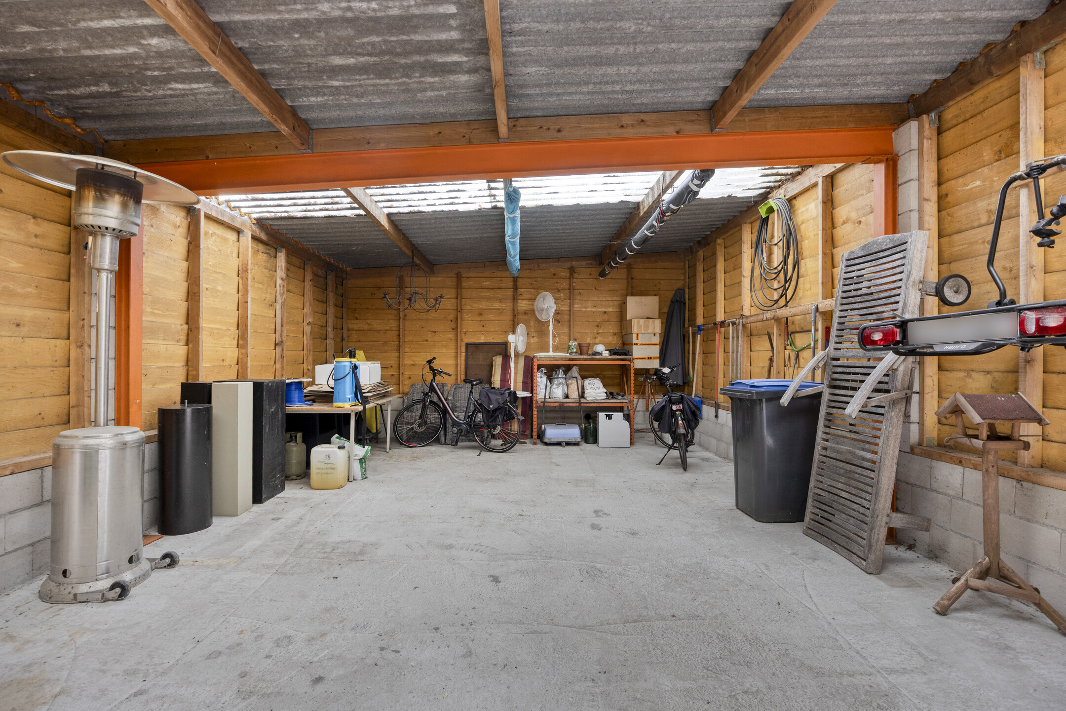 Barn II (approx. 302 m²), divided into two sections, featuring two sets of double wooden doors to the driveway/garden, three pedestrian doors, electricity, power supply, roof insulation and two storage mezzanines; partly tiled roofing and partly asbestos corrugated sheets.