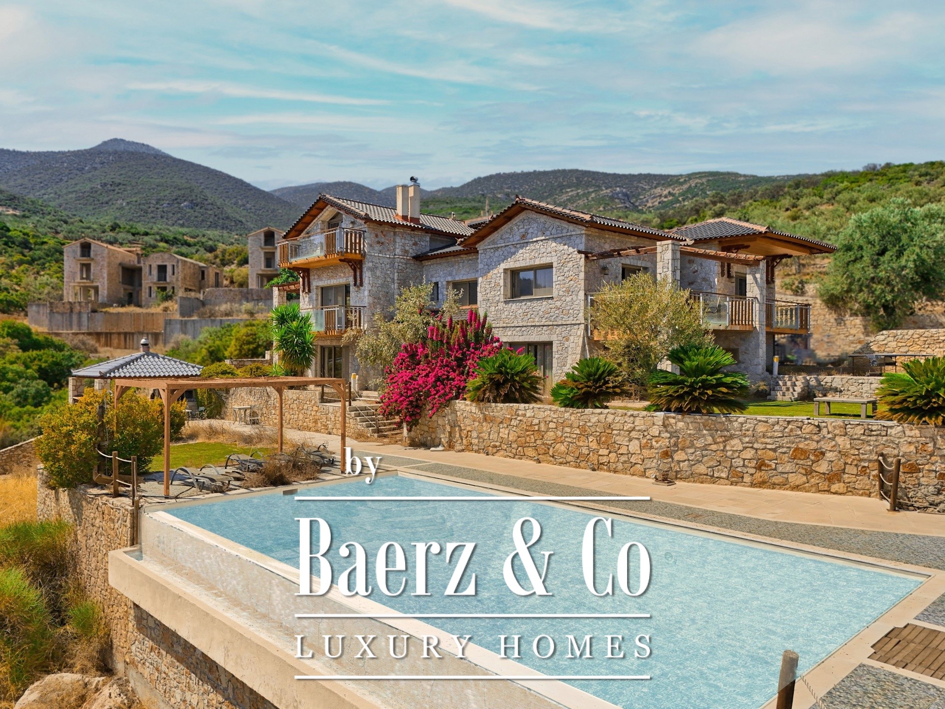 This stone villa Xiropigado sits just one kilometre from the Aegean, enfolded by ancient olive trees and spanning 380 m² on a generous private plot of 9,000 m². The villa’s architecture balances local stonework and modern comfort, its elevation granting panoramic sea views that define every space.