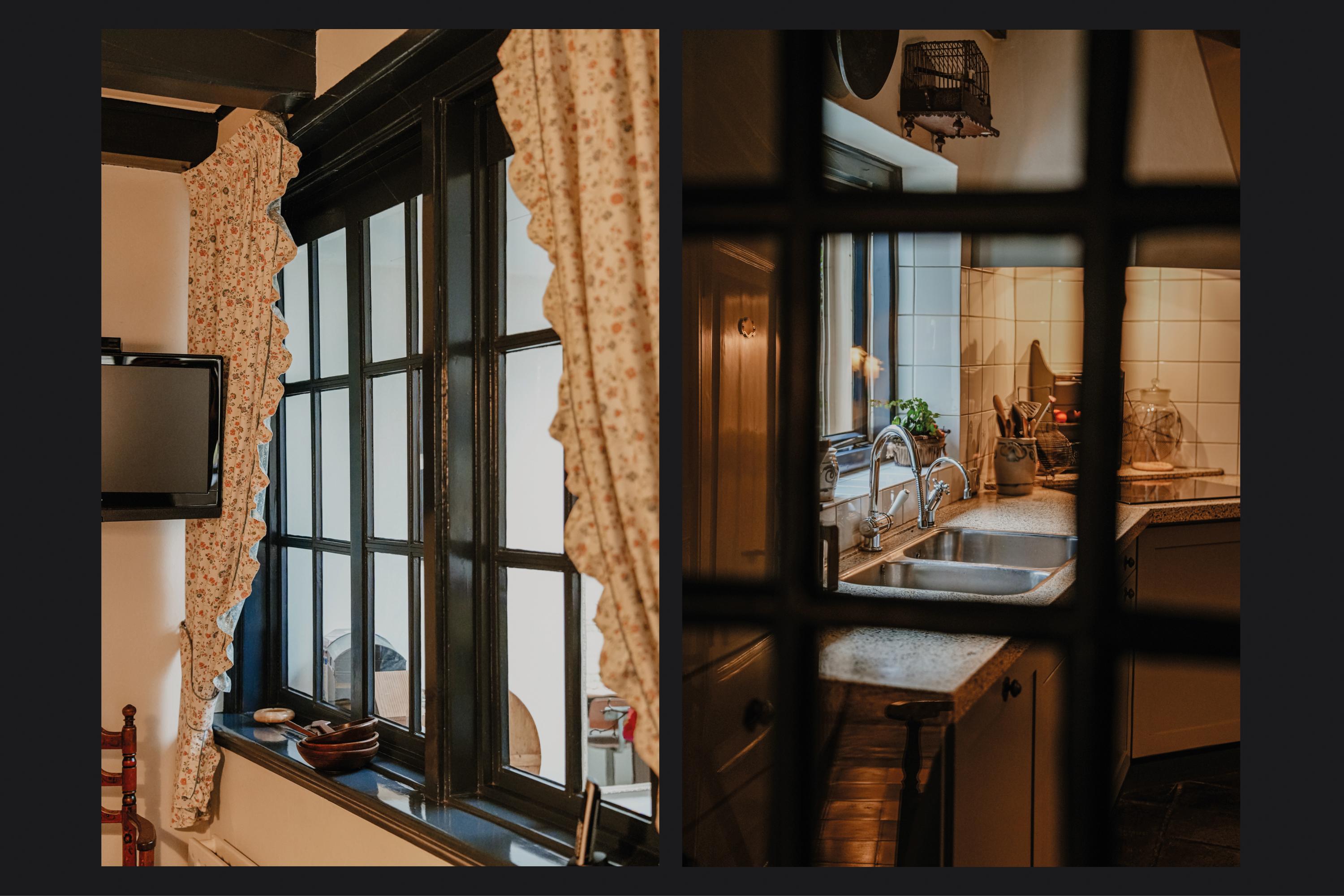 Adjoining the hallway are the cellar, utility room, and dining kitchen. A glass panel in the cellar floor reveals the historic water well below. The utility room occupies the former outdoor space of what was once the western house when the property consisted of two separate homes. The hallway retains the original 18th-century pump with a stone basin and brass taps. The dining kitchen is furnished with a classic kitchen unit featuring built-in appliances and a terrazzo countertop. From the kitchen, there is a pleasant view of the garden.