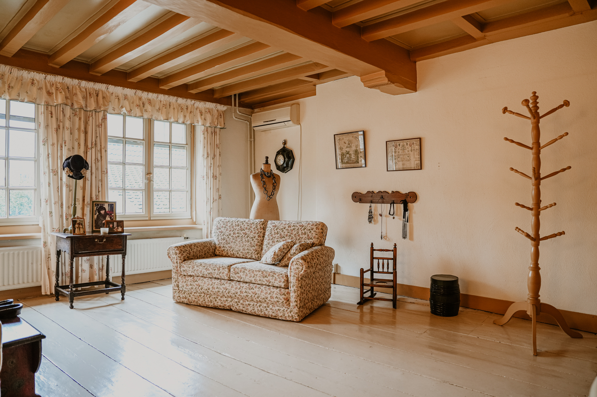 This floor radiates the atmosphere of the 16th century. At the front is a 40 m² bedroom that once served as a living room. Three large sash windows offer views of the broad Gasthuisstraat. The floor features wide wooden planks, and there are two built-in cupboards. At the rear is an even more imposing bedroom with a beam-and-rafter ceiling, white-painted wide floorboards, and a full-width fitted wardrobe with elegant panel doors. Two sash windows provide views of the garden.