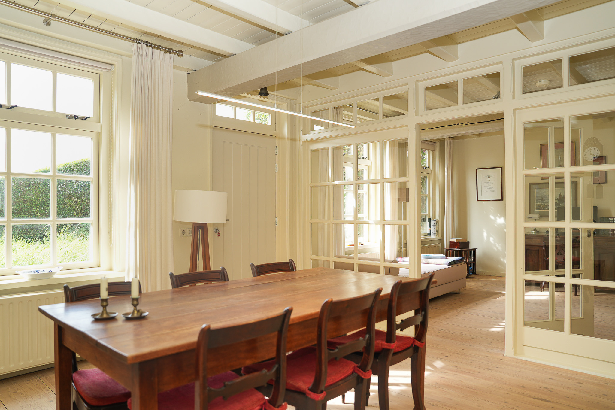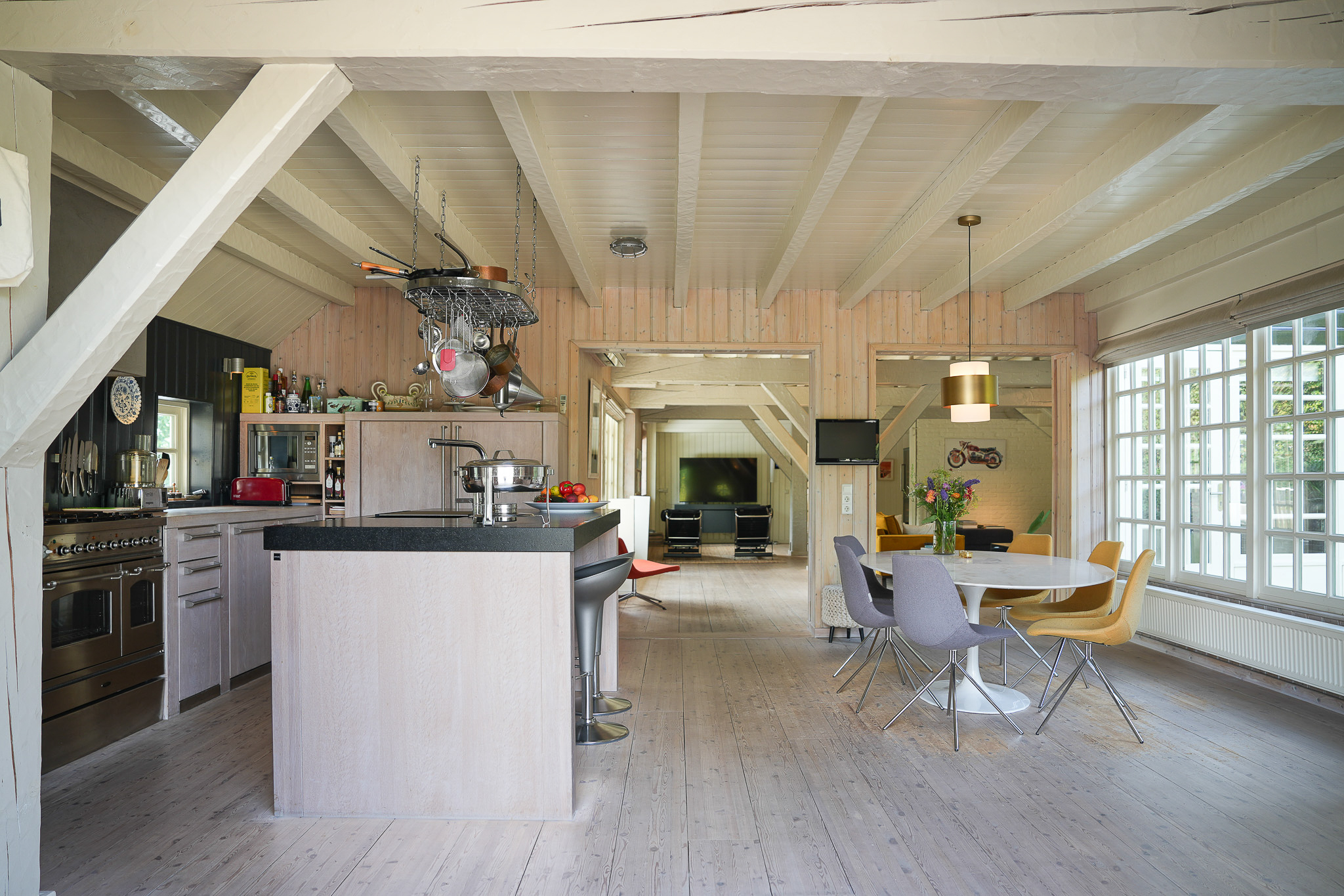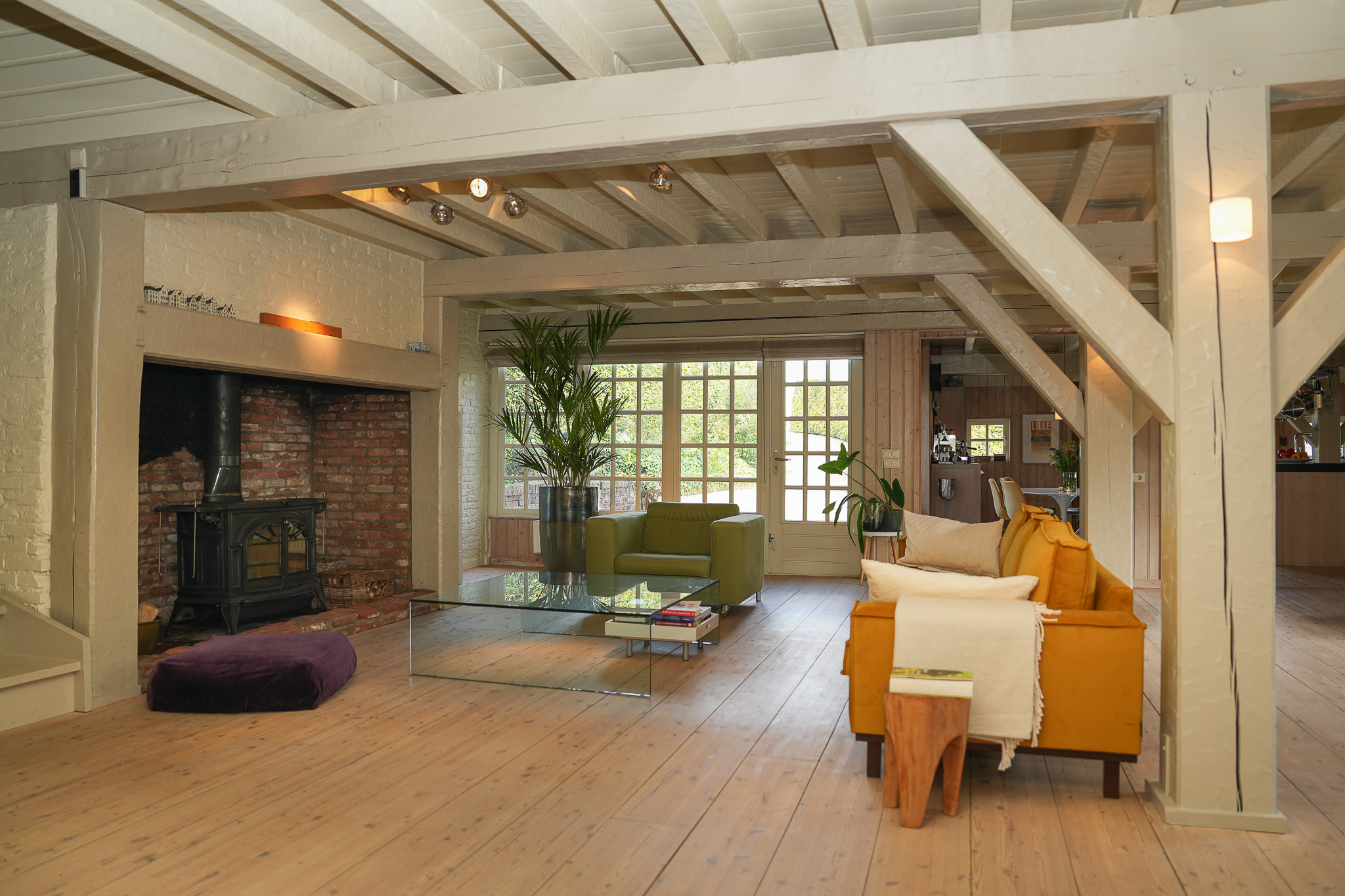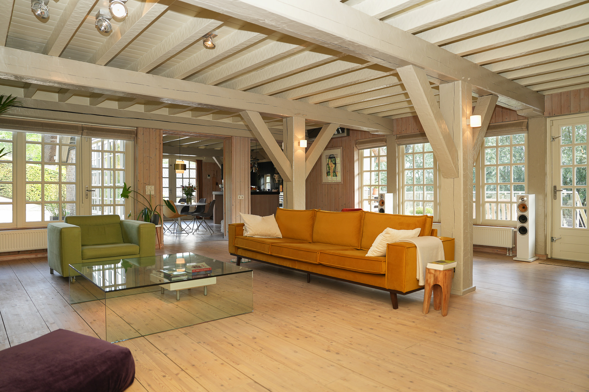 Country house Zuilichem stands in a tranquil rural setting near the banks of the river Maas, offering a calm retreat on a plot spanning 2,060 m². The country house presents 328 m² of living space, enhanced by a gross volume of approximately 1,090 m³, with a layout and material palette that prioritise sense of place and timeless comfort. Arriving via the elevated hardwood terrace, the entrance opens into a generous 140 m² living area where wide wooden floorboards, a wood-burning stove, and ample natural light set a warm, inviting tone. The fully fitted kitchen contains premium appliances and accommodates both daily routines and gathering spaces, leading out to a second terrace adjoining the driveway.