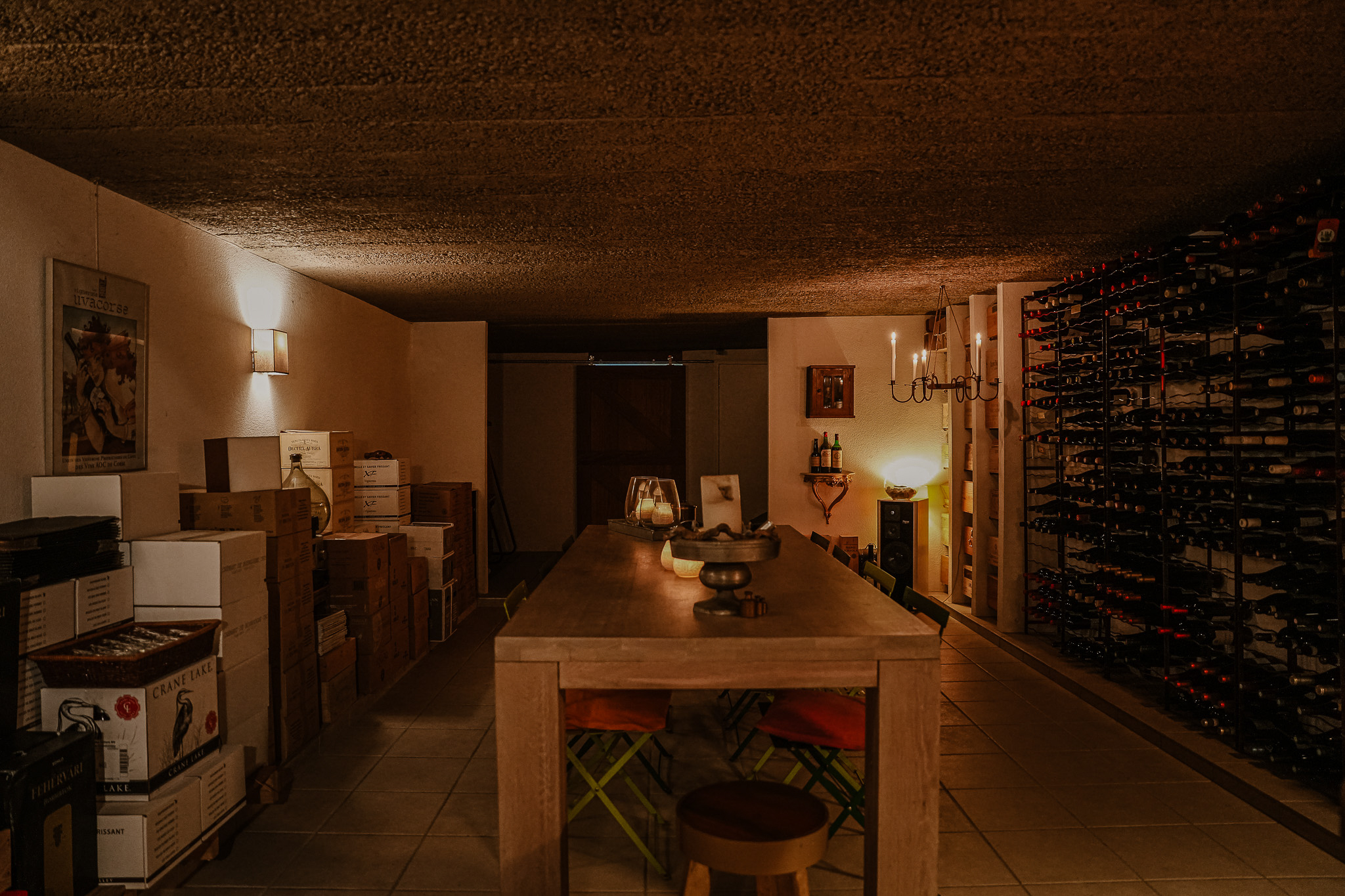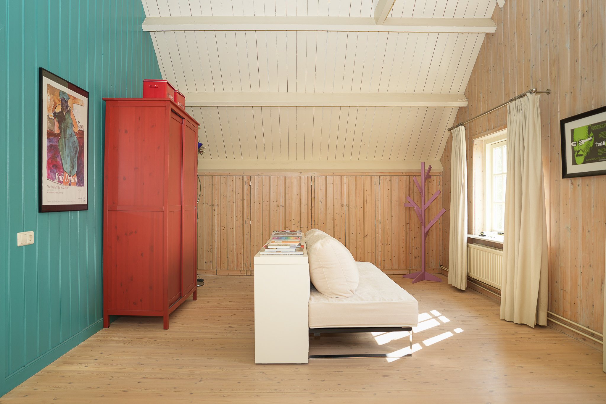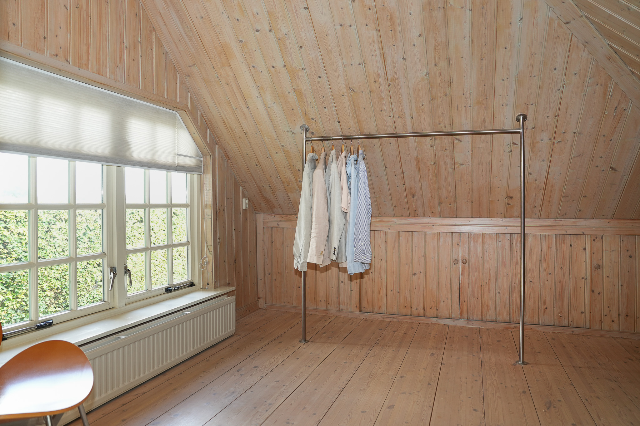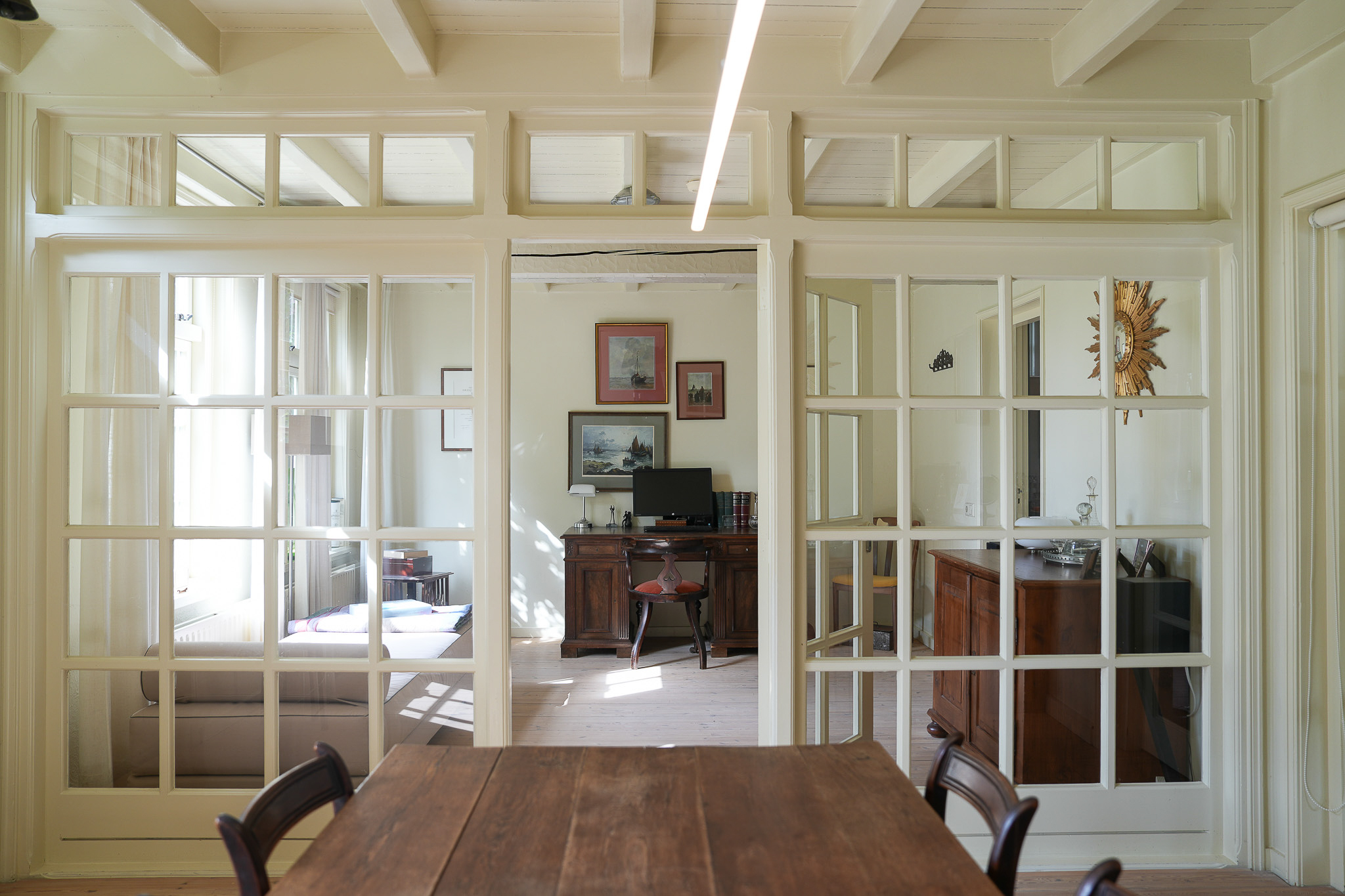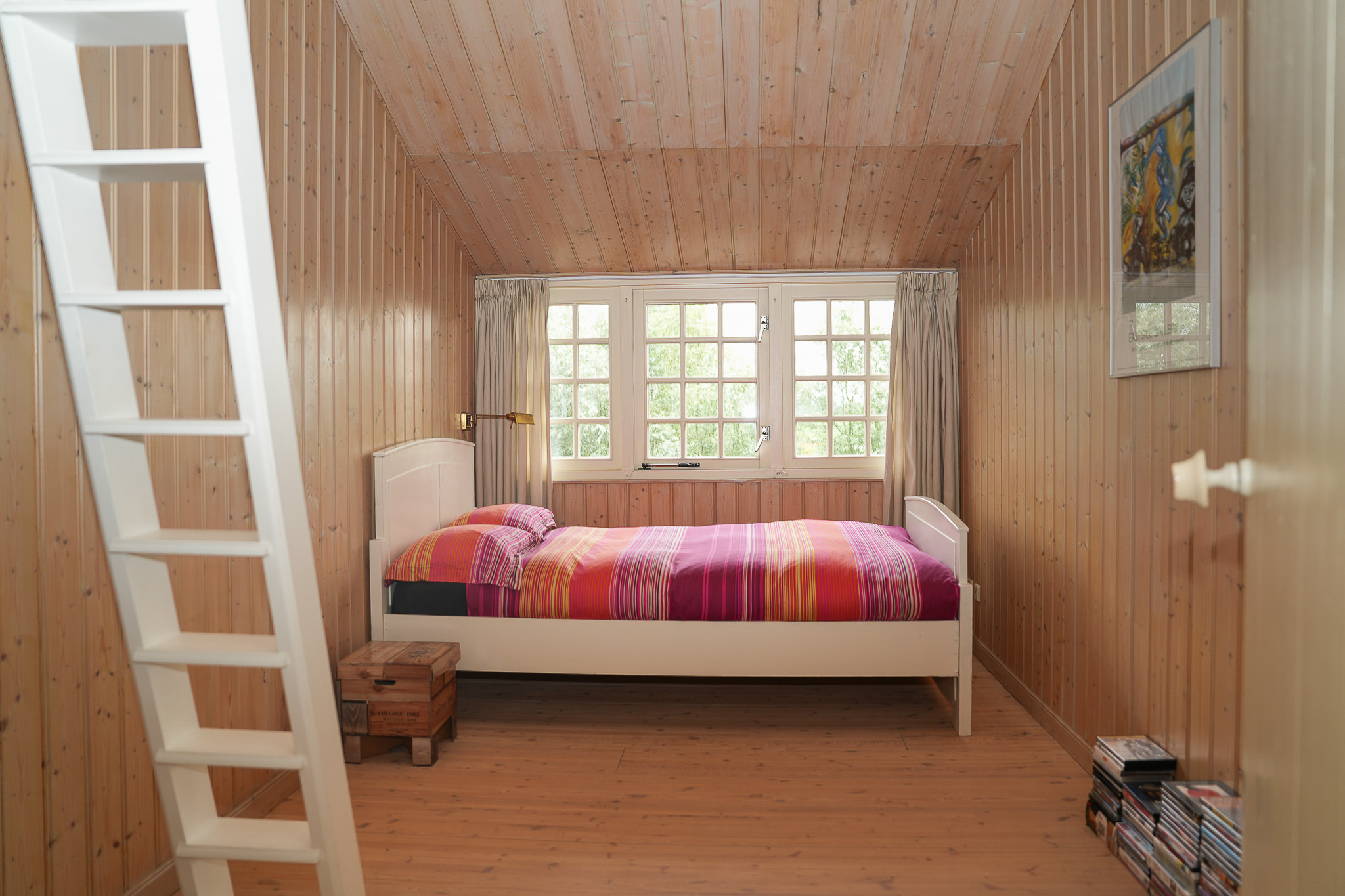 On the ground floor, two multifunctional rooms offer flexibility for study, guest accommodation with a private shower, or additional living. Upstairs, four bedrooms include a master suite with balcony and dressing room, and a complete bathroom designed for quiet retreat. The east-facing bedroom features built-in wardrobes under the eaves, while the remaining rooms are marked by exposed beams and expansive views over the surrounded gardens. The basement, with 56 m² and 2.10 metres ceiling height, currently serves as a wine cellar and offers further versatility.