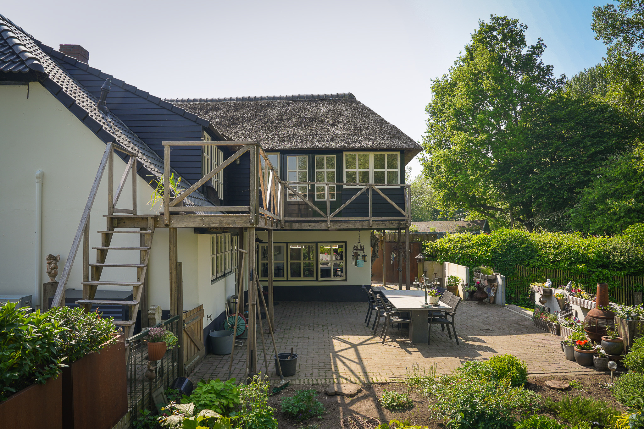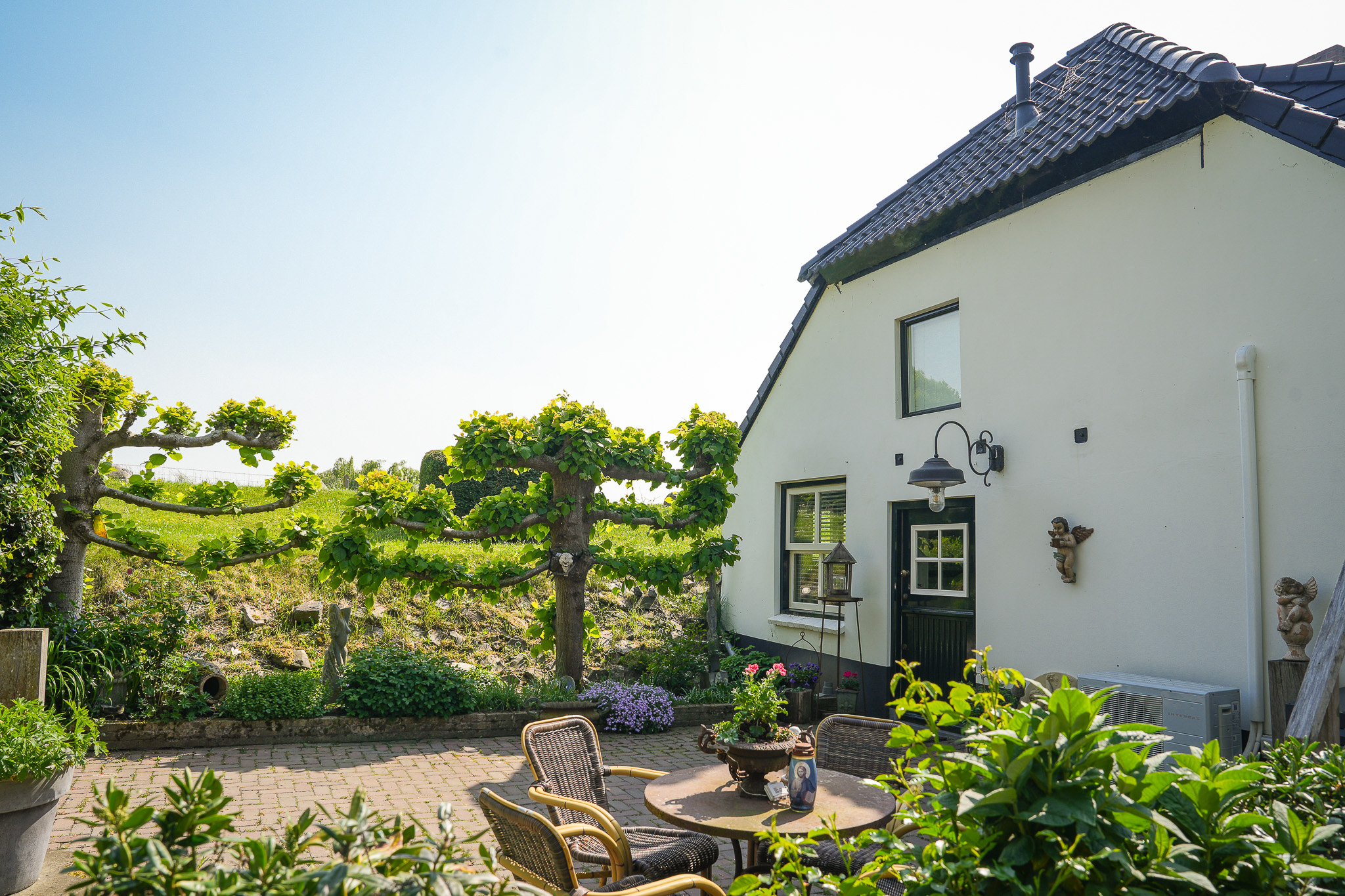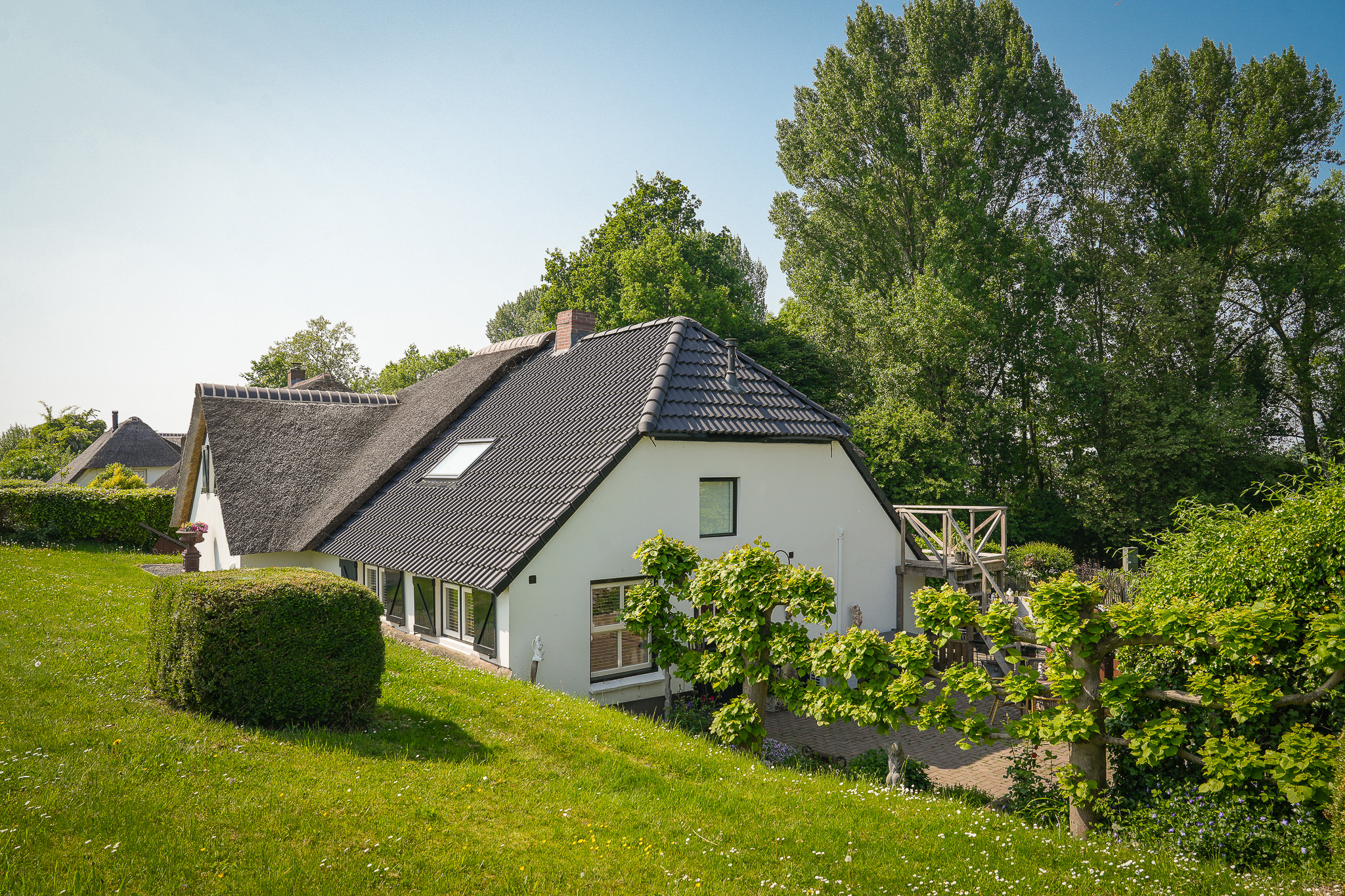 This property is known locally as “The Old Smithy,” as it was the village blacksmith’s house until 1964. From the dike, the house resembles a classic dike house commonly found along the River Waal. However, the rear boasts the appearance of a luxury villa, thanks to the clapboard extension, thatched roof, and French doors.