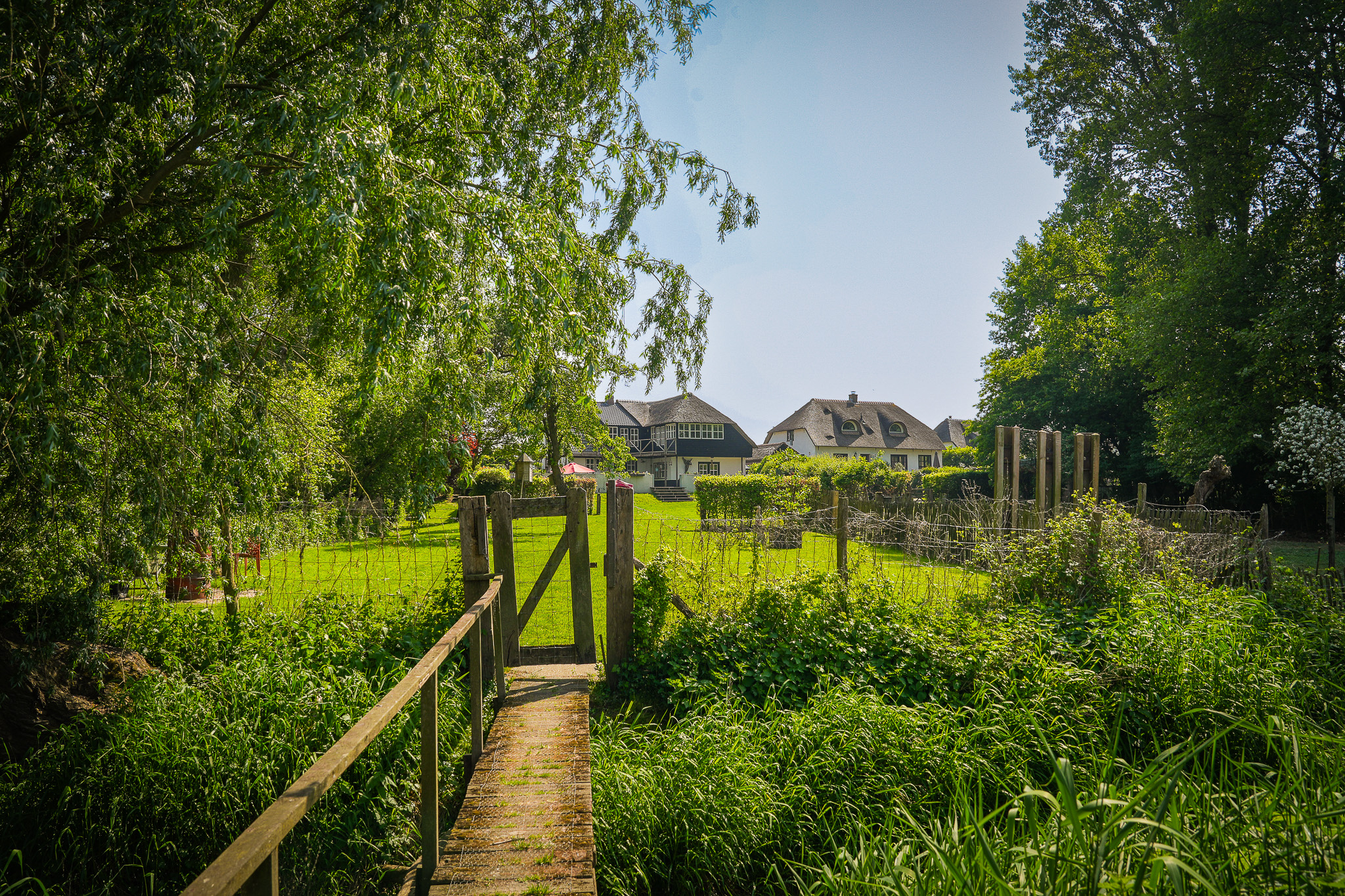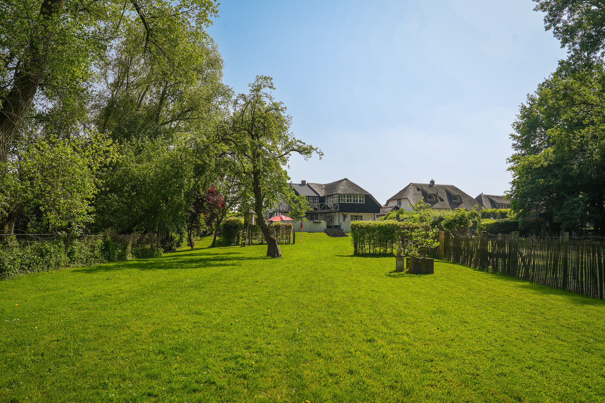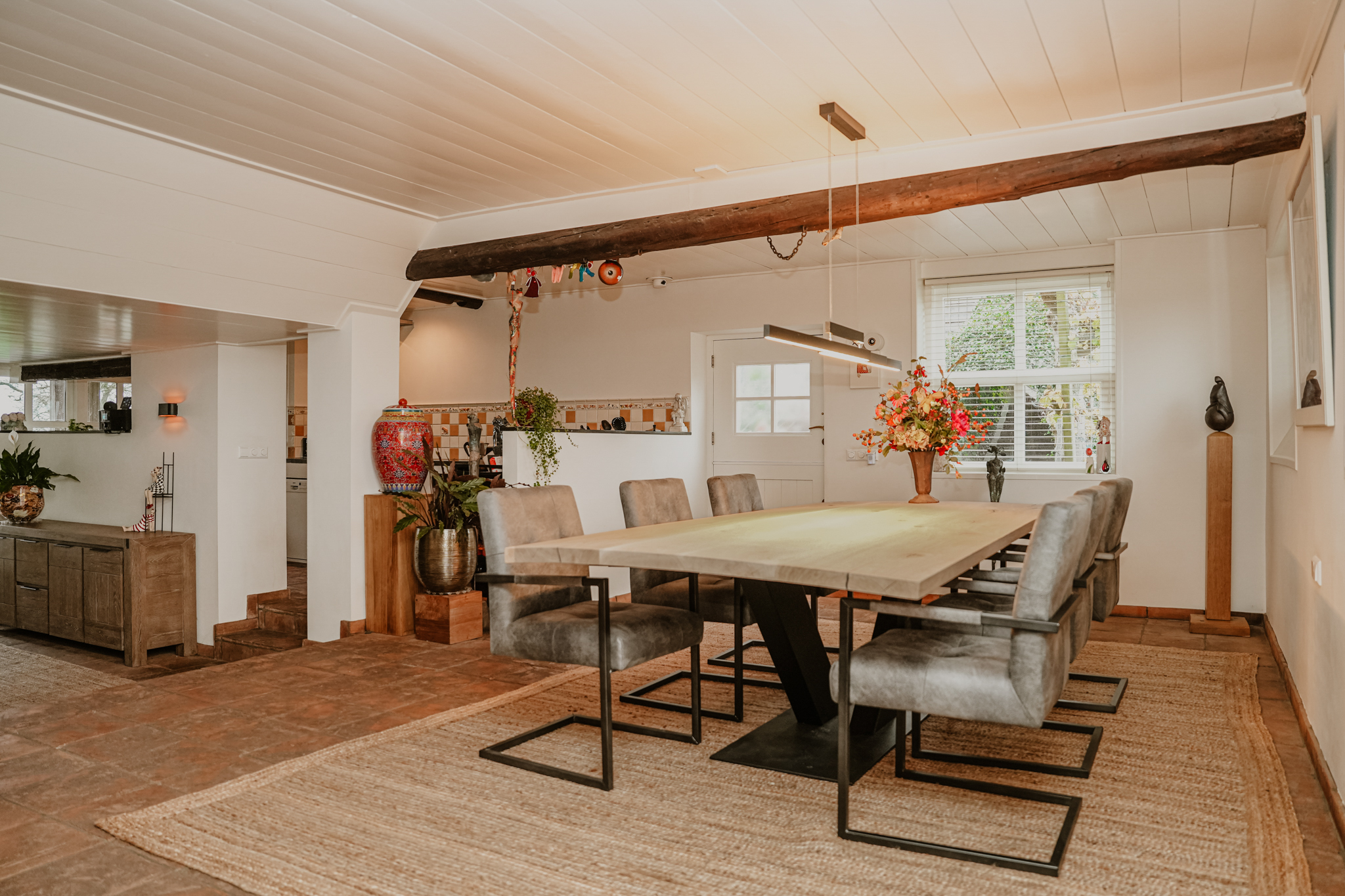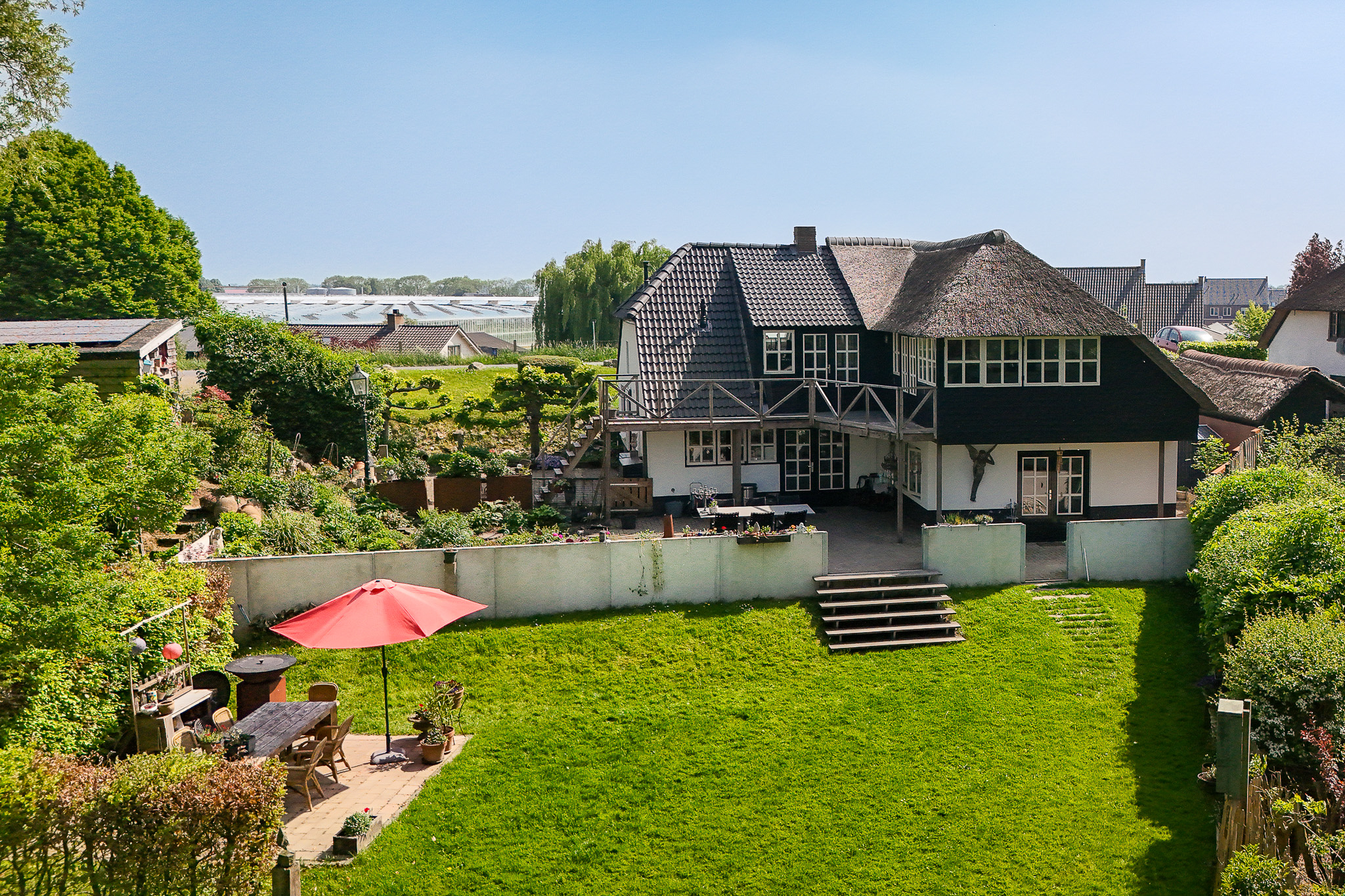 This property is known locally as “The Old Smithy,” as it was the village blacksmith’s house until 1964. From the dike, the house resembles a classic dike house commonly found along the River Waal. However, the rear boasts the appearance of a luxury villa, thanks to the clapboard extension, thatched roof, and French doors.