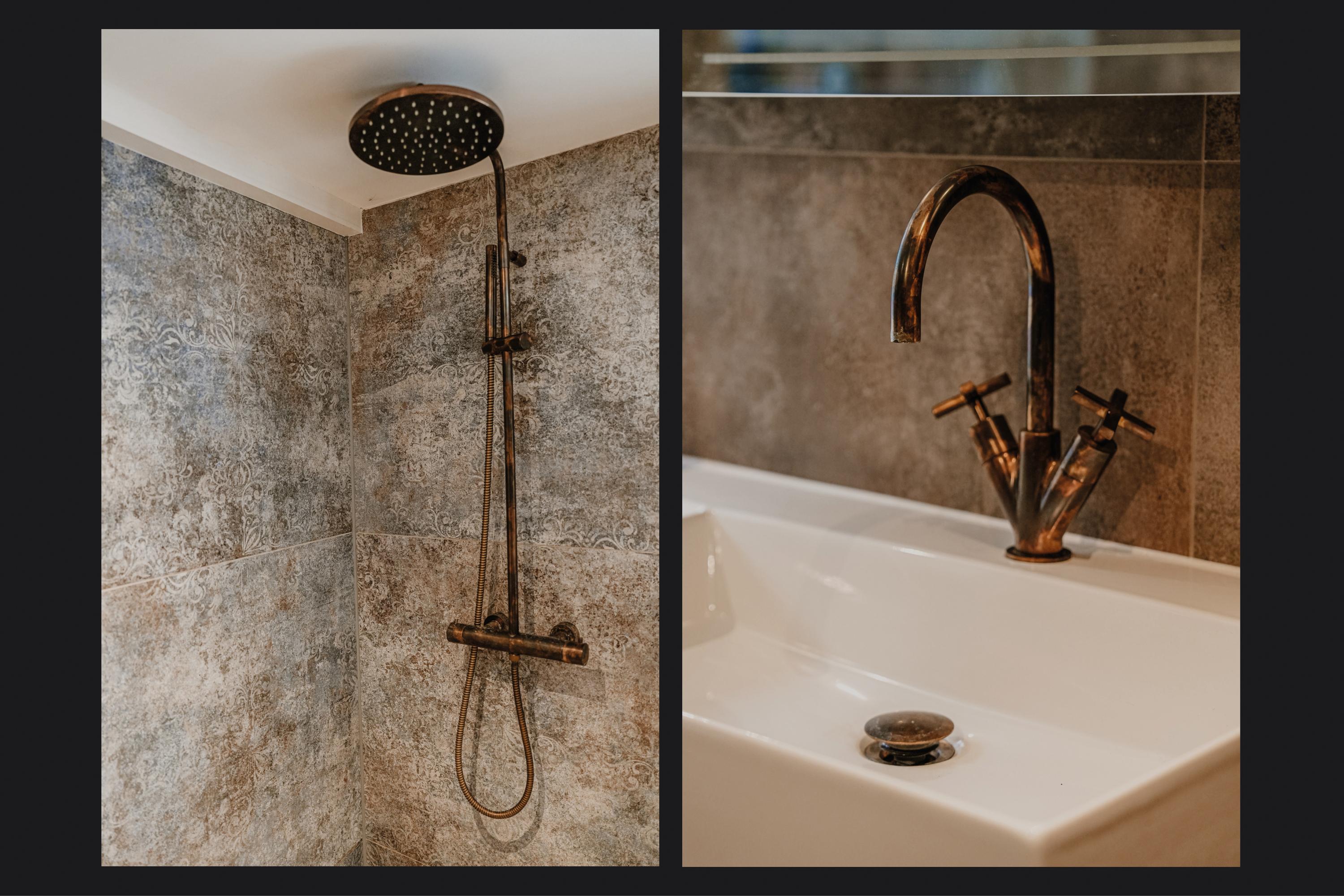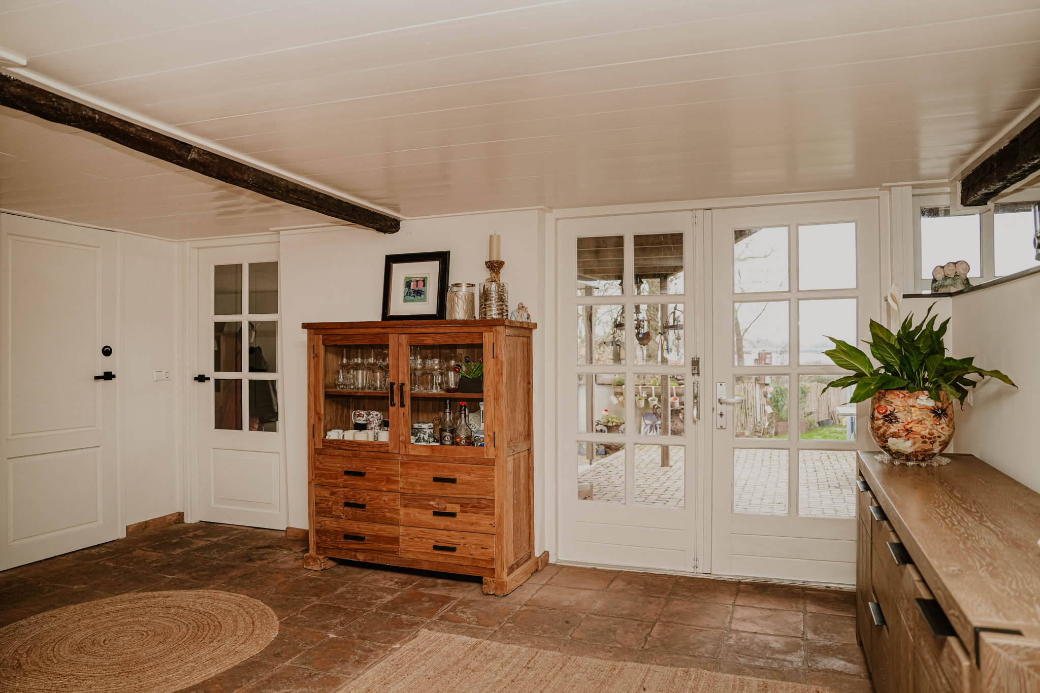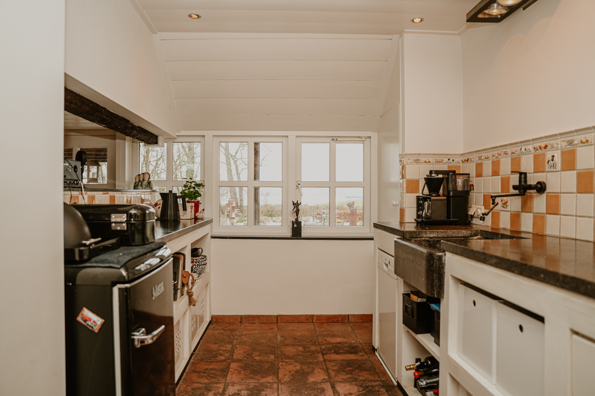 The entrance, through a shared Dutch door on the side of the house, provides direct access to the spacious kitchen. On the dike side, there is an elevated dining area that seamlessly blends with the handcrafted kitchen. The kitchen features a beautiful Belgian bluestone countertop with an authentic pump basin. From the kitchen, you have direct access to the river-facing terrace. Adjacent to the dining room is a spacious utility room with laundry connections, where the inverter and home battery are also located. The lower section leads to the garden/office room, a bedroom, a toilet, and a new (guest) bathroom with a walk-in shower and vanity.
