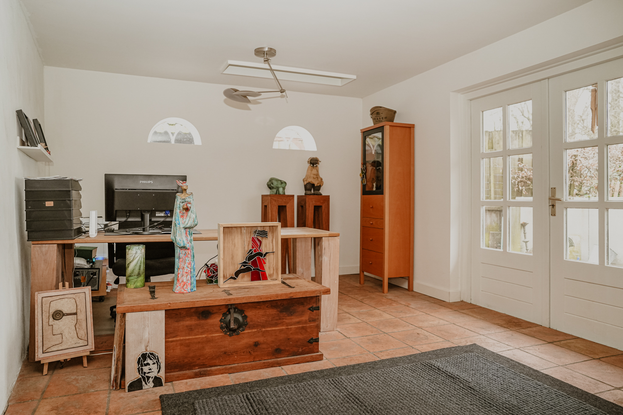 The garden room is located in the extension of the property and has French doors with six-pane division opening to a second terrace. The current owner uses this room as an office, but it could also serve as a cozy TV or playroom. The floor is largely laid with antique red abbey tiles and features underfloor heating.