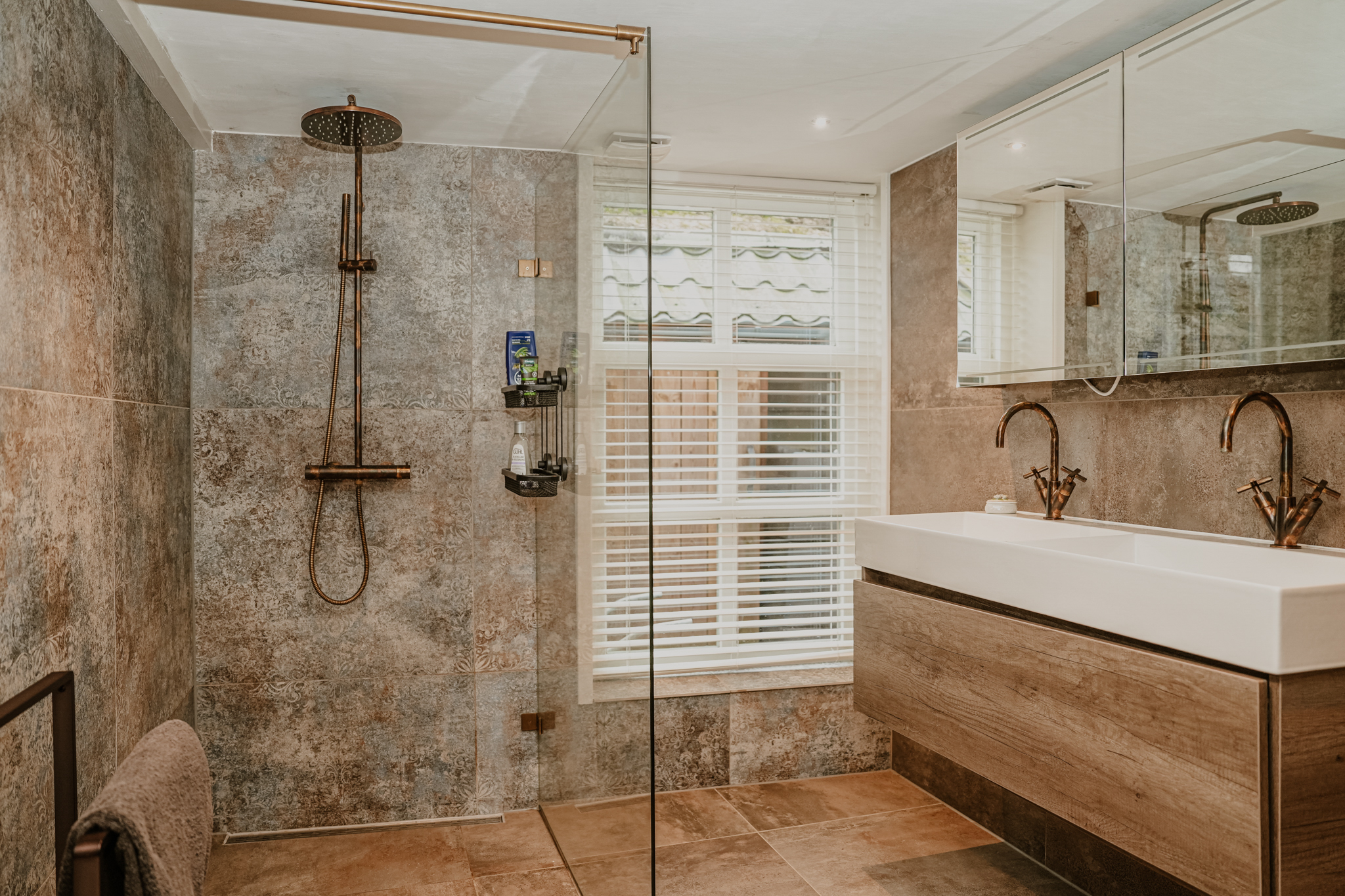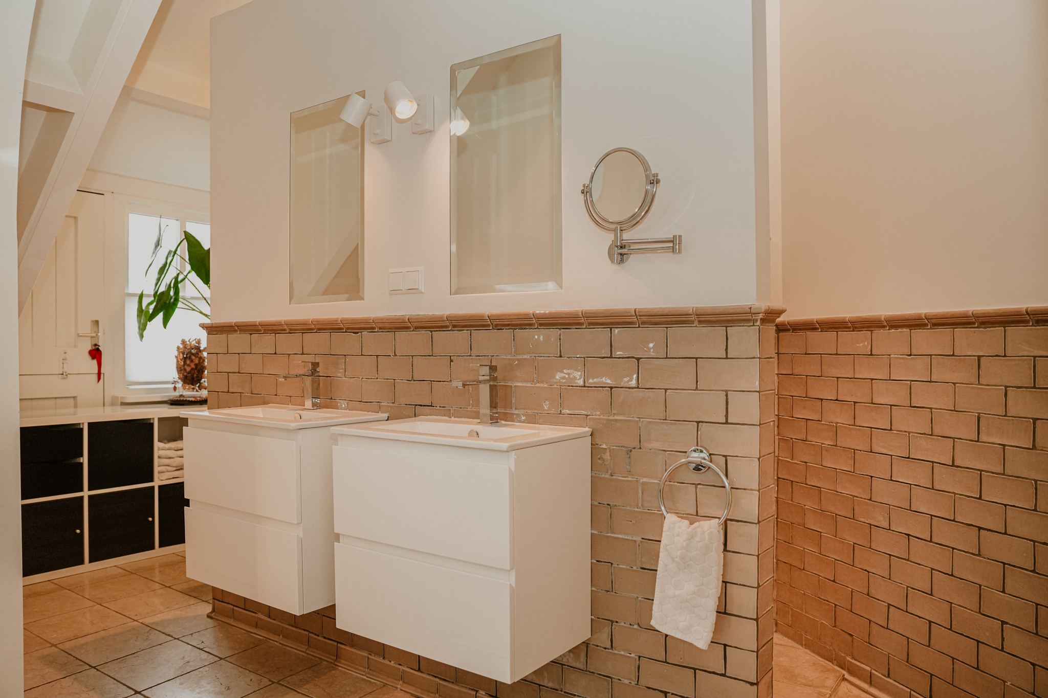 The floors on this level are finished with beautiful oak planks. On the west side of the original dike house is a spacious bedroom with a walk-in closet and a second bathroom. This bathroom features a walk-in shower, toilet, double vanity, and a natural stone floor.