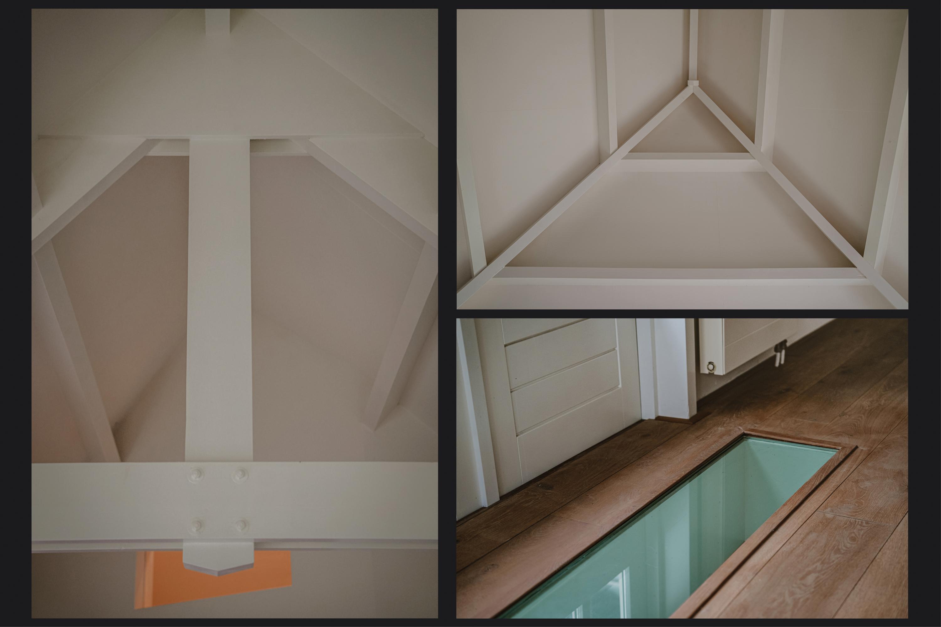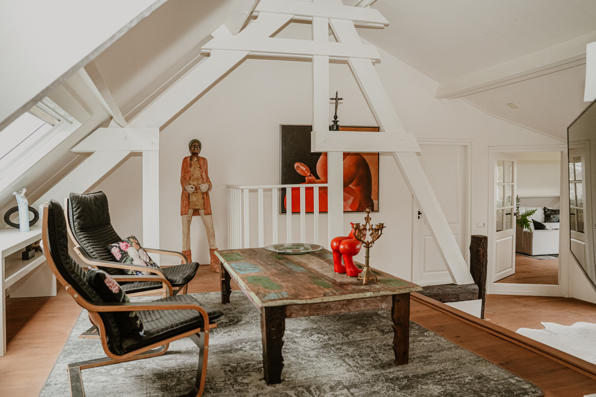 Upon reaching the first floor, you are greeted by a surprising amount of space, light, and breathtaking views. The area in the original dike house is designed as a work/lounge space, with the exposed beams remaining visible. French doors with six-pane division open onto the river-facing roof terrace. At the rear, in the 2003 extension, there is a second living space with additional French doors and numerous windows, offering stunning views of the River Waal. This inspiring space is perfect as an atelier or additional bedroom.