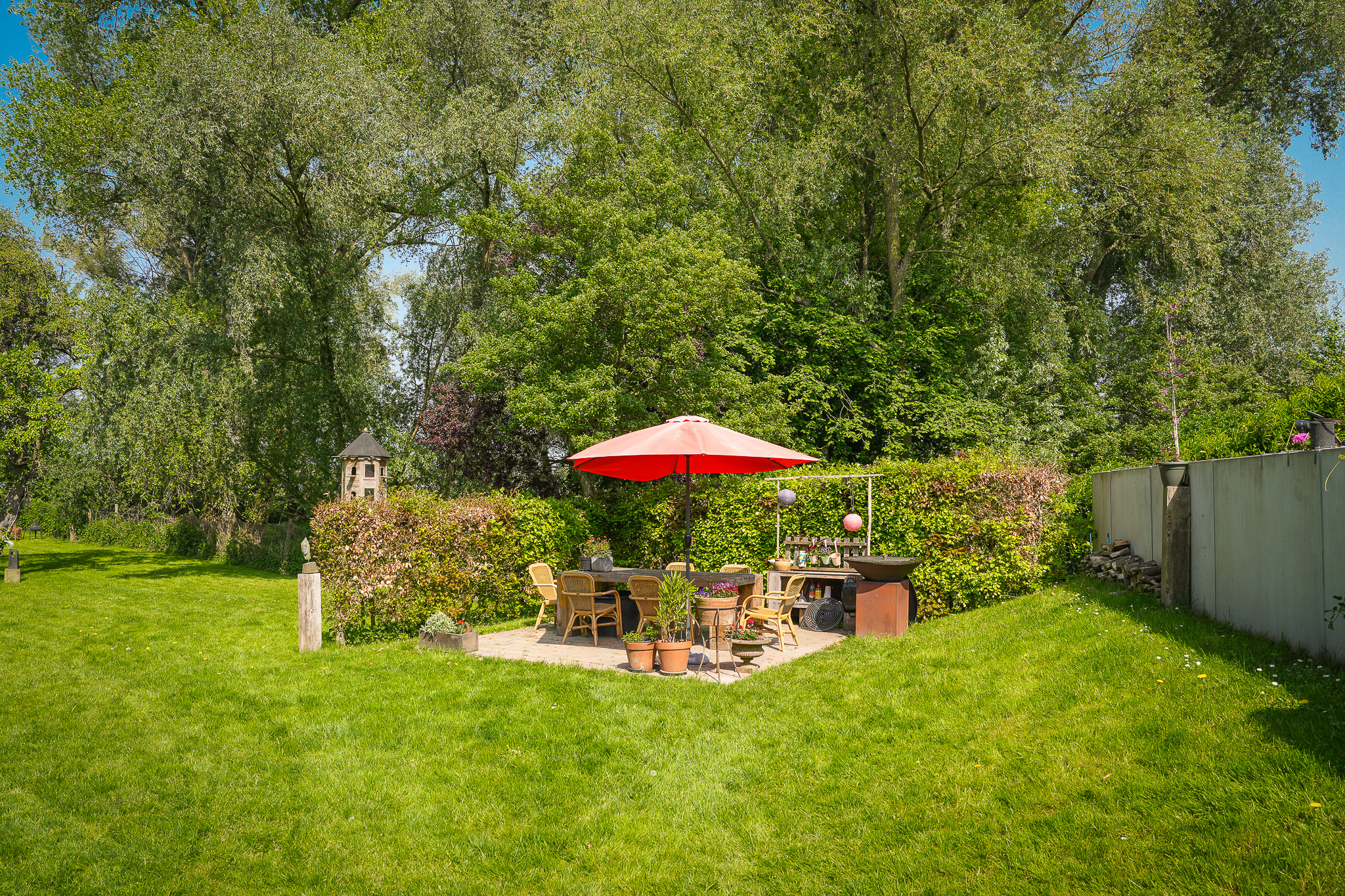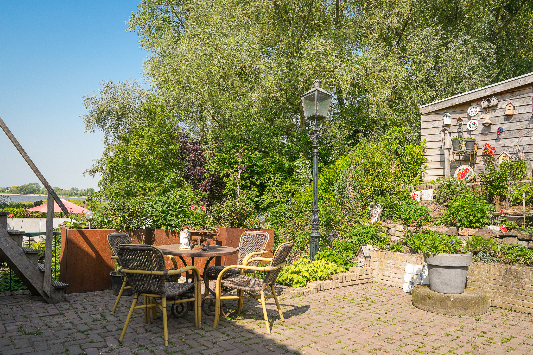 The garden, with various terraces, a wood storage area, lovely beech hedges, and an old high-stem fruit tree, is planted to withstand potential river flooding in winter. The solid retaining wall installed by the owners ensures safety while living near the water.