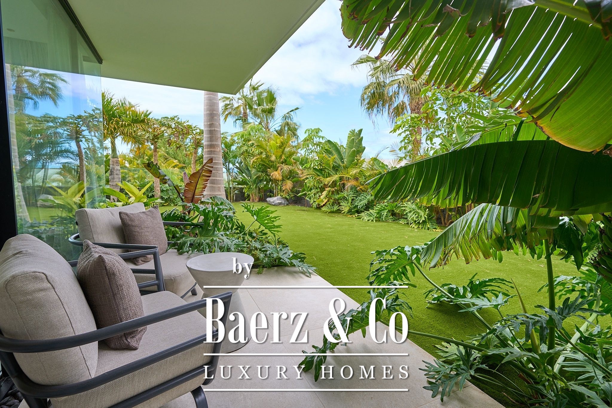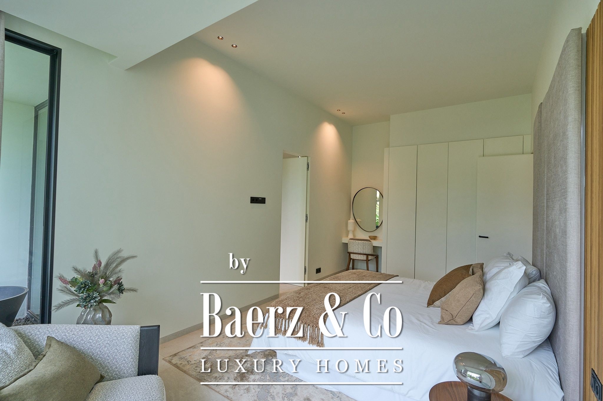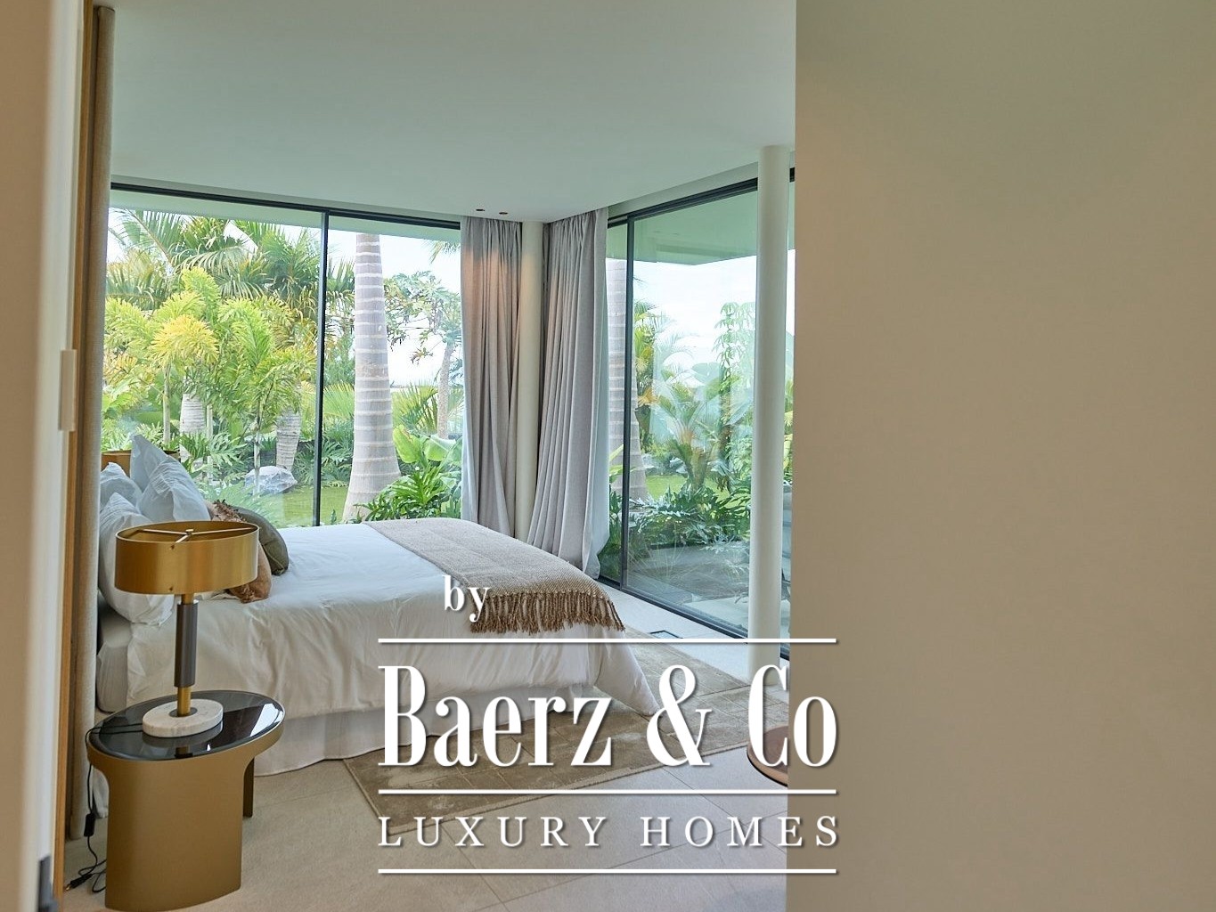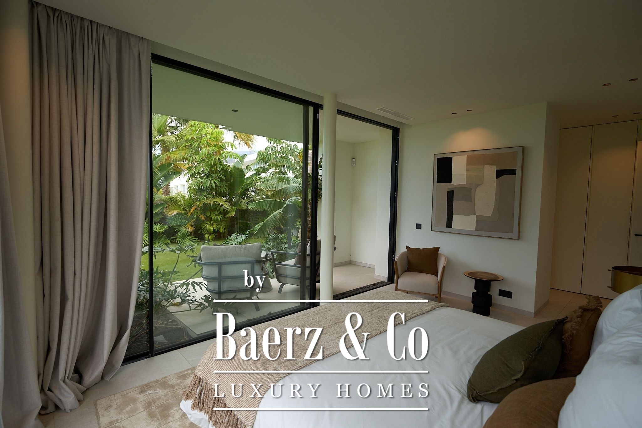 De villa beschikt over vier elegante slaapkamers met eigen badkamer, elk met inbouwkasten en directe toegang tot de tropische tuin, wat zorgt voor een intieme en ontspannen sfeer. Op de bovenverdieping bevindt zich een ruime woon- en eetkamer die uitkomt op een volledig uitgeruste moderne keuken, inclusief een wijnkelder – perfect voor wijnliefhebbers.