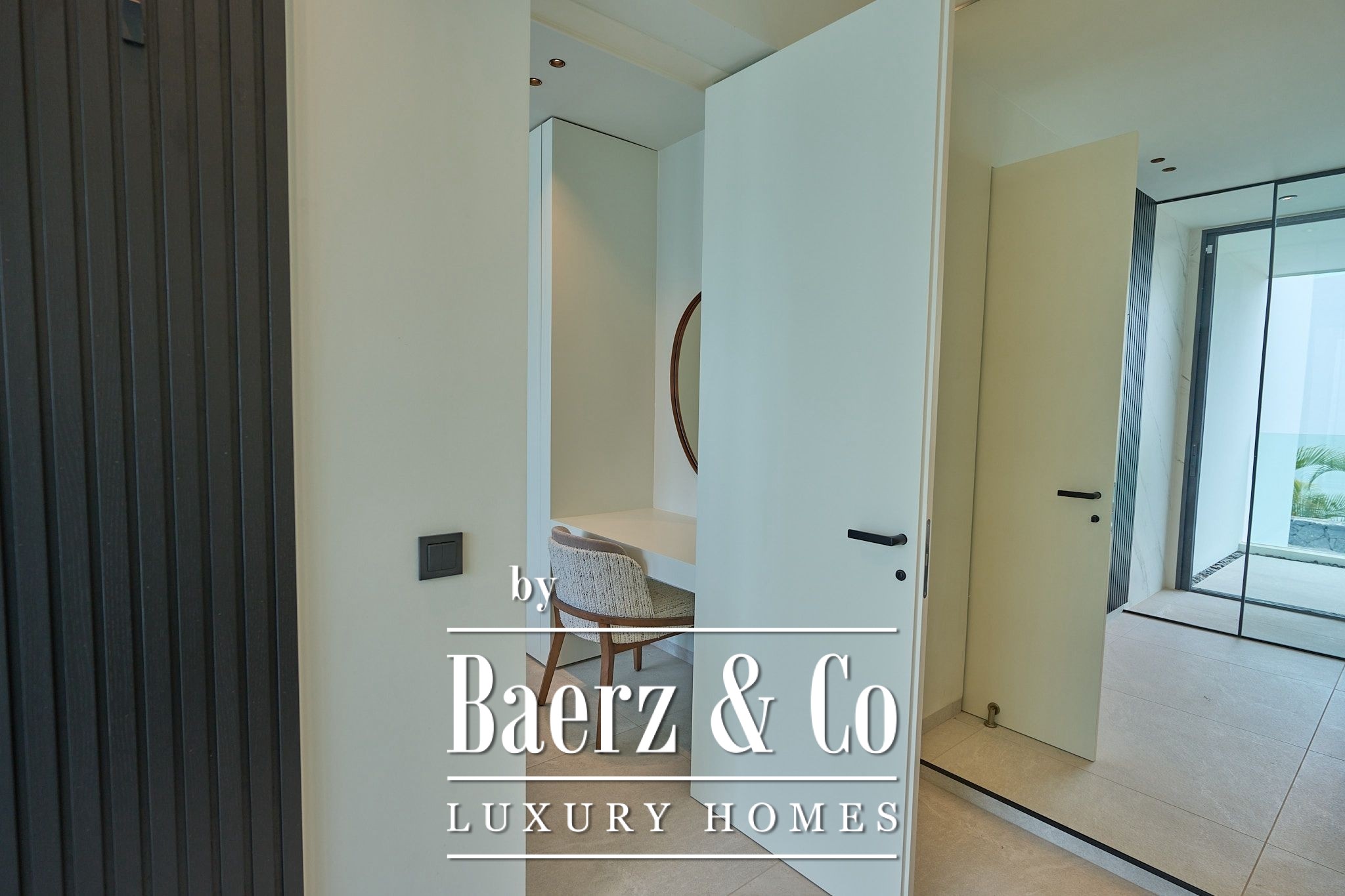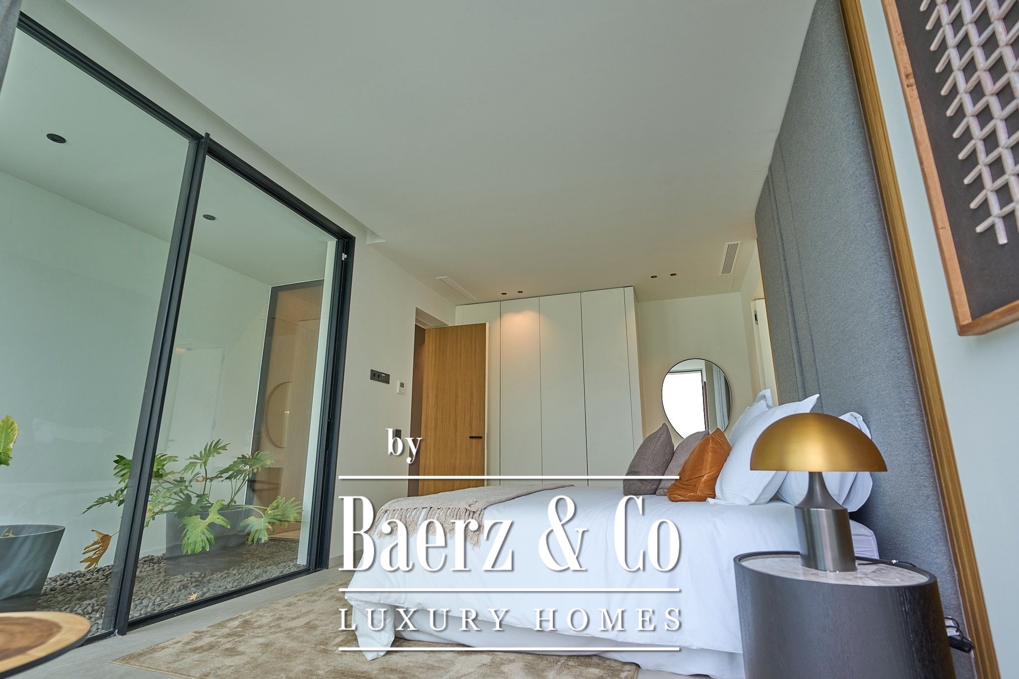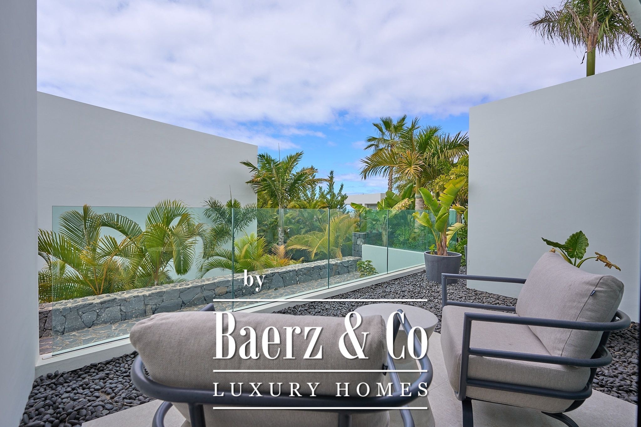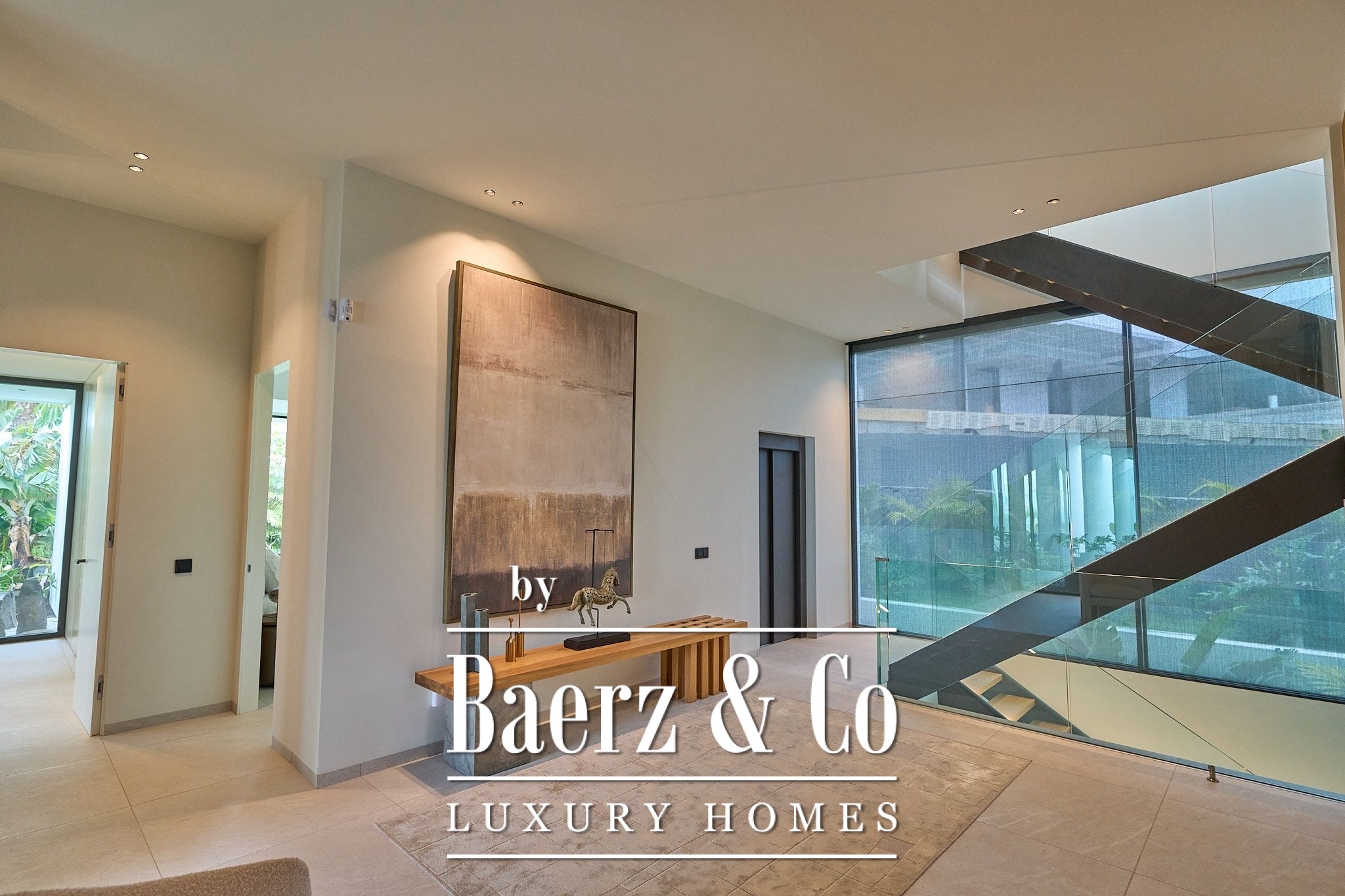 De villa beschikt over vier elegante slaapkamers met eigen badkamer, elk met inbouwkasten en directe toegang tot de tropische tuin, wat zorgt voor een intieme en ontspannen sfeer. Op de bovenverdieping bevindt zich een ruime woon- en eetkamer die uitkomt op een volledig uitgeruste moderne keuken, inclusief een wijnkelder – perfect voor wijnliefhebbers.