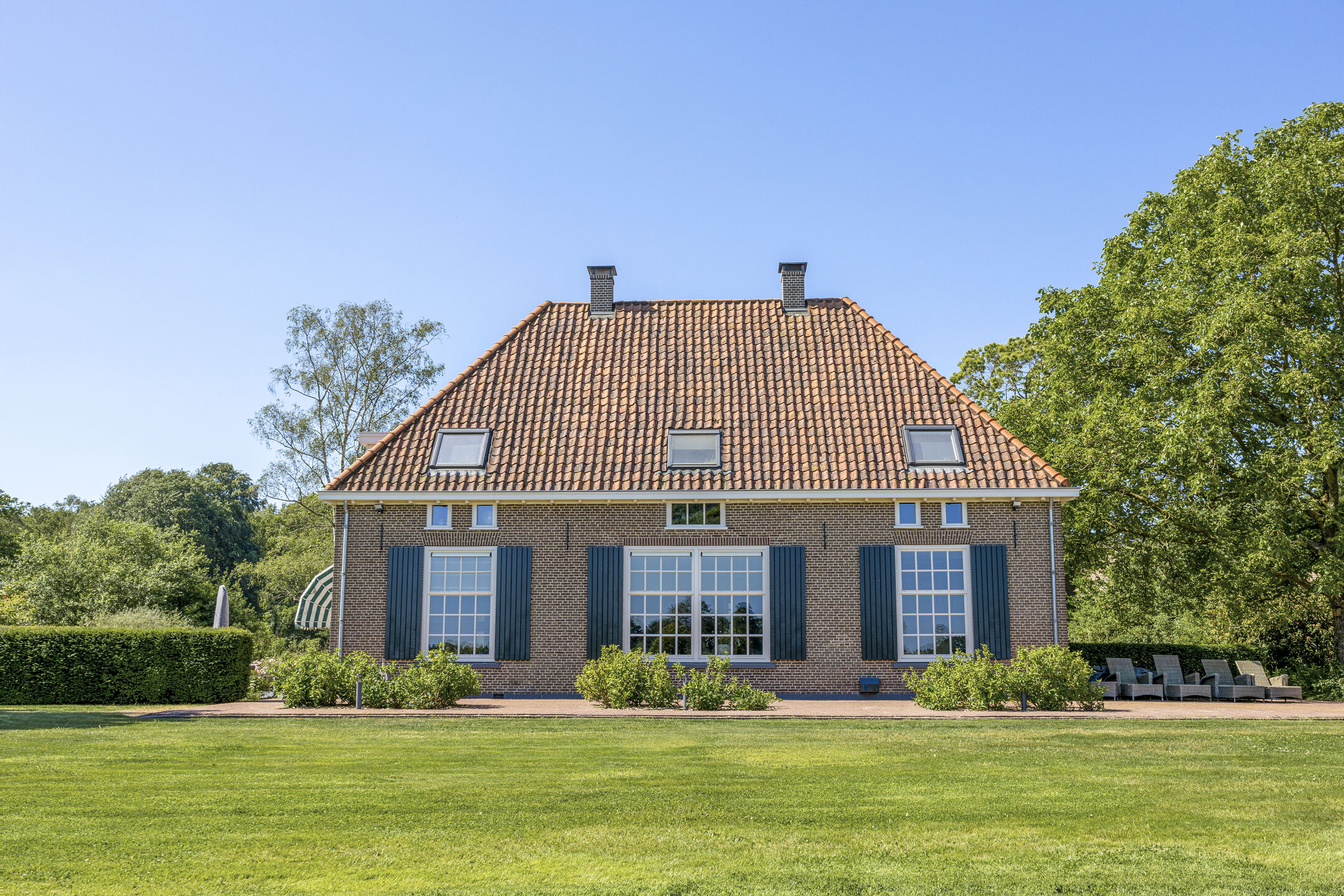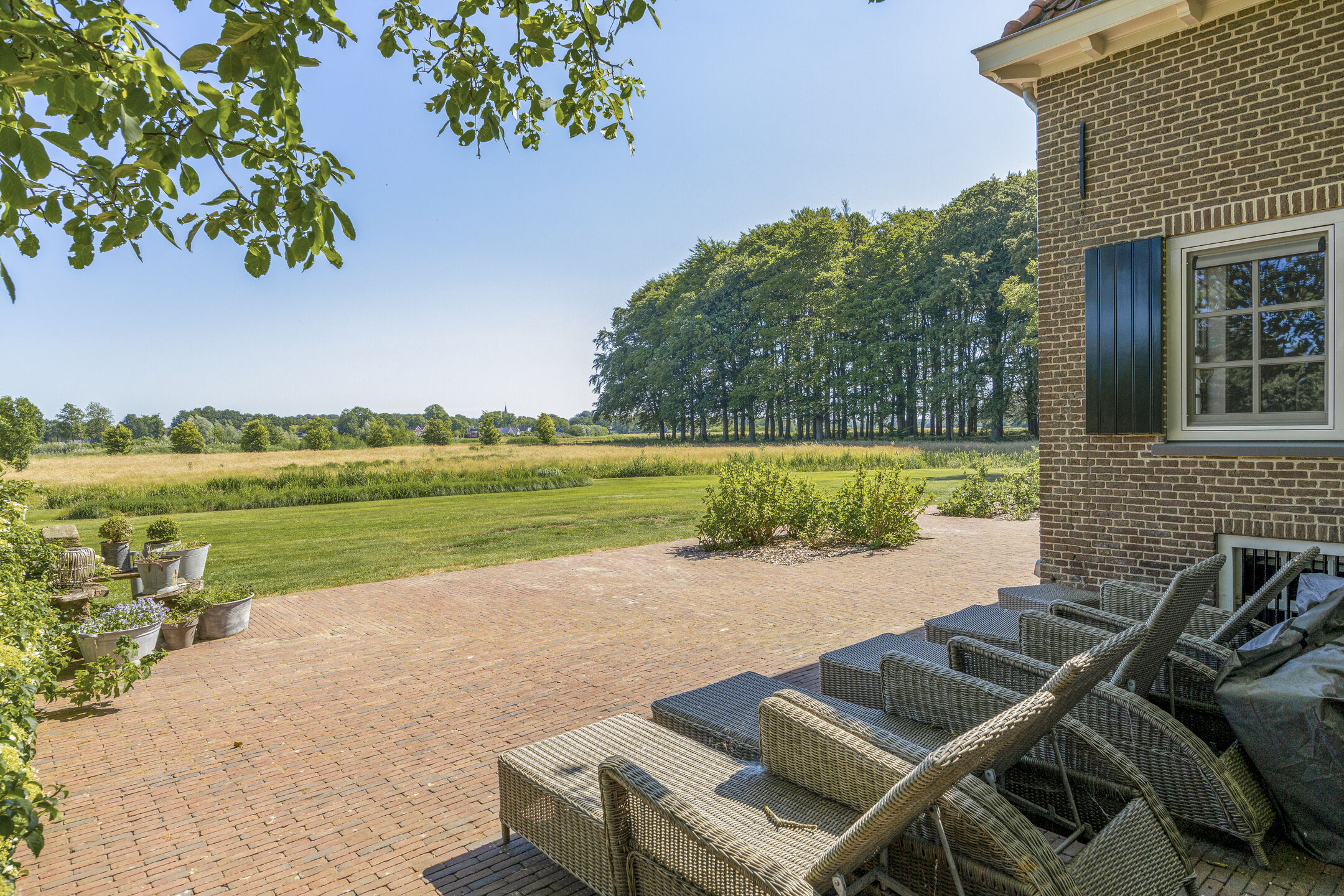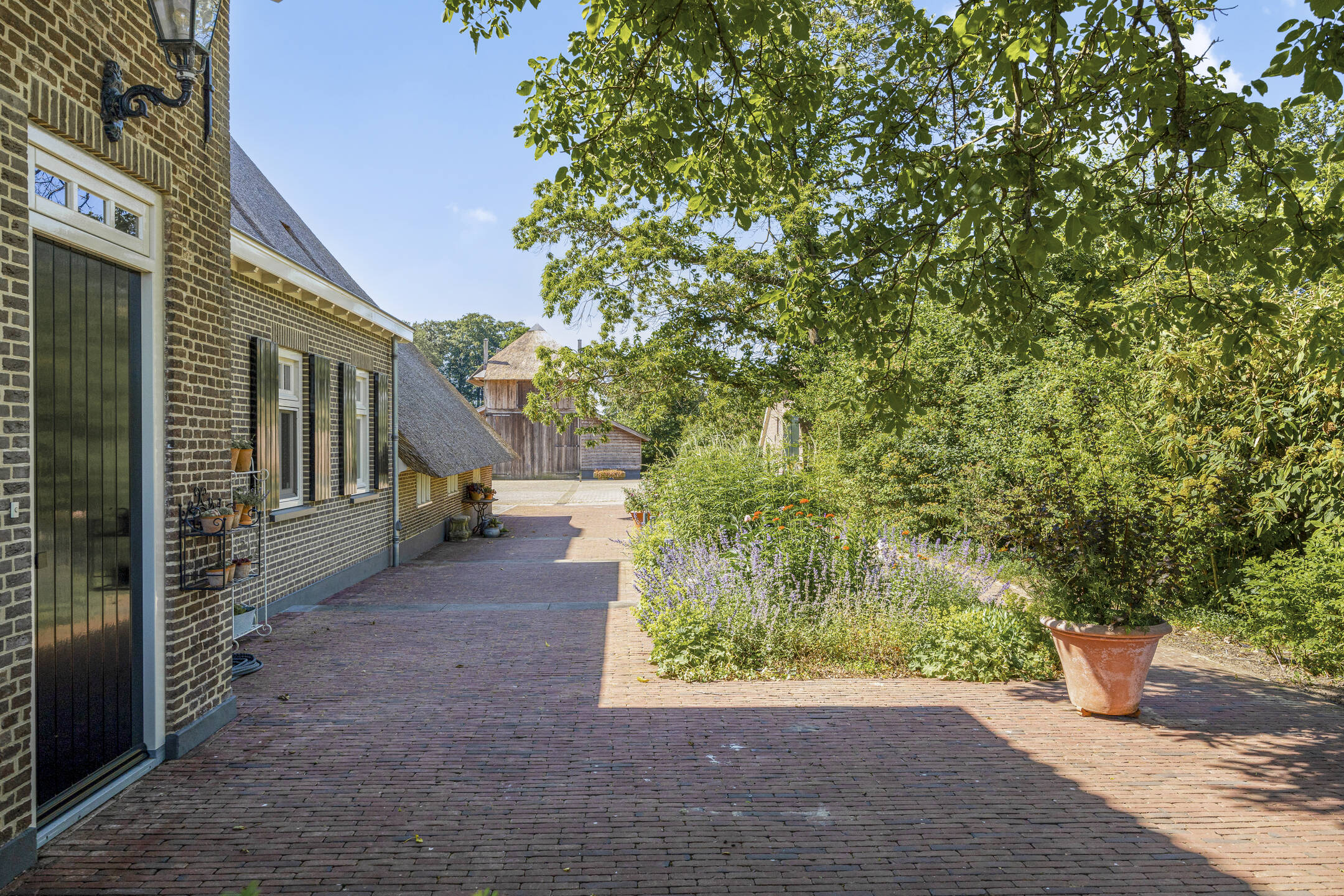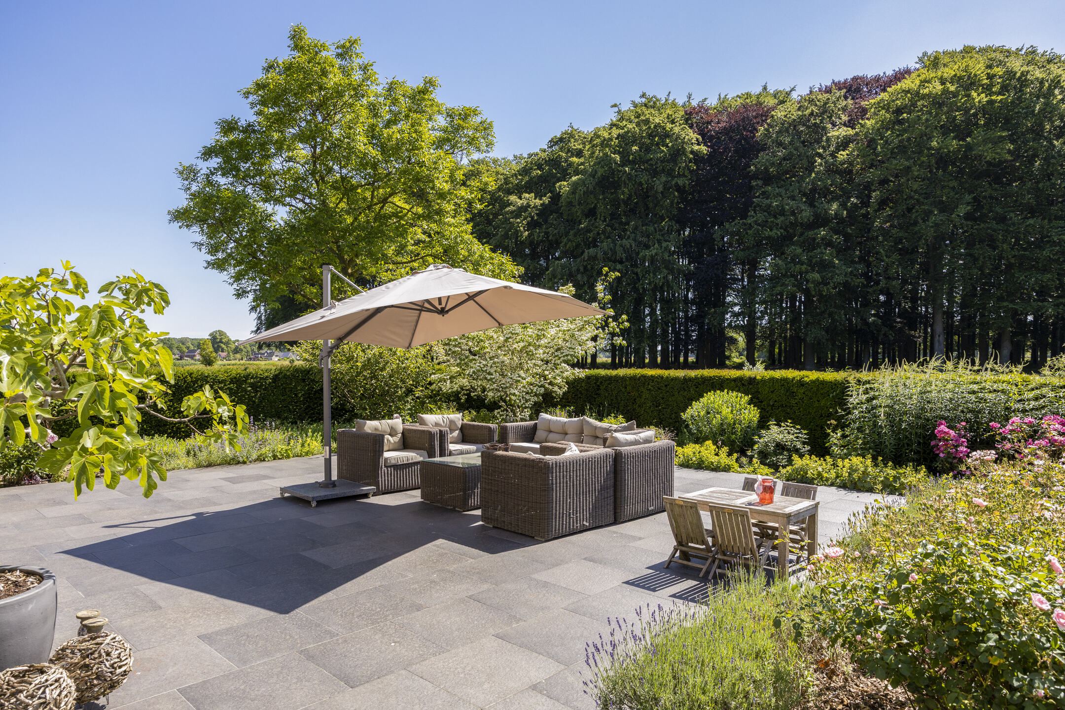 Voor de keuken ligt het heerlijke zonneterras, met rozenperk en taxushaag. Perfect voor zonnige lunches en diners, of gewoon lekker de hele dag luieren in de loungeset.
