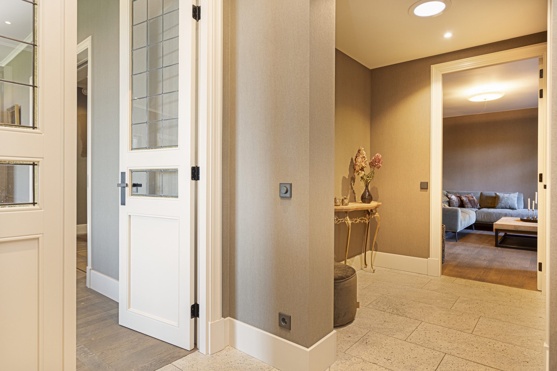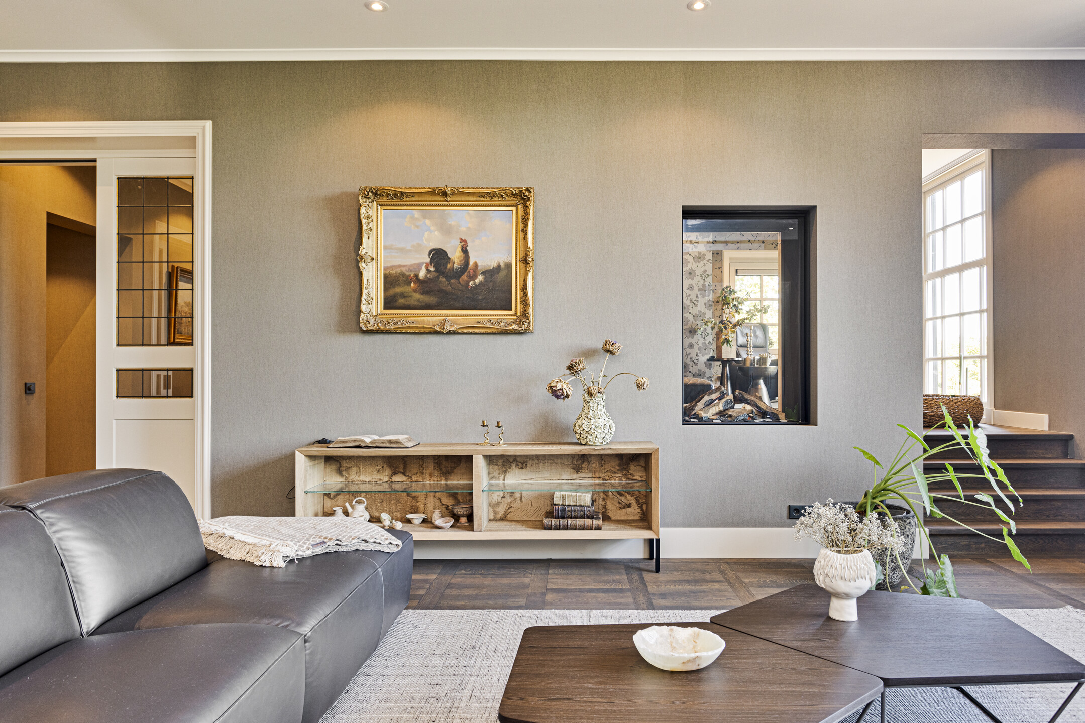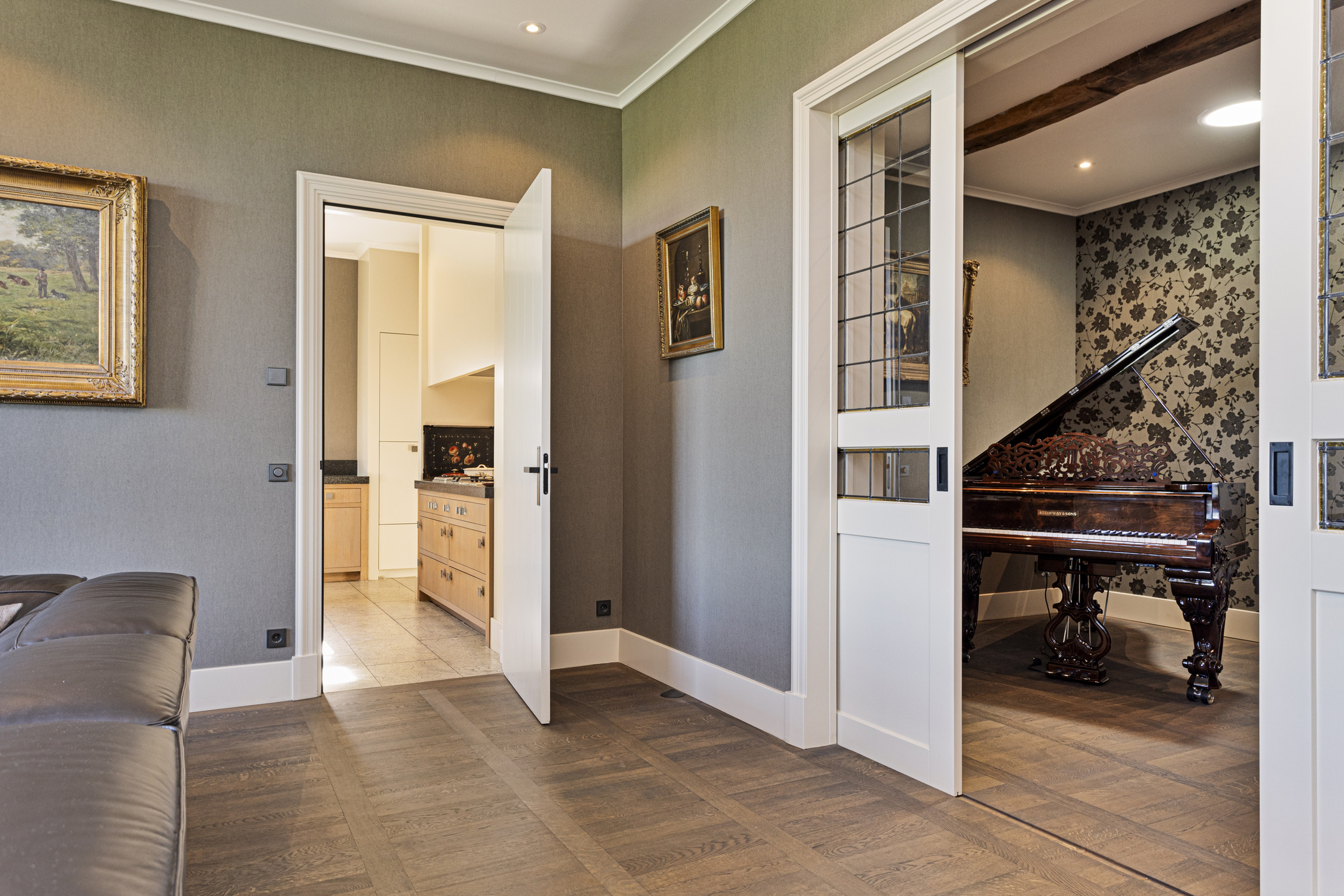 De living heeft een schitterende vloer; het is een oude kasteelvloer uit het Franse chateau van de vorige eigenaars. De huidige bewoners hebben hem mooi laten opschuren en gecoat met een verfijnde grijze vloerolie, waardoor ze naadloos in het eigentijdse interieur passen. De muziekkamer is een ruimte en-suite, gescheiden van de living middels schuifdeuren, en heeft nu de rol van een ouderwets kunstkabinet, maar dan wél eentje waarvan het binnenklimaat geheel naar wens aan te passen is. Heeft u nu geen Steinway of kunstcollectie om hier tentoon te stellen, dan is dit een heerlijke werkkamer, bibliotheek, bioscoop of eetkamer. Aansluitend links, met zicht op de tuin en het zijterras, de opkamer, die de gashaard deelt met de living. Een heerlijk hoekje om weg te kruipen met een goed boek.