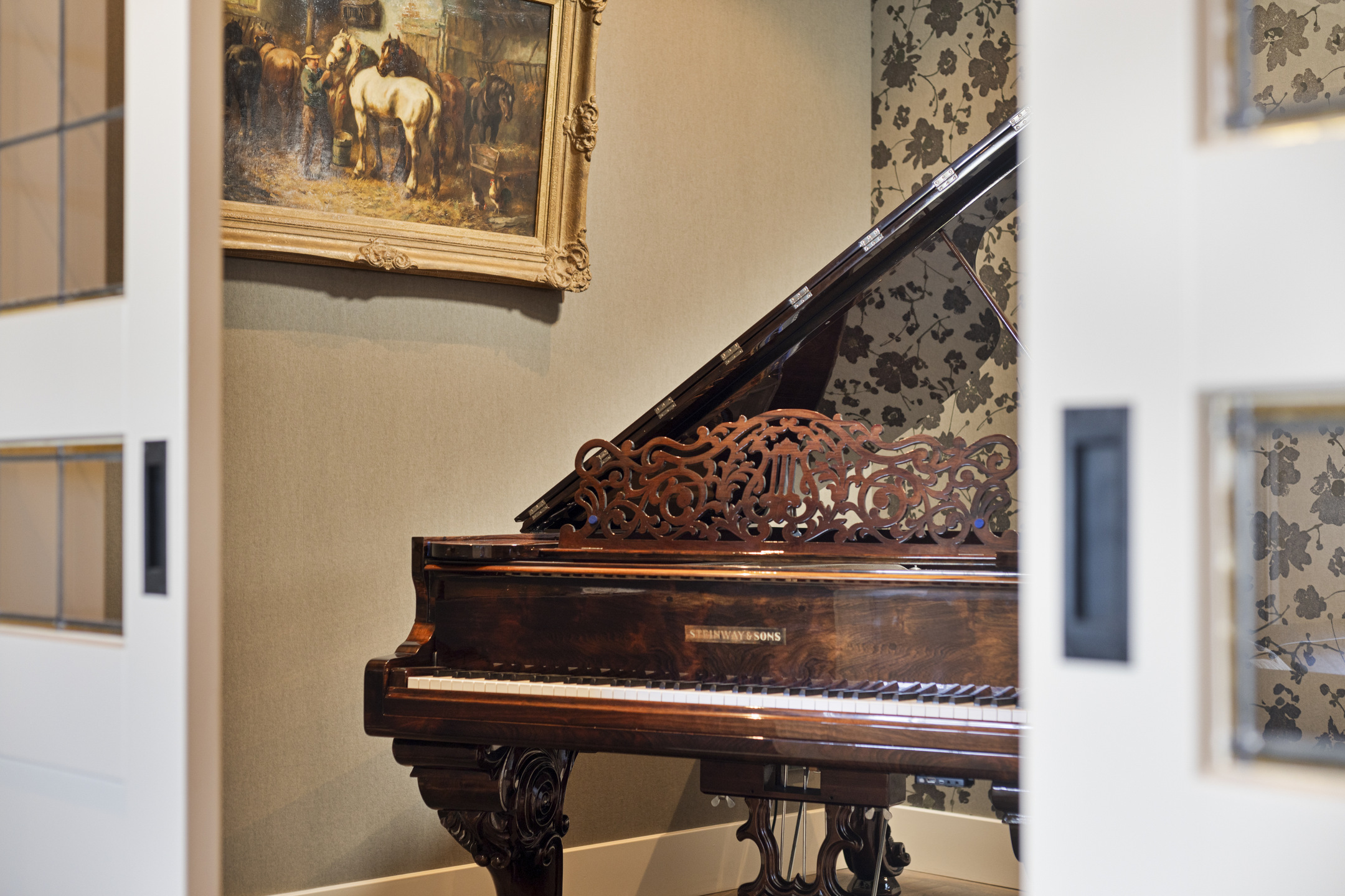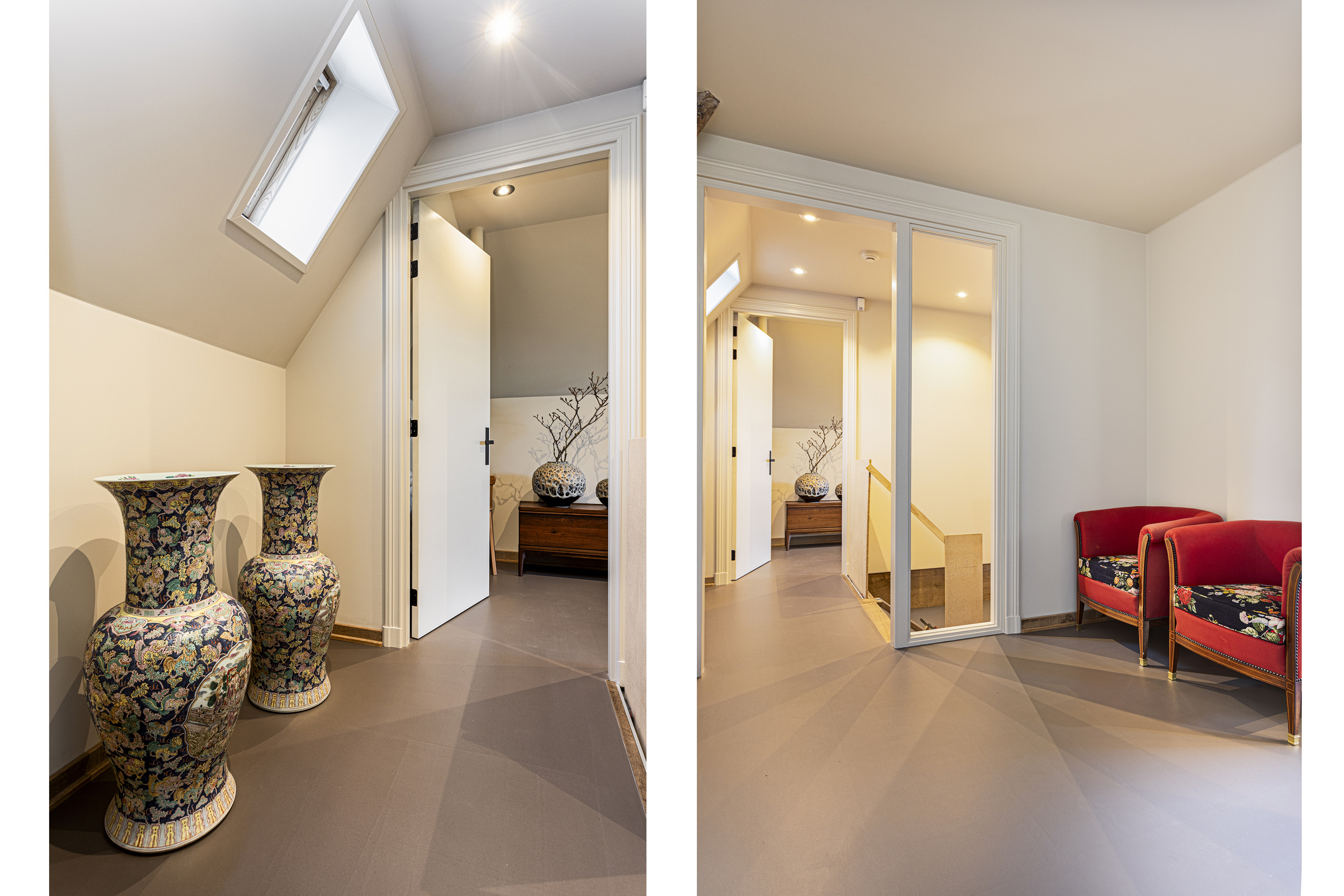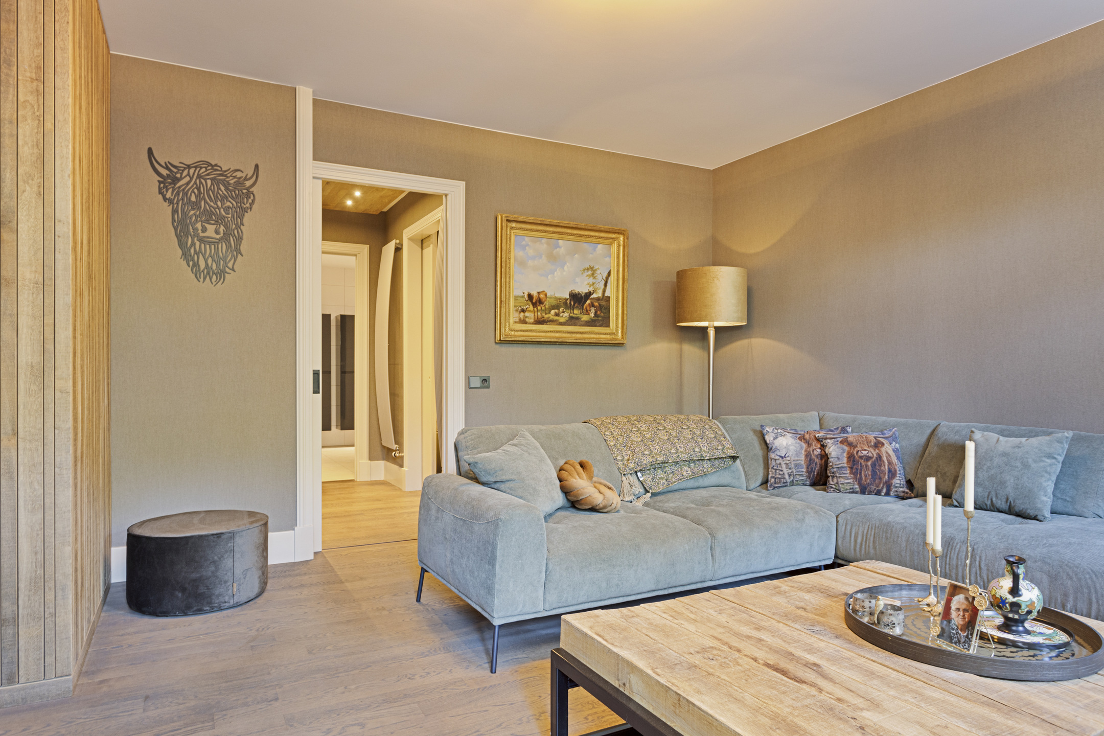 De living heeft een schitterende vloer; het is een oude kasteelvloer uit het Franse chateau van de vorige eigenaars. De huidige bewoners hebben hem mooi laten opschuren en gecoat met een verfijnde grijze vloerolie, waardoor ze naadloos in het eigentijdse interieur passen. De muziekkamer is een ruimte en-suite, gescheiden van de living middels schuifdeuren, en heeft nu de rol van een ouderwets kunstkabinet, maar dan wél eentje waarvan het binnenklimaat geheel naar wens aan te passen is. Heeft u nu geen Steinway of kunstcollectie om hier tentoon te stellen, dan is dit een heerlijke werkkamer, bibliotheek, bioscoop of eetkamer. Aansluitend links, met zicht op de tuin en het zijterras, de opkamer, die de gashaard deelt met de living. Een heerlijk hoekje om weg te kruipen met een goed boek.