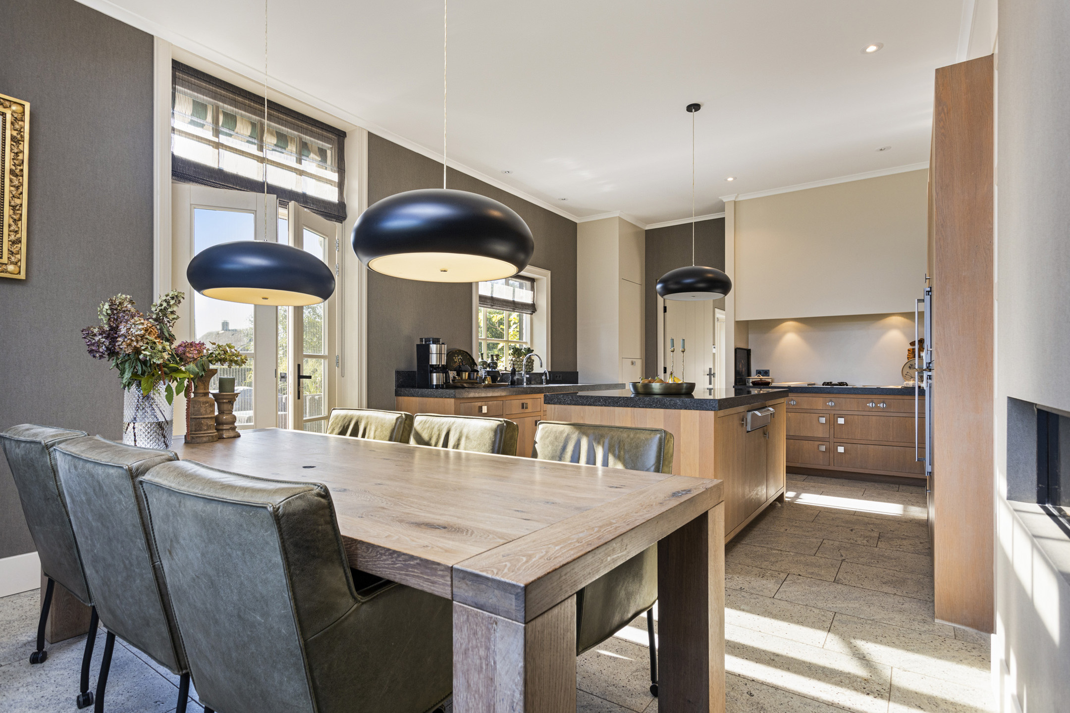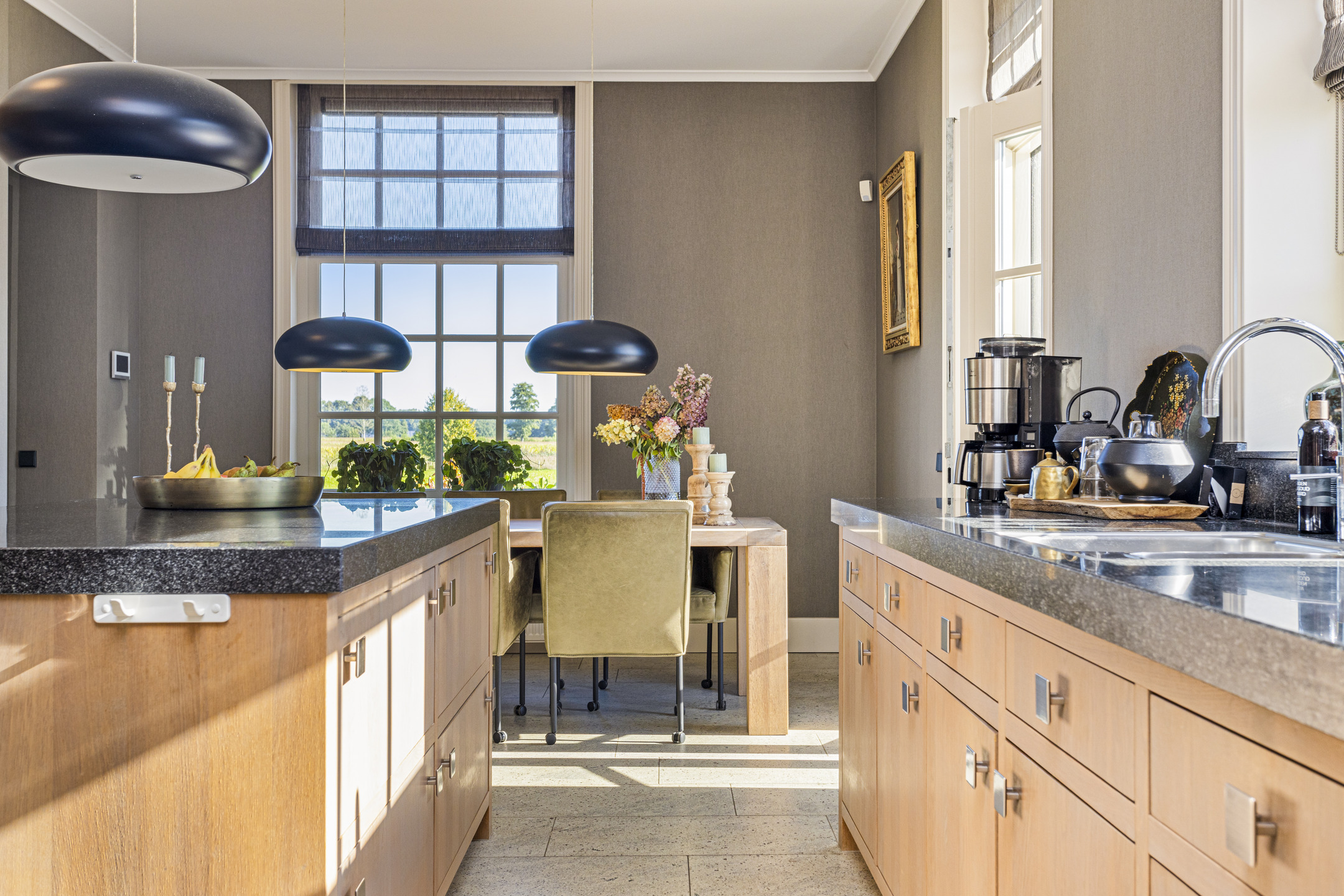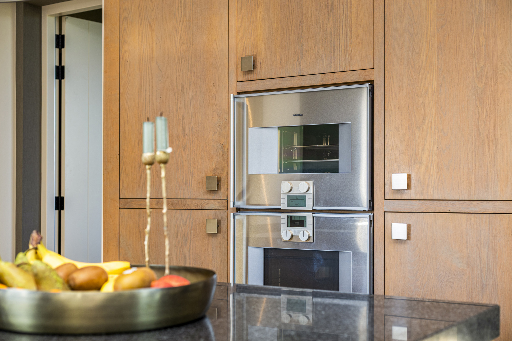 De keuken is een echt uit de kunst: geheel op maat gemaakt en samengesteld door een keukenstudio. De grote keuken is voorzien van zware eikenhouten fronten en granieten werkbladen. Alle inbouwapparatuur is van Gaggenau, wat garant staat voor optimaal design en functie. Er is een apparatenwand met dubbele ijskasten en een stoom- en een heteluchtoven. Aan de andere kant, met uitzicht op het zonnige zijterras een groot werkblad met dubbele spoelbak en een vijf-in-één kokendwaterkraan. Op de kop, in de eigentijdse koof, het fornuis met wokbrander, plancha en vier grote gaspitten.