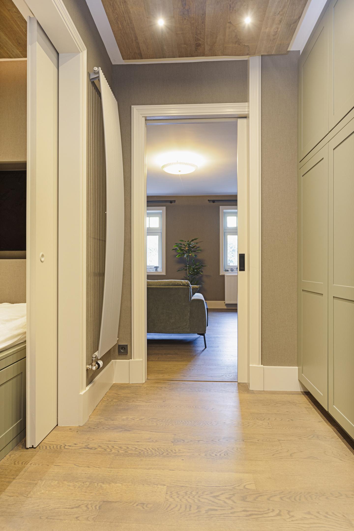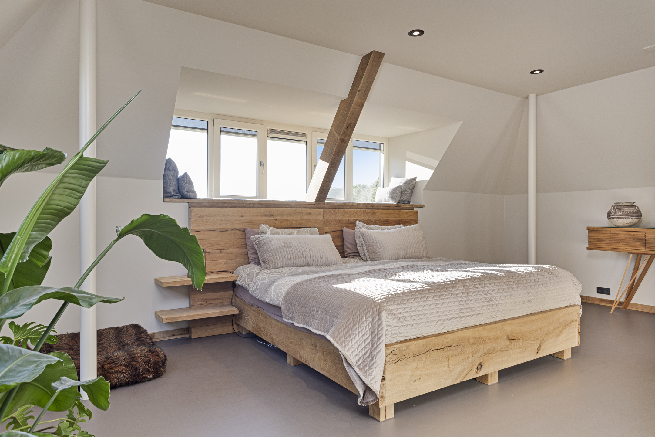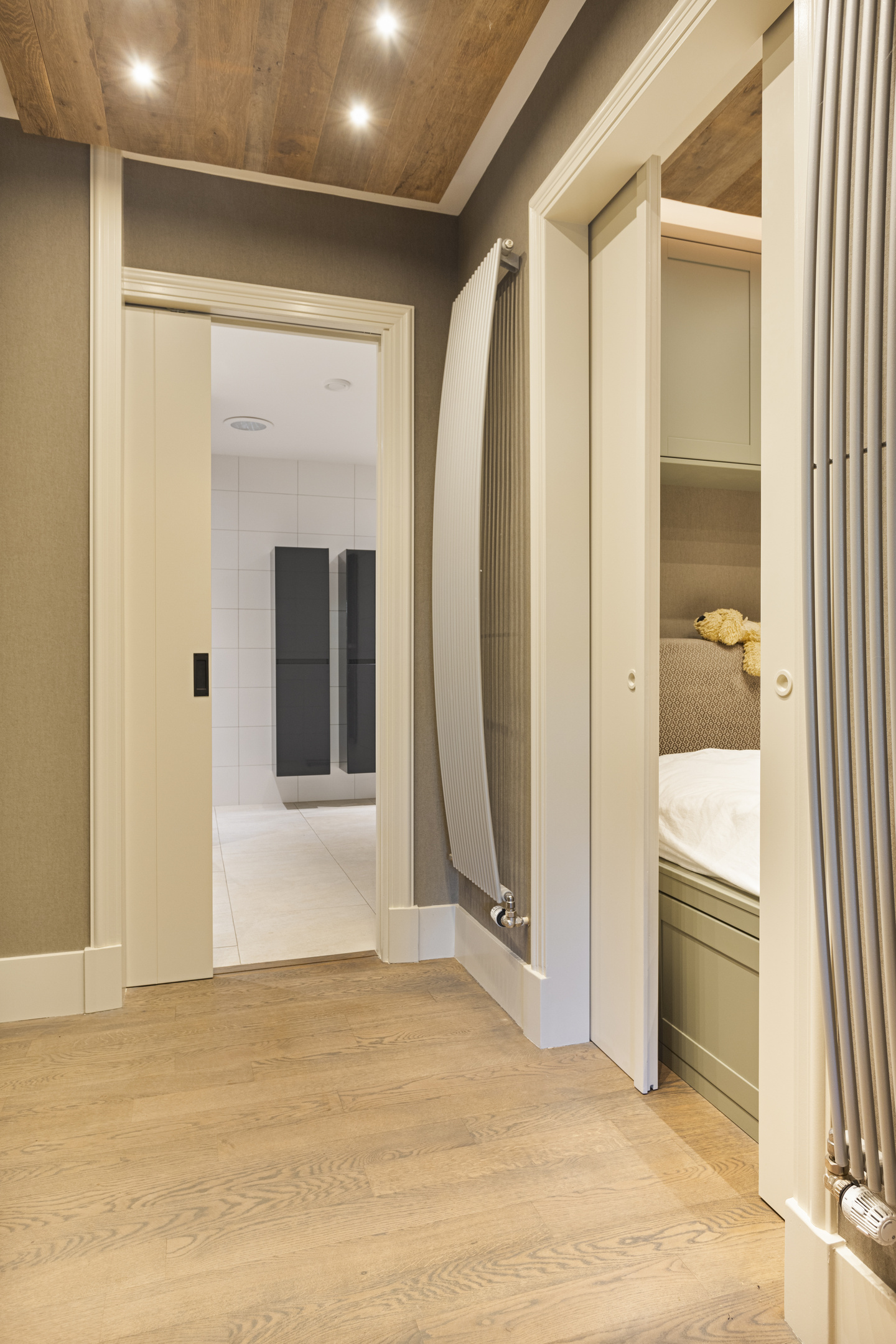 De walk-in closet heeft gevlamde houten schuifdeuren en de slaapkamer is licht door de grote raampartijen. Door de strakke vormgeving heeft deze ruimte een bijzonder serene sfeer.