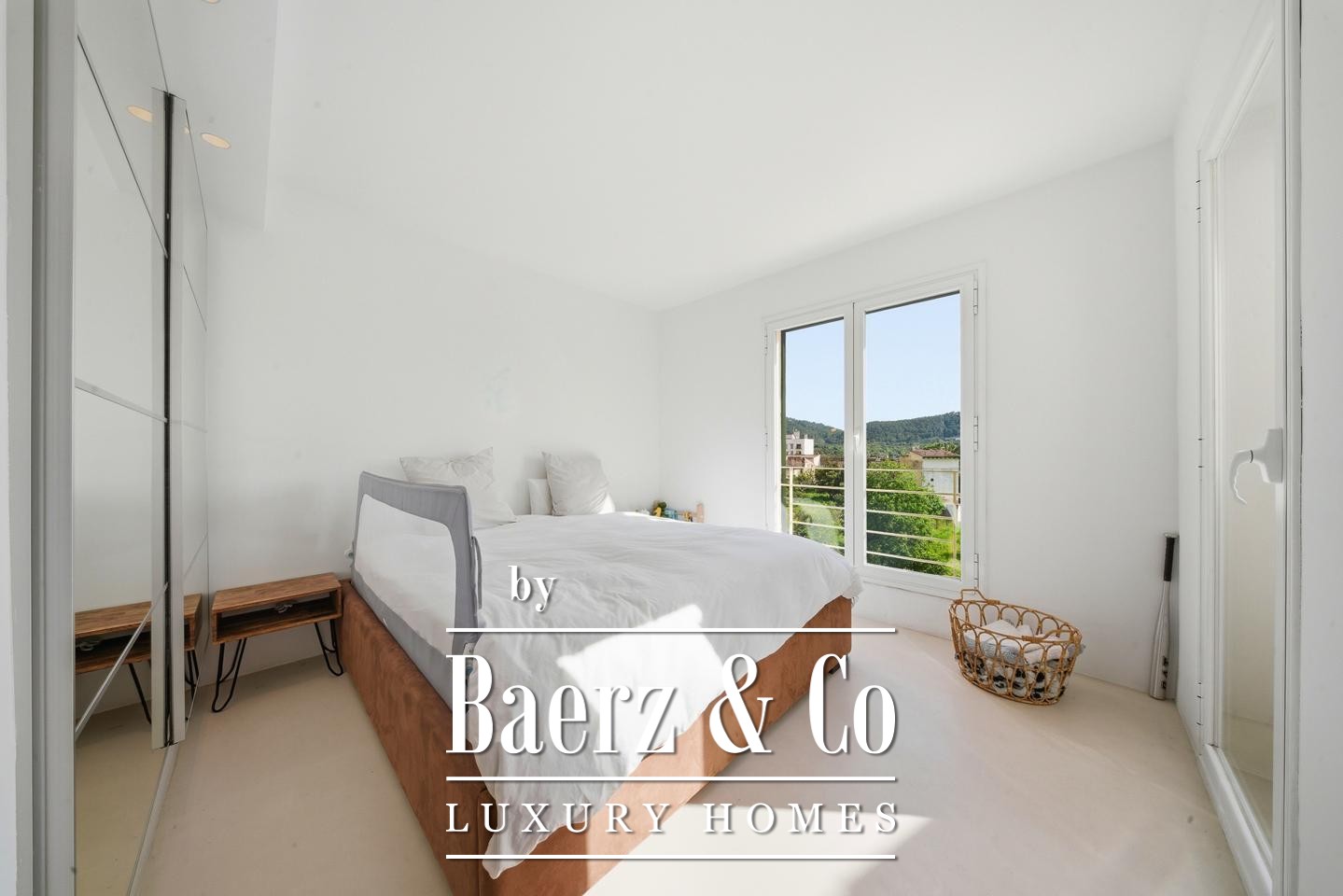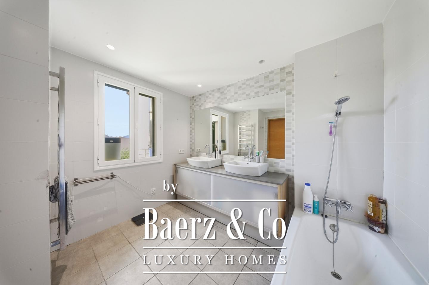 Belangrijke kenmerken zijn drie lichte slaapkamers en twee badkamers, met een flexibele kleedkamer op de bovenverdieping. Het dakterras biedt een privé-uitkijkpunt met panoramisch uitzicht, ondersteund door een fotovoltaïsch systeem. De royale tuin biedt mogelijkheden voor een zwembad in de toekomst. De ruime ondergrondse garage omvat plaats voor voertuigen, een fitnessruimte en voorzieningen voor het opladen van elektrische auto’s – een evenwicht tussen functionaliteit en modern comfort.