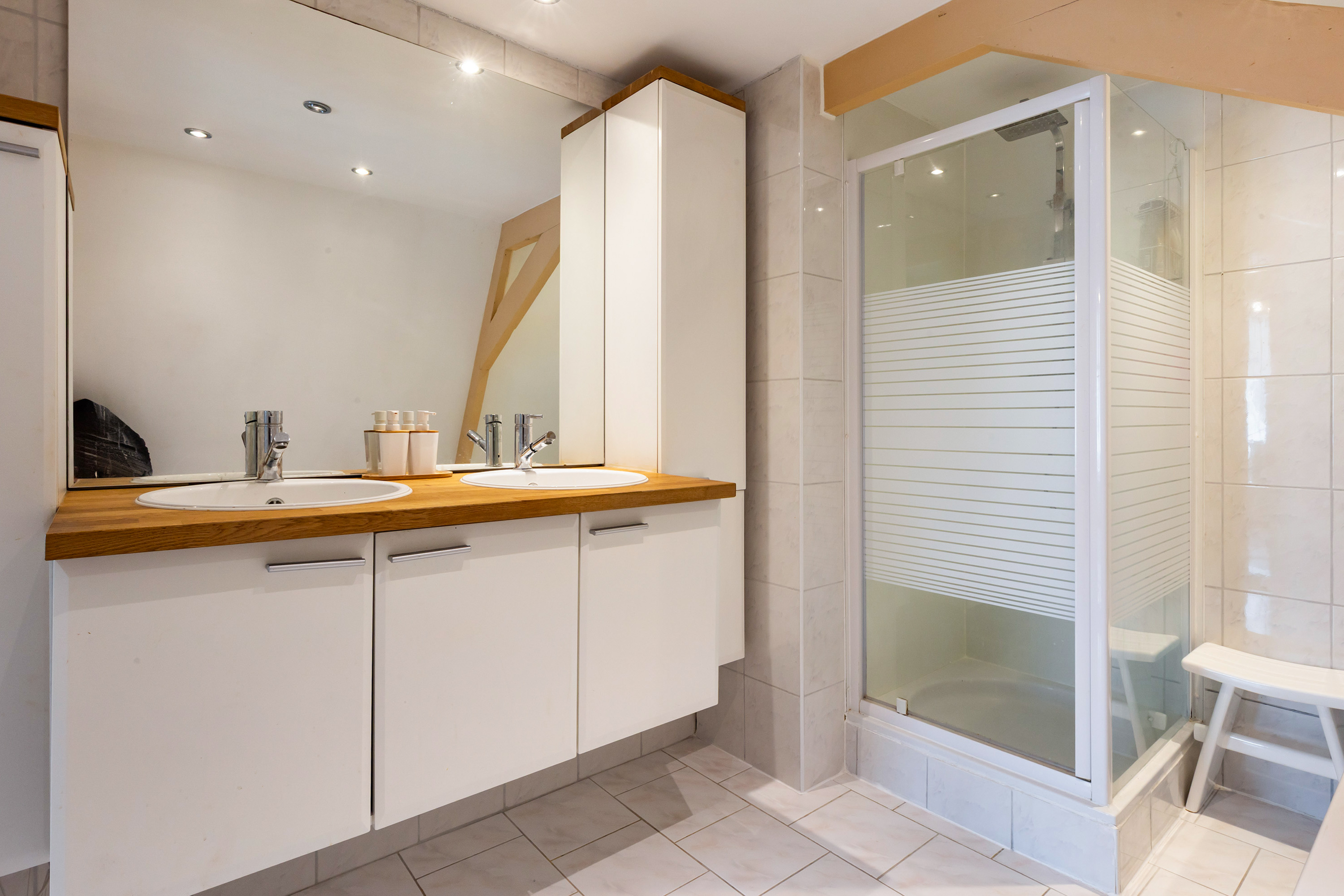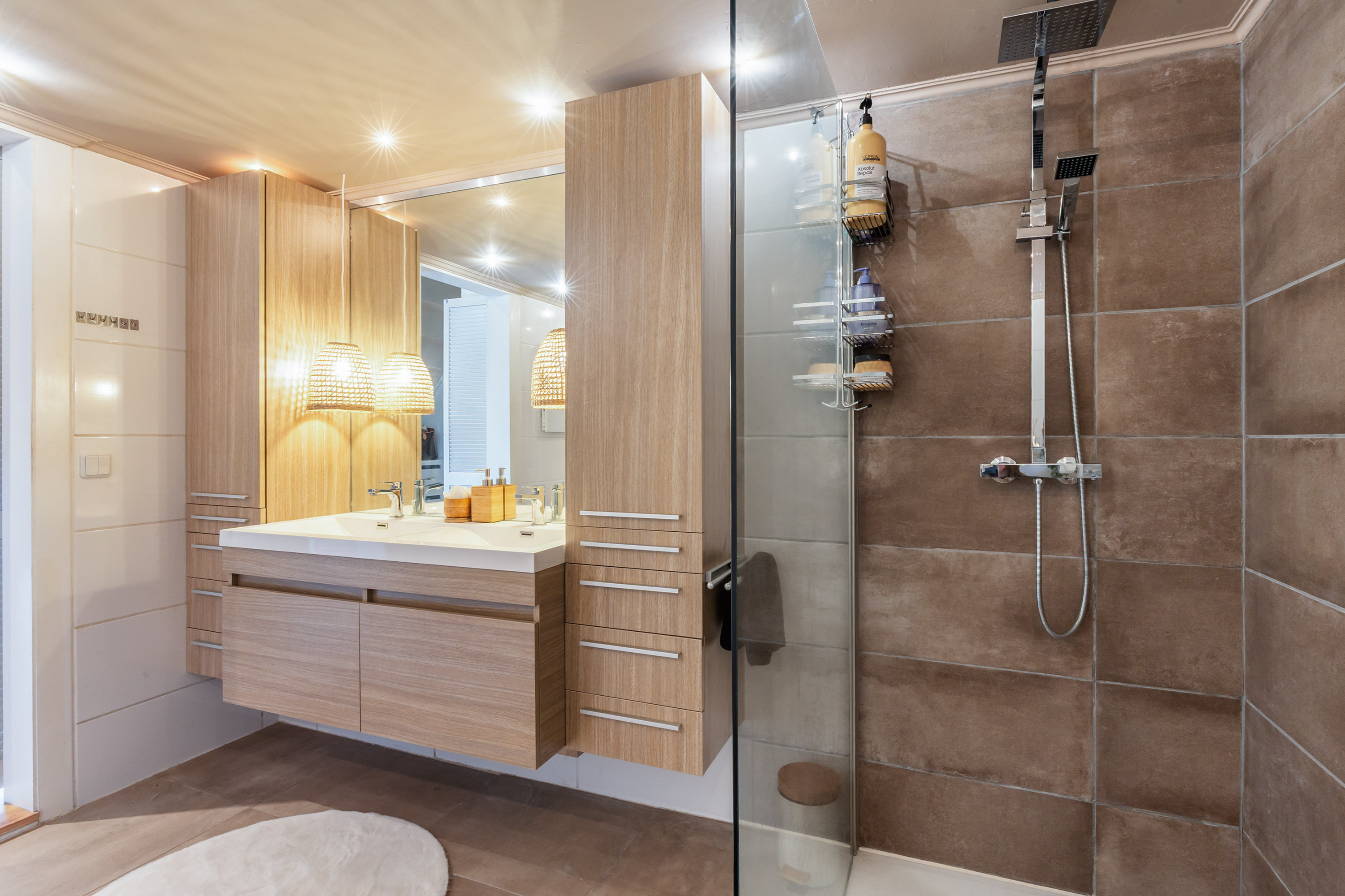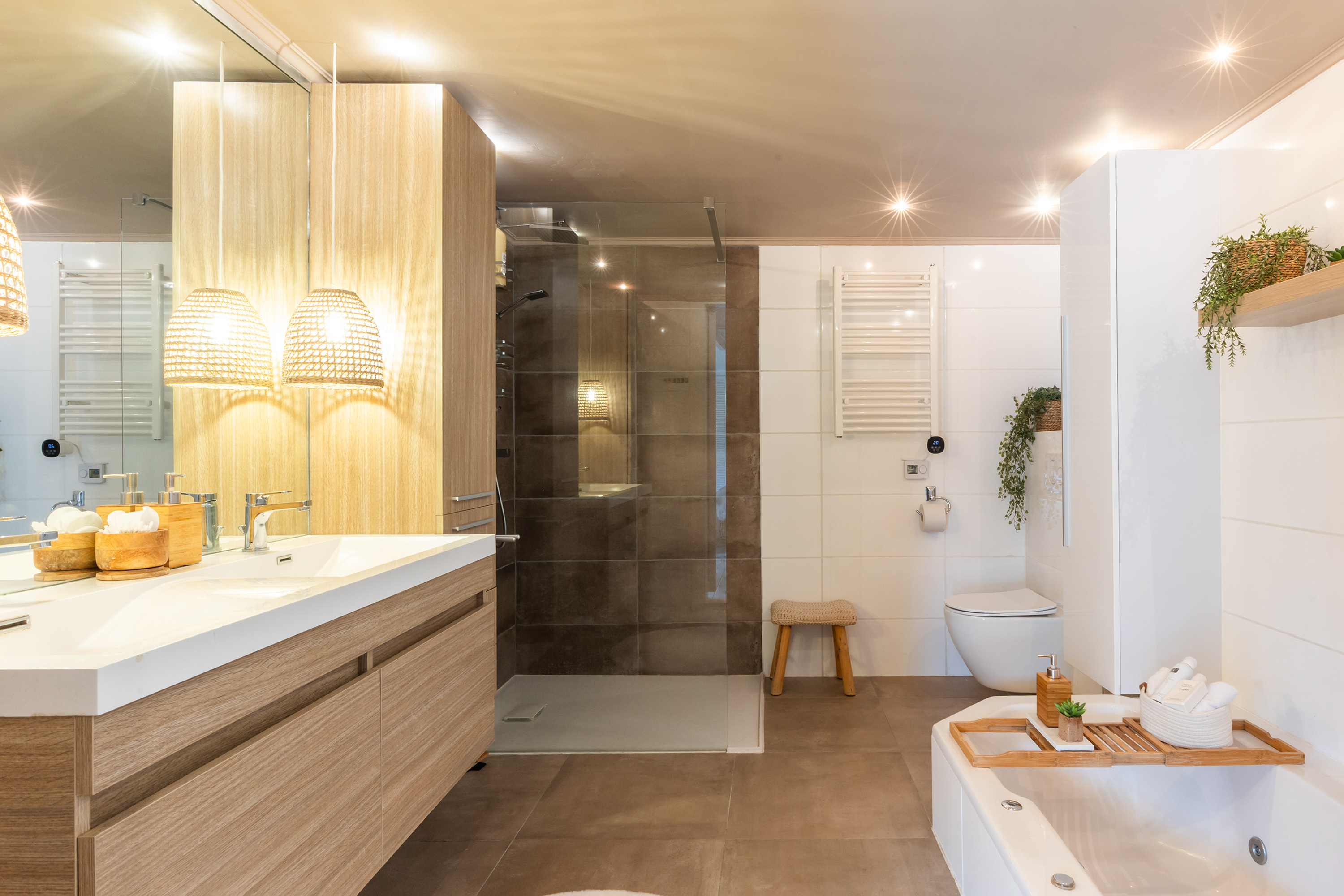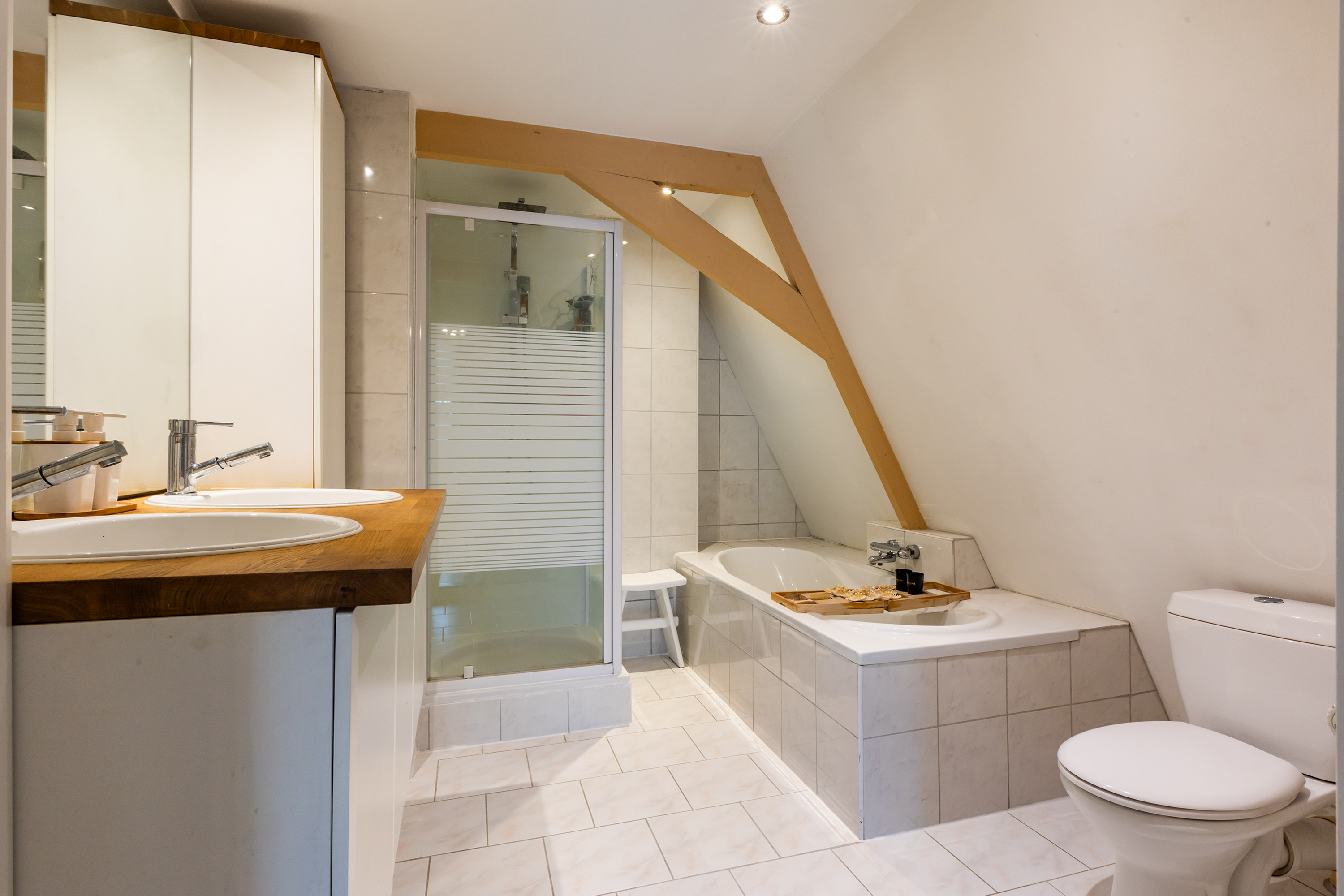 Aangrenzend bevindt zich de moderne badkamer, compleet uitgevoerd met een verdiept ligbad, een ruime inloopdouche, een wandhangend toilet en dubbele wastafels. De wanden zijn volledig betegeld en de ruimte heeft een moderne en warme uitstraling.