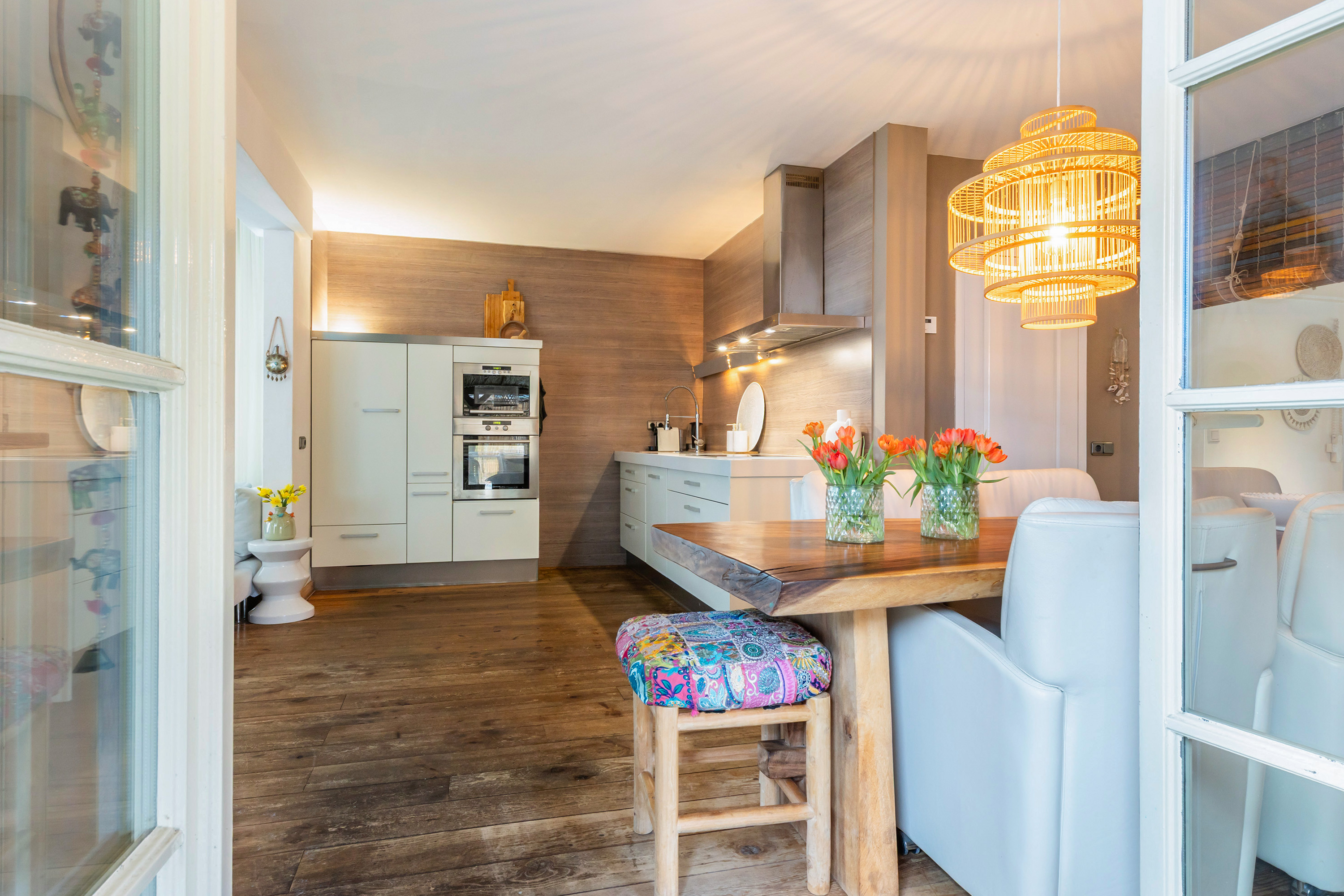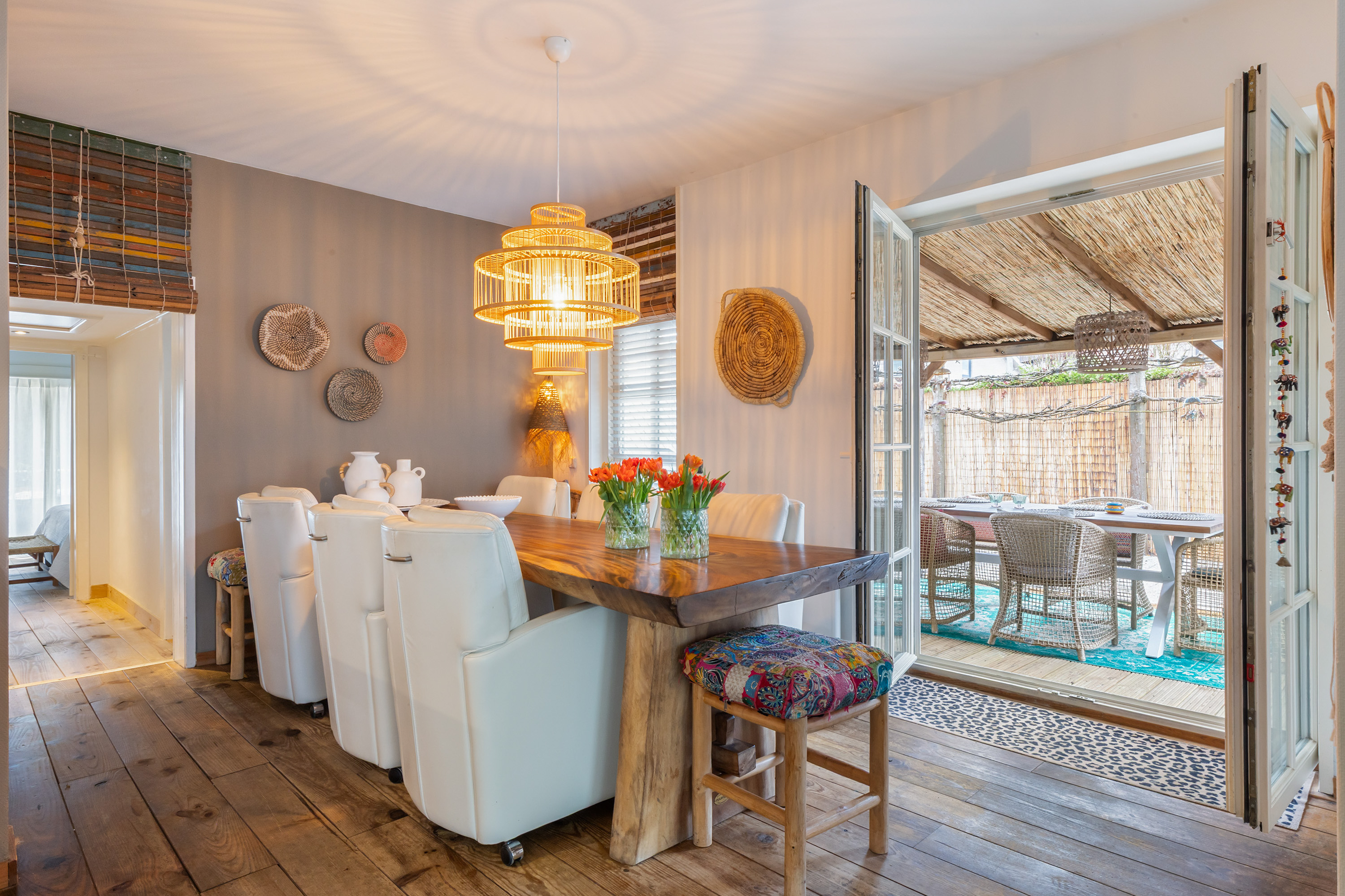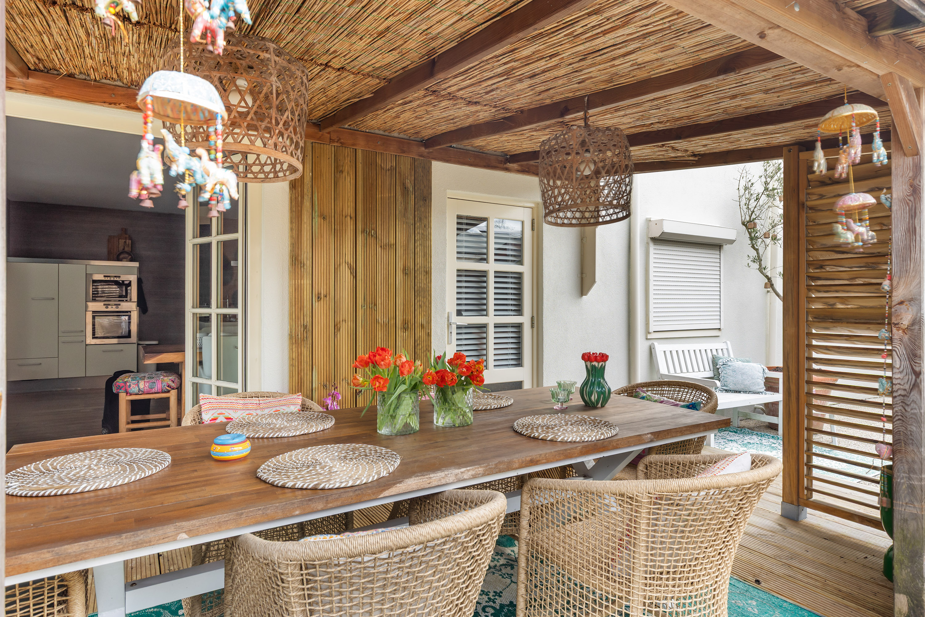 Er is ruimte voor een grote eettafel met acht stoelen en de dubbele tuindeuren verbinden de woonkeuken met de veranda in de zijtuin. Hierdoor lopen binnen en buiten naadloos in elkaar over. De veranda heeft een zonnige uitstraling door de toepassing van houten vlonders en houten louvre-schermen die tevens als zonwering dienen. Het is een heerlijke plek om een eettafel te plaatsen en beschut buiten te dineren en te genieten van mooie momenten met vrienden en familie.