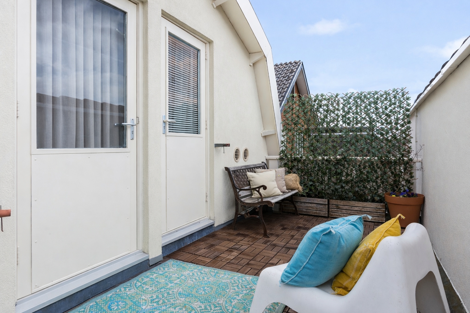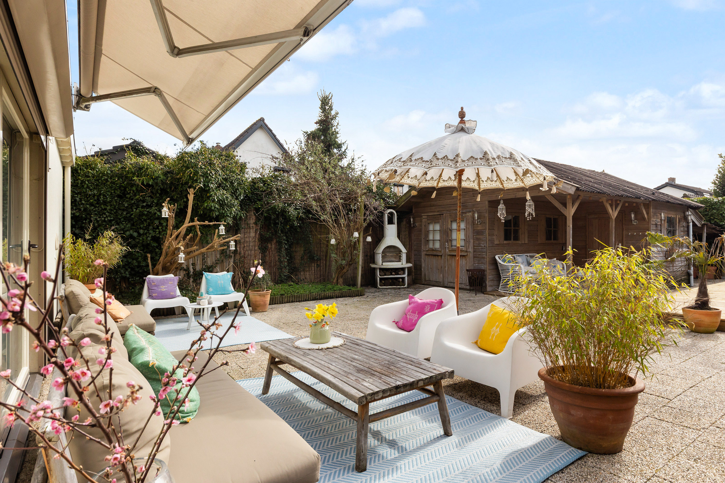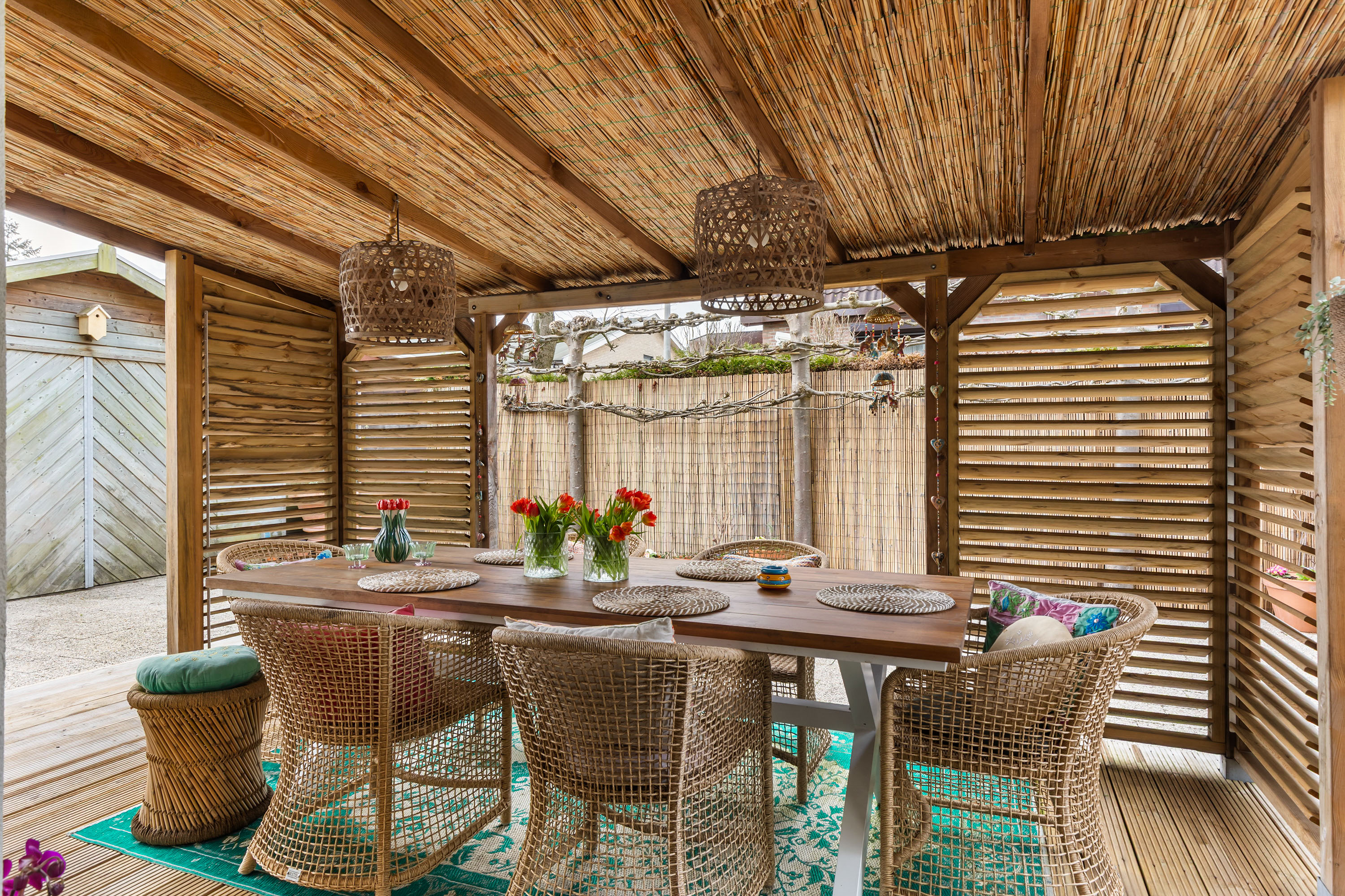 Er is ruimte voor een grote eettafel met acht stoelen en de dubbele tuindeuren verbinden de woonkeuken met de veranda in de zijtuin. Hierdoor lopen binnen en buiten naadloos in elkaar over. De veranda heeft een zonnige uitstraling door de toepassing van houten vlonders en houten louvre-schermen die tevens als zonwering dienen. Het is een heerlijke plek om een eettafel te plaatsen en beschut buiten te dineren en te genieten van mooie momenten met vrienden en familie.