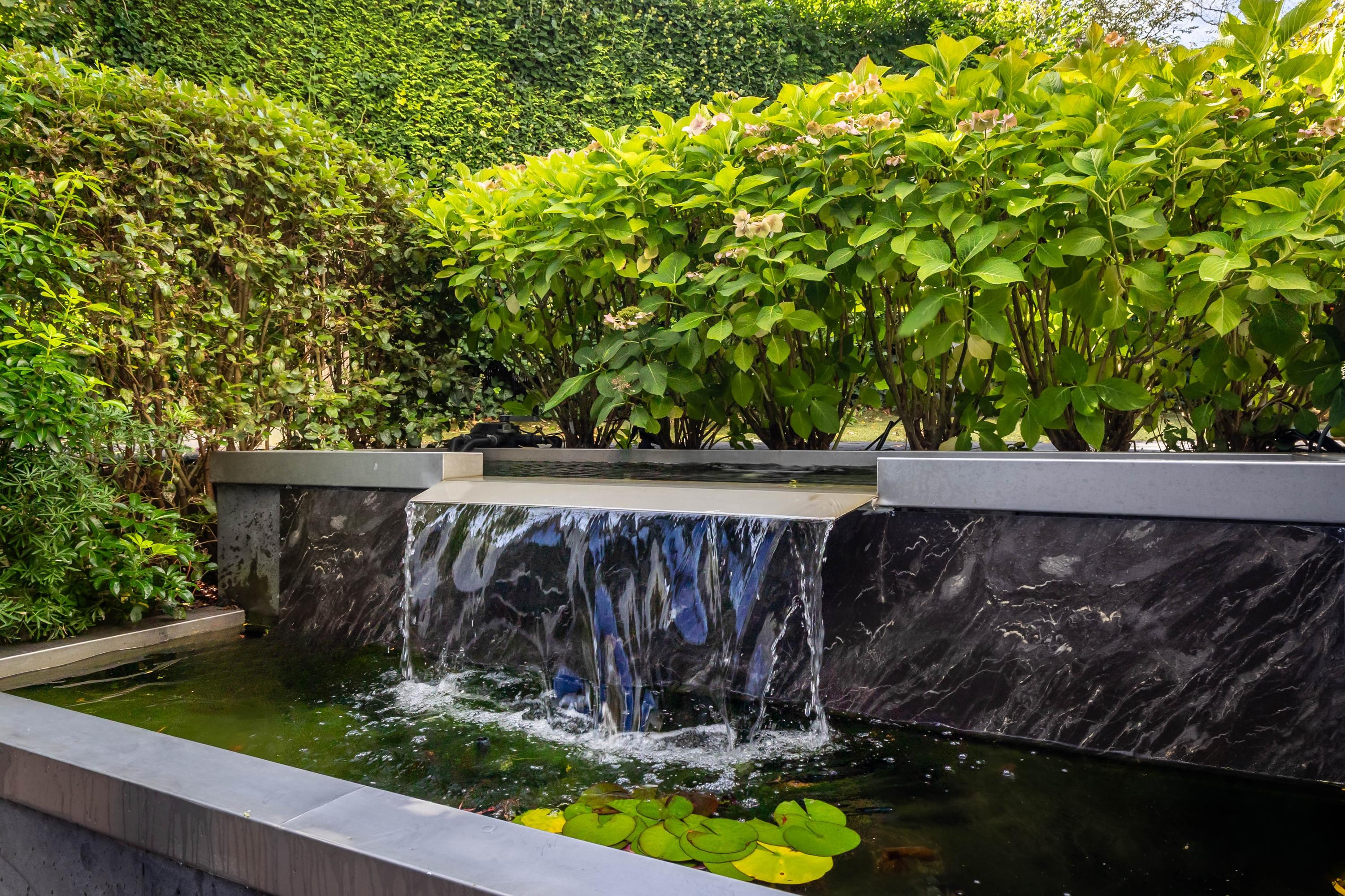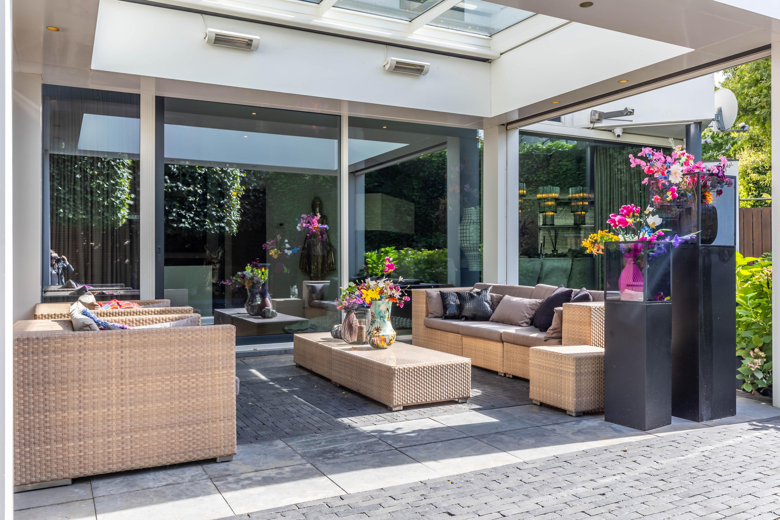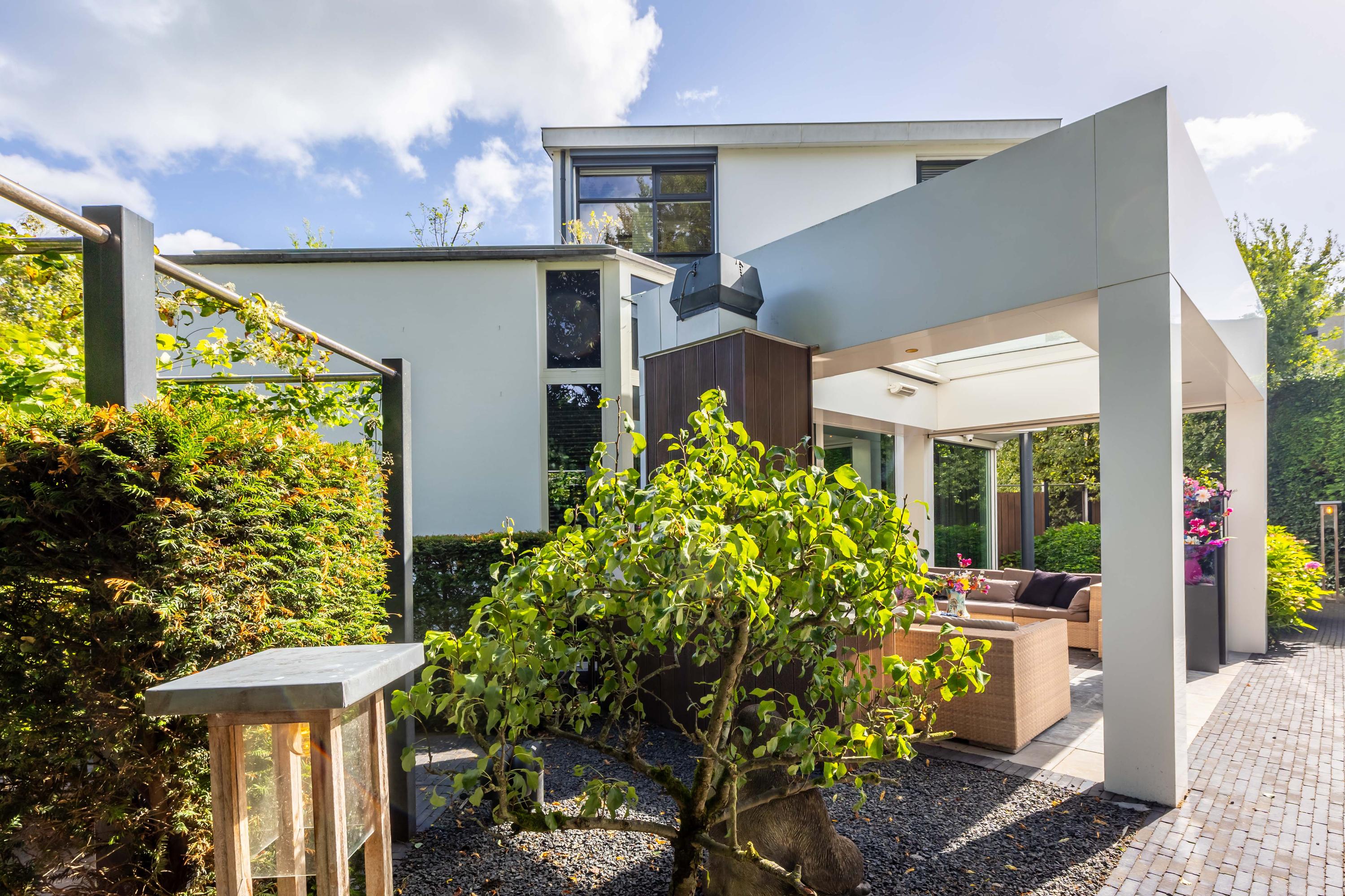 De in 2025 opnieuw aangelegde tuin is een oase van privacy en groen, gunstig gelegen op het zuidwesten. Meerdere terrassen bieden steeds een andere sfeerbeleving. De veranda is uitgevoerd met een riant hoog plafond waarin een grote lichtstraat is opgenomen. Het terras onder de veranda is daardoor aangenaam licht. Door de voorzieningen kunt u hier aangenaam in alle jaargetijden van de buitenruimte genieten met de sfeervolle open haard, een heater en windscreen. De twee balkons bieden besloten plekken om te ontspannen. De tuin beschikt over automatische beregening en is ideaal voor barbecues of lange zomeravonden.