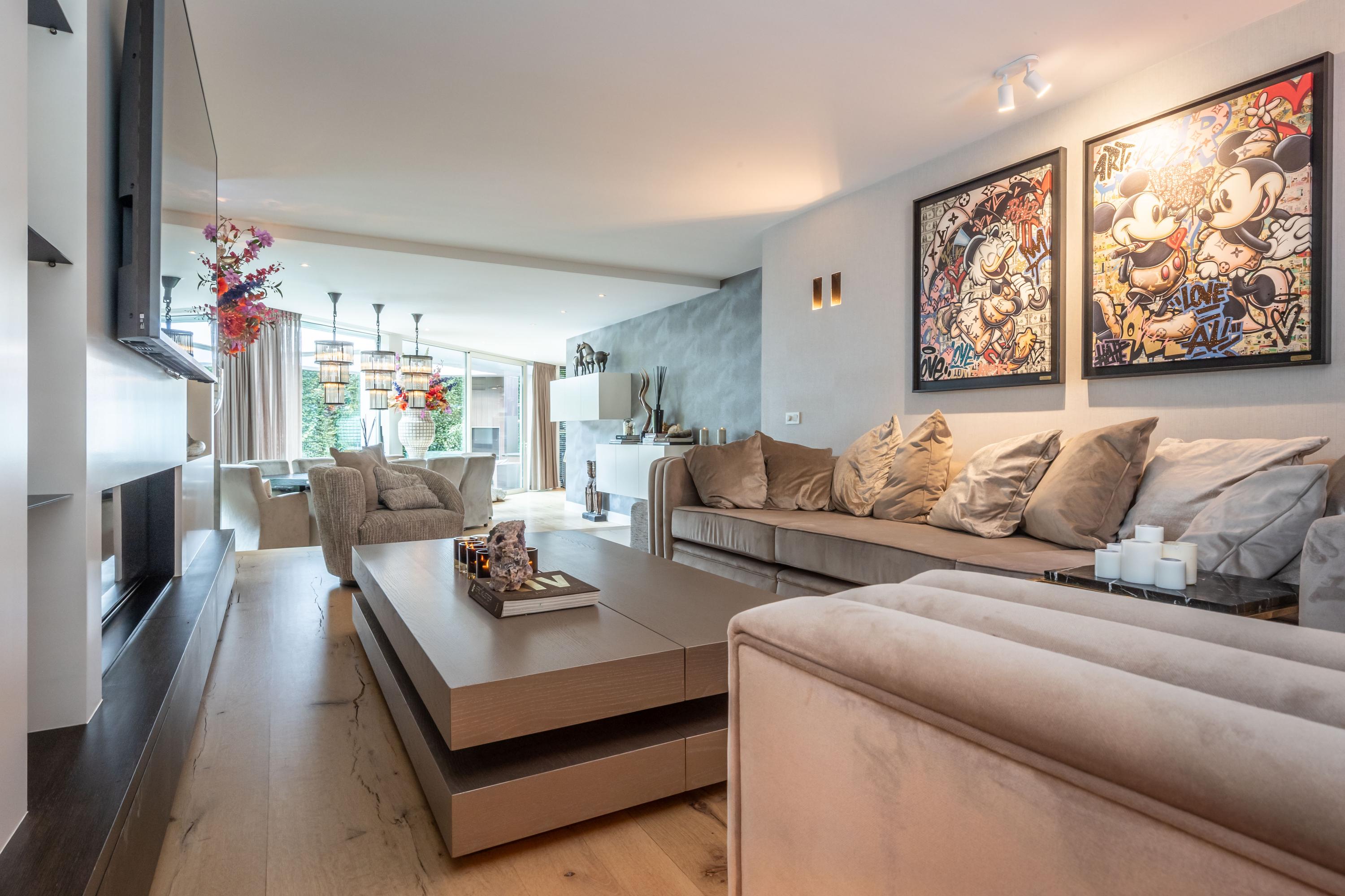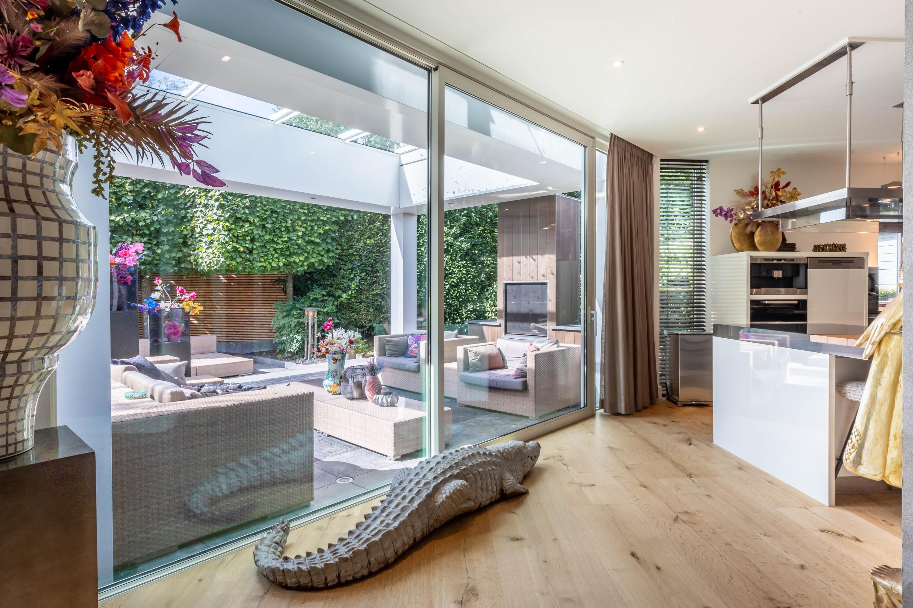 De living ademt rustige luxe, met een sfeervolle gashaard, maatwerkkasten en een geïntegreerde televisieopstelling. Grote raampartijen verbinden het interieur naadloos met de tuin; het lichtspel in huis is spectaculair.