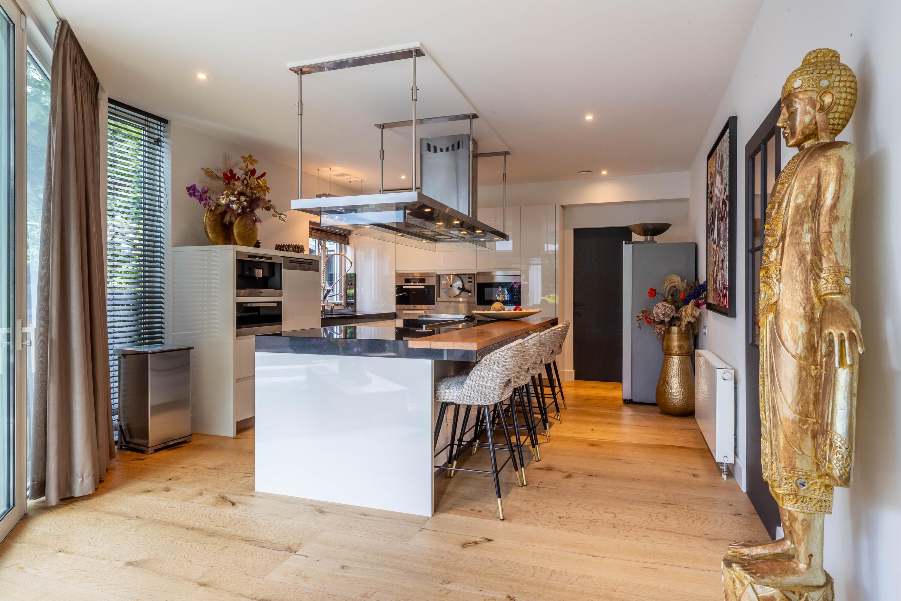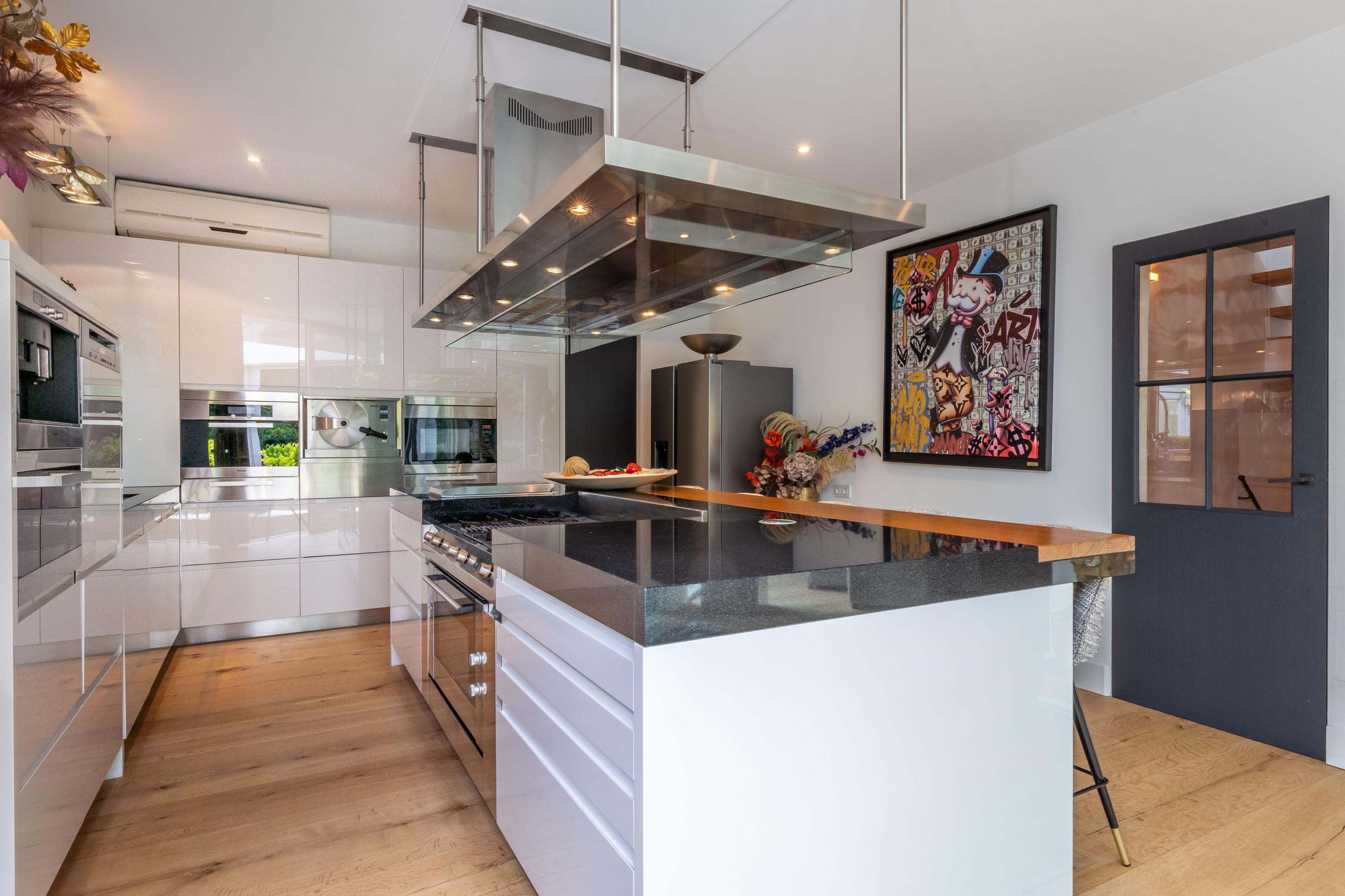 Het hart van het huis wordt gevormd door de ruime designkeuken van Arclinea met een granieten aanrechtbladen en een sculpturaal kookeiland met bar. Hierin is alle denkbare inbouwapparatuur: een vijf-pits kookplaat met wokbrander en een separate teppanyaki grill, een op maat gemaakt afzuigsysteem, een Quooker en een traditionele kraan, koffiemachine, 2 warmhoudlades, een bordenwarmer, vaatwasser op hoogte, een magnetron, combi-stoomoven en een hogedrukstoomoven. Alles is ontworpen om koken tot een verfijnde belevenis te maken.